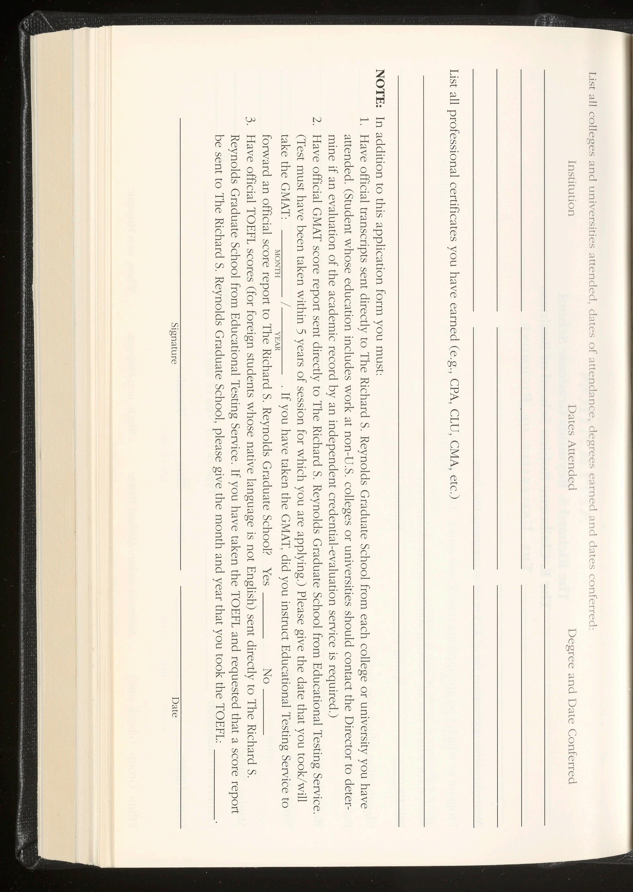 Officia l d oc um e nt s ve rifying co llege and u n ive rsity wo r k and te st s c or es must be se nt from th e instituti o n or ag e n cy responsibl e for th e informati o n d irec tly to The Rich a rd S. Re yno lds Grad u ate Sch ool.