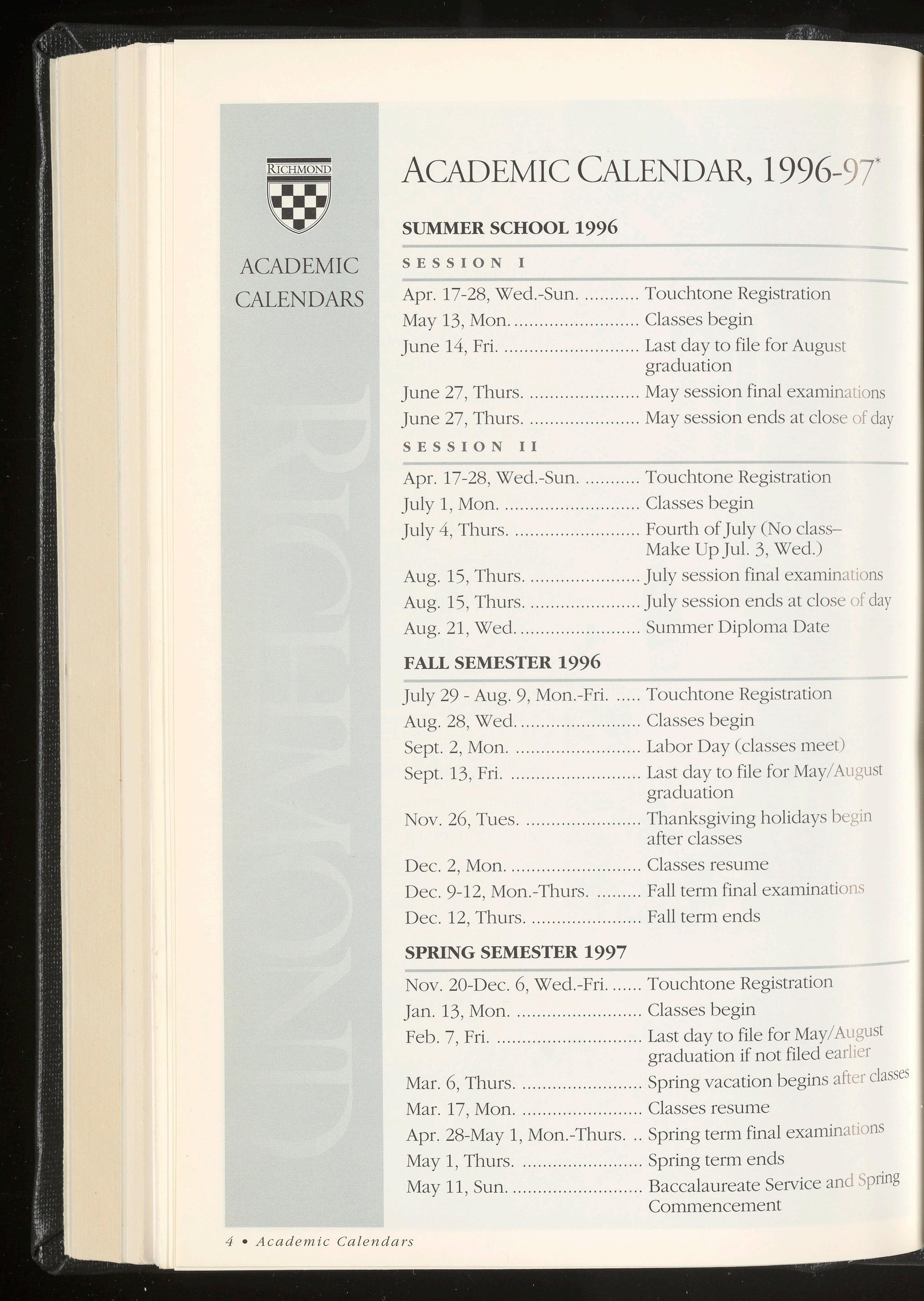 'Each tenn the Registrar publi s h e s a deta iled acad e mi c c alendar to inform th e Universitycom •1unity of time sc hedules and d e ad lines. Dat e s ar e subject to chang e