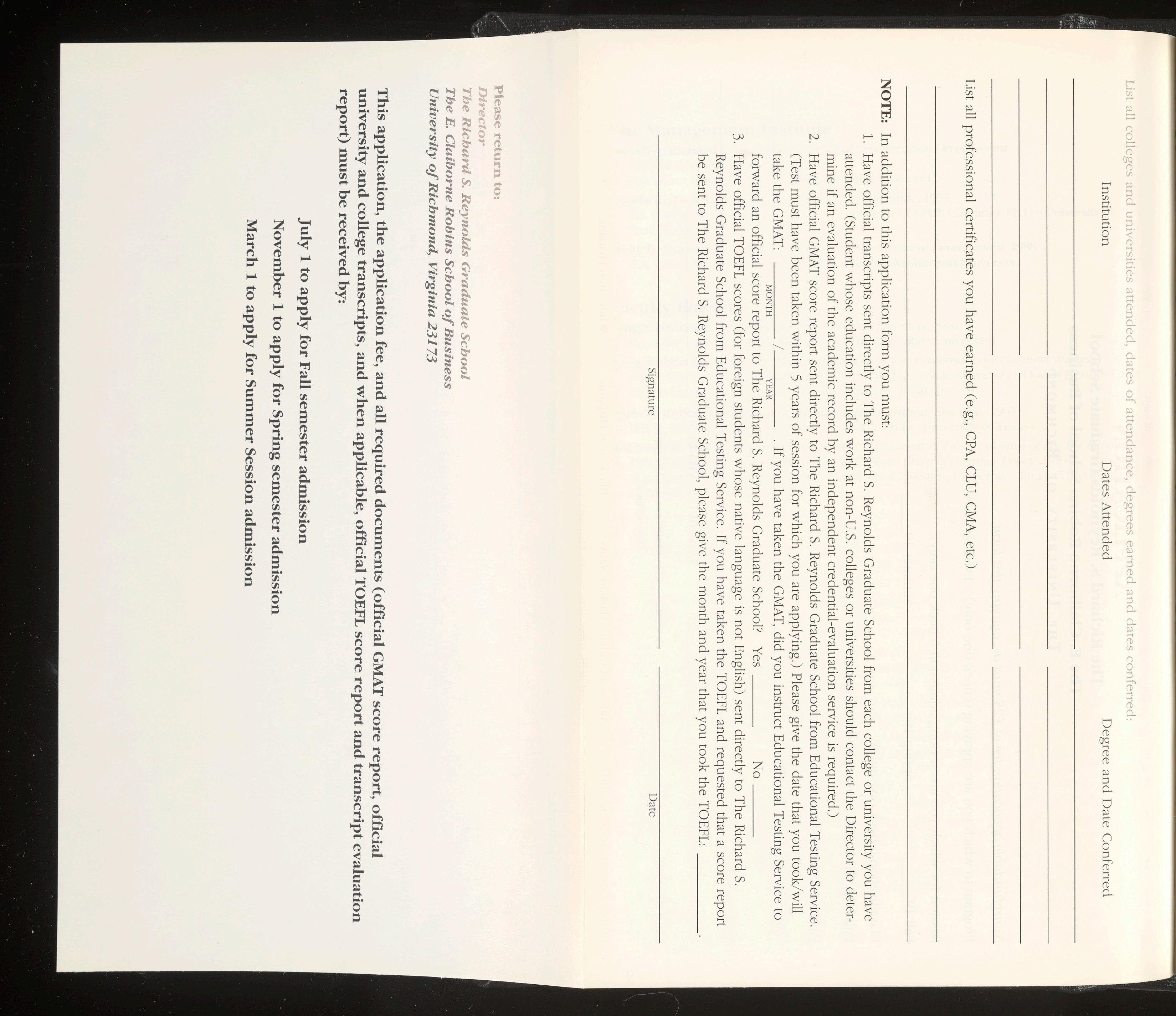 Stud e nt s are admitt e d for th e fall, spring, and s u mm e r s emest e rs All appli cation mate rials must be in Th e Richard S. Rey no lds Graduate School Office by July 1, Nove mber 1, or March 1 in order to be co ns idered for the upcoming s em es ter .