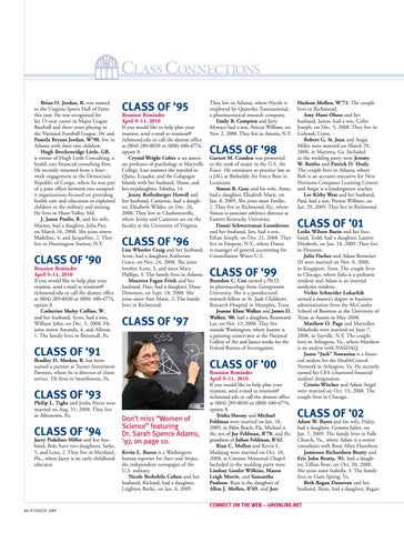 Reunion Reminder April 9–11, 2010 If you would like to help plan your reunion, send e-mail to reunion@ richmond.edu or call the alumni office at (804) 289-8030 or (800) 480-4774, option 8. Catherine Shelsy Collins, W, and her husband, Scott, had a son, William John, on Dec. 5, 2008. He joins sisters Amanda, 4, and Allison, 1. The family lives in Broomall, Pa.