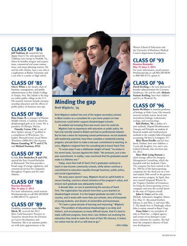 Minding the gap Brett Wigdortz, ’95 Brett Wigdortz walked into one of the largest secondary schools in West London as a consultant for a pro bono project on how businesses could better support disadvantaged schools. He walked out knowing there was much more he could do. Wigdortz had no experience with education or public policy. He had only recently moved to Britain and had no professional network. But he had a vision for improving school performance: recruit students with leadership potential, have them complete a residential training program, and ask them to make a two-year commitment to teaching. In 2002, Wigdortz resigned from his consulting job to found Teach First. “In some ways it was a deliberate sleight of hand,” he writes in his recent book, Success Against the Odds. “No pressure, just a twoyear commitment. In reality, I was convinced that the graduates would make it a lifetime one.” Today, more than half of Teach First’s graduates continue to teach in low-income community schools, while others continue a commitment to education equality through business, public policy, and social organizations. The early years weren’t easy. Wigdortz faced an uphill battle to secure funding, convince school ministers of the program’s value, and ensure each graduate was adequately trained. A decade later, no one is questioning the success of Teach First. The organization has placed more than 4,000 teachers in disadvantaged schools. It is the largest graduate recruiter in the country, and it works with more than 500 schools, tens of thousands of young students, and dozens of universities and businesses. “It’s been a great decade of learning and improving,” Wigdortz says. “The problem of educational disadvantage is so deep and historic, and encompasses so many difficult issues, that it’s hard to make sufficient progress. Every time I see children not receiving the education they need to make the most of their life chances, it makes me realize how far all of us still have to go.” —Kim Catley
