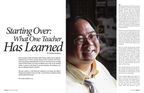 rying to get back to the life he knew was not possible, he would learn. But Chang, who did eventually return to Ursinus and graduate, has, in some ways, surpassed that life. Professor Chang, fully confined to a wheelchair and assisted by two student aides, returned to visit Ursinus this spring. He noticed right away how easy it is to move around campus in his wheelchair. As a student, his classes had to be on the first floors of buildings because most of them had no elevators. There were no automated doors. To enable him to attend the 1990 Baccalaureate service, a small lift was attached on the back of Bomberger Hall. While he never did attend medical school, he earned a Ph.D. in psychology and today is on the faculty at East Stroudsburg University. What Chang has surmounted during the years since his accident have taught him that isolation from interpersonal relations can be more limiting than a physical disability itself. Like the butterflies he collects, he has evolved into a different and stronger version of himself. After the accident Chang spent five months in the University of Maryland Trauma Center and Jefferson Hospital, and five months at his parents’ home in Walnutport, Pa. He had expected to return to Ursinus, but the administration refused, saying the campus was not prepared to handle a tetraplegic student who needed extensive assistance. He cringes recalling the reaction of his parents who were devastated and scared. “It was one of the first times I had seen my father cry,” says Chang. After repeated requests and some intervention by faculty and staff, especially the college Chaplain, the administration relented. “They said that if I couldn’t handle it, I would [have to] move on,” says Chang. Former College Chaplain Scott Landis, now pastor of Mission Hills United Church of Christ in San Diego, Calif., helped him to handle the transition. “As college chaplain I saw this as a justice and pastoral care issue and insisted we give it a try,” Landis recalls. “When John returned, I have to