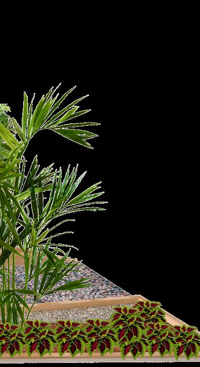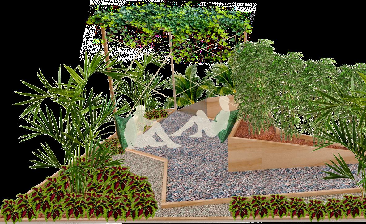 Tropical vegetation was chosen to create a lush environment with leafy plants that offer privacy and a sense of disconnection from the work area. These plants also evoke the feeling of being surrounded by nature.