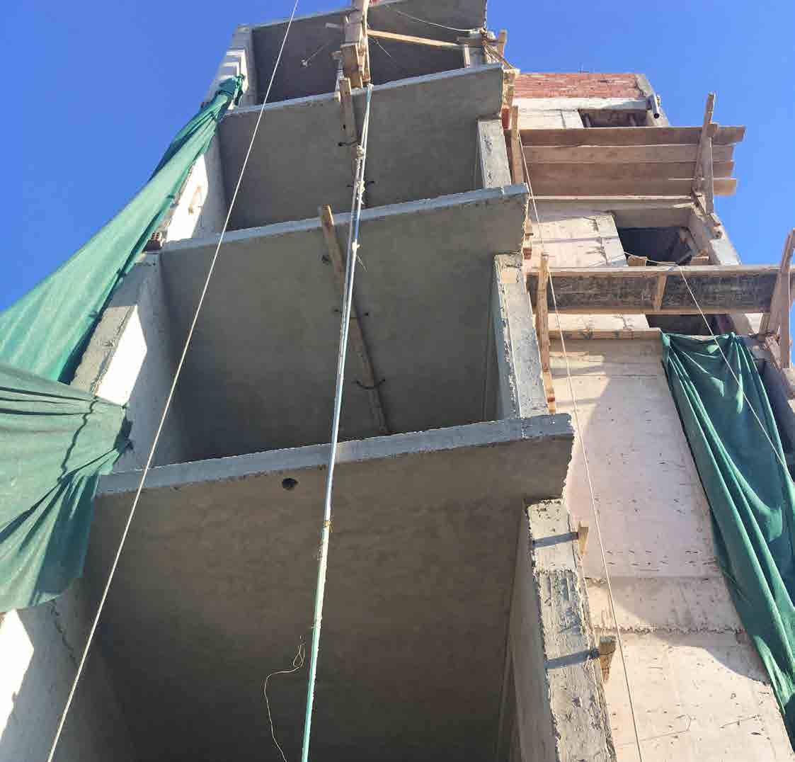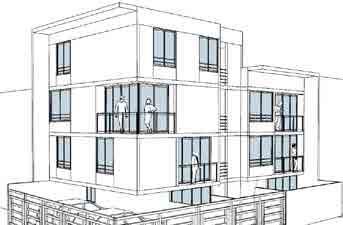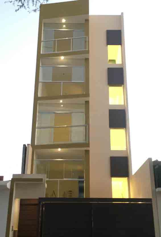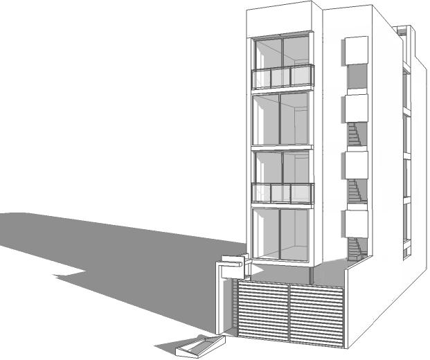 Functionally, the project is a fivestory building comprising four flats of 90 m² each, one duplex of 180 m², and three garages. Architecturally, it is a slender structure, reflecting the narrow dimensions of the plot on which it was developed. Regarding the design, the facade incorporates a play of solid and void elements, utilizing concrete plates and translucent windows. To break the linear progression of the architecture, slight variations were introduced in