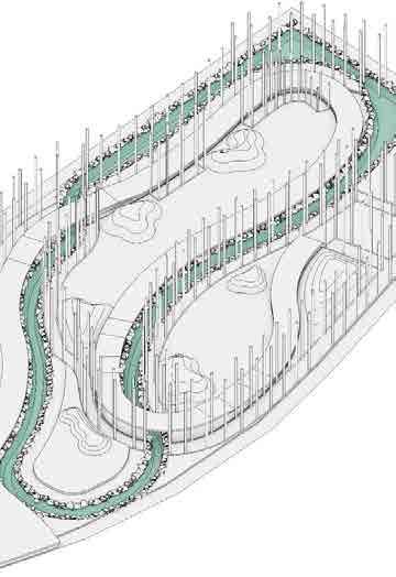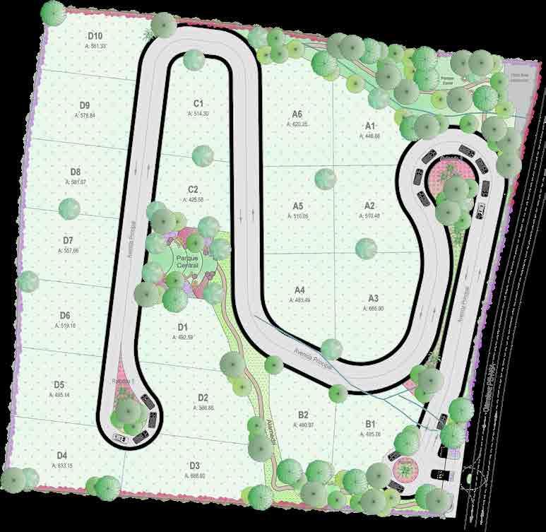 tral park, and a recreational park. These spaces are interconnected through elements such as pathways and vegetation, enhancing both the functional and aesthetic quality of the pedestrian experience. Based on these principles, the project resulted in 20 plots ranging from 450 m² to 600 m², intended for future country homes.