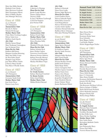 Class of 1956 $3,175 Donated 47% Participation Annunciation Club Beverly A. Habrat Yolanda M. Krueger Mother Marie Club Claire Marie Foecking Langkau Helene Sasko Love Kathleen Sands Spacht 1871 Club Marilyn Siemer Berger Mary Trenkamp Cunningham Sara St.Antoine Frier Fleur-De-Lis Club Kathleen Bell Aman Margaret Lenehan Bruening Mary Ann Tobbe Centa Dr. Rita Perko Nassif Margaret Lang Nelson Jean Marie White Onufer J. Patricia Music Rohde Rita Marie O’Reilly Strube