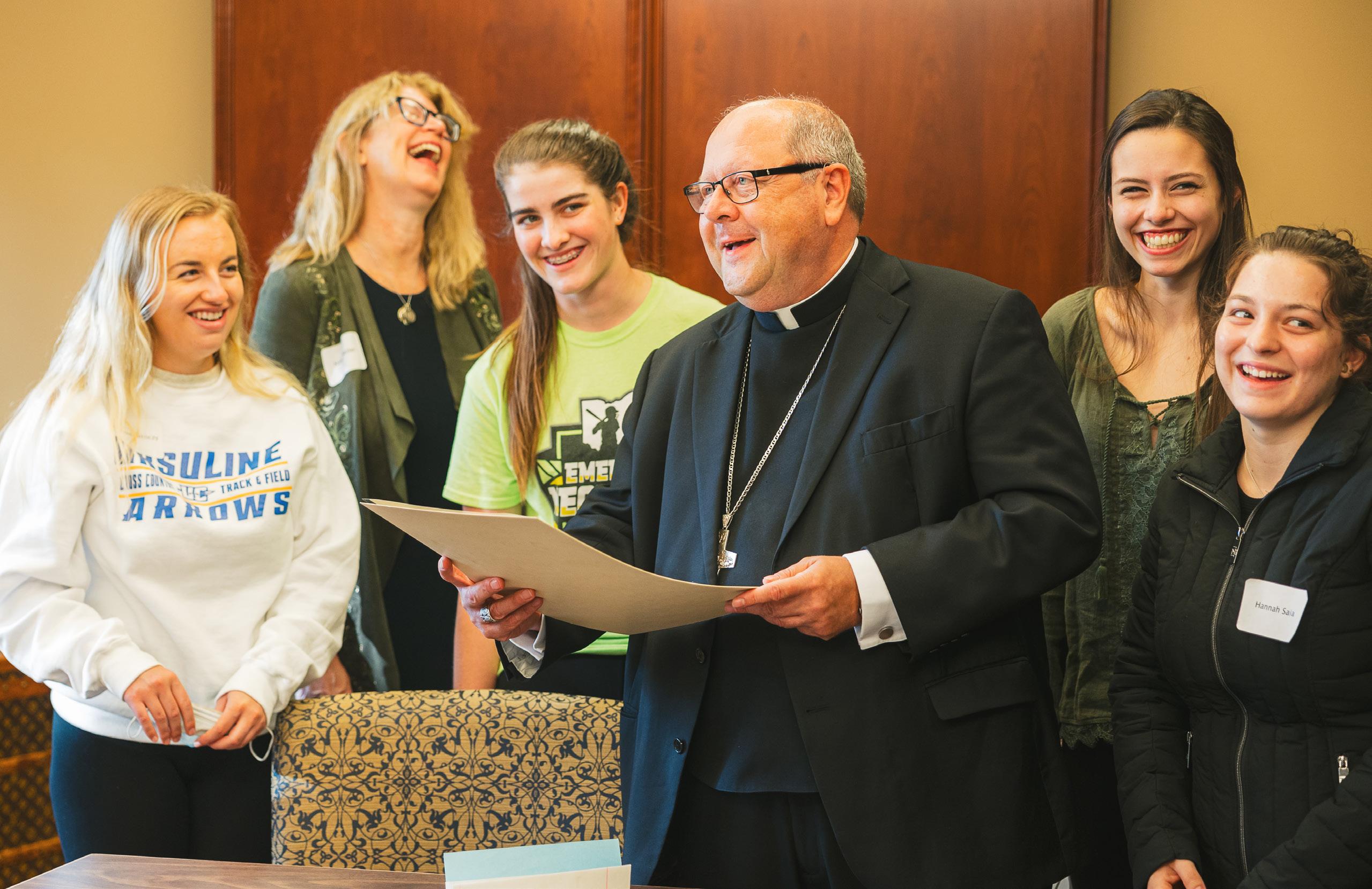 Bishop Malesic shares a laugh and a smile with student leaders while they examine the Ursuline College charter from 1871.