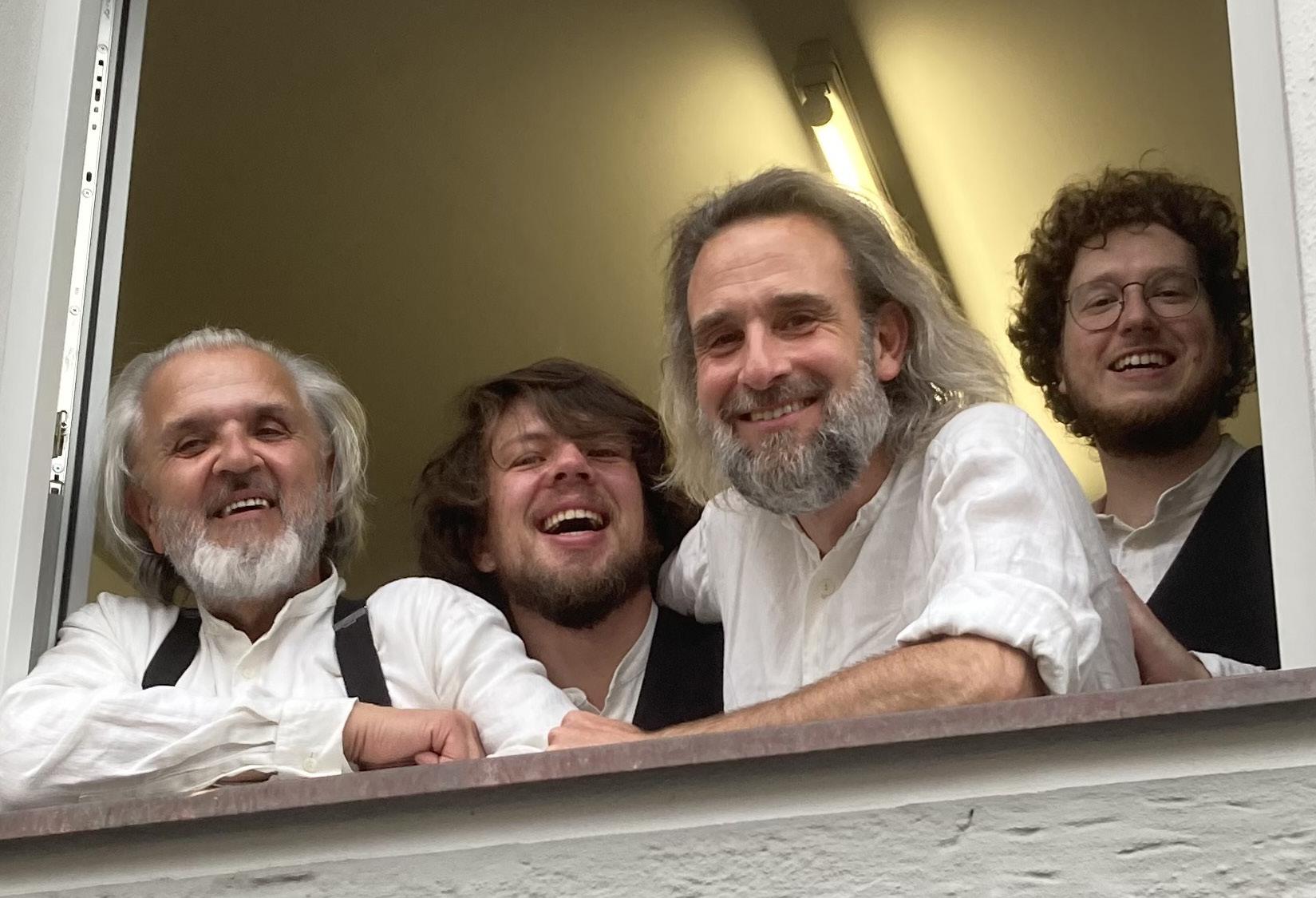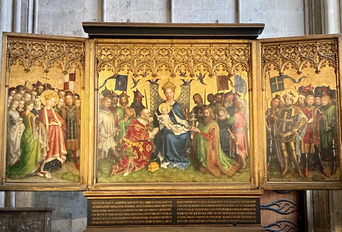 (Clockwise, left) The Basilica of Saint Ursula shines in the morning light.Three Ursuline sisters, Sr. Gretchen Rodenfels, Sr. Christine De Vinne, and Sr. Virginia DeVinne, gather before the statue of their order’s patron saint. Actors from the Oberammergau Passion play catch a breath of fresh air during intermission. A retable, of the City of Cologne’s patronal saints shows St. Ursula on the left and St. Gereon on the right. The painting has adorned the Cathedral’s side altar since it was completed in 1440.