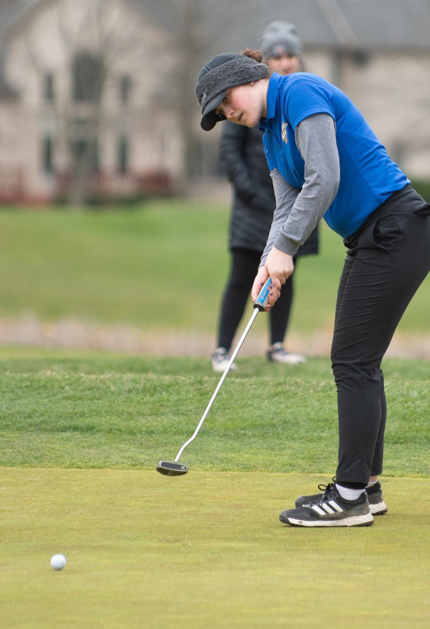 (Left) Lucille Petkac tees off on her way to her drive to the Elite 25 Award for highest GPA in the G-MAC in her sport, while the Arrows basketball team, below, enjoy the second highest GPA in all of the NCAA Division II women’s basketball.