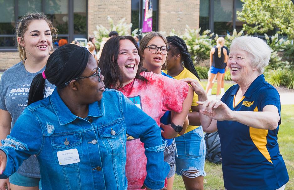 Sister Christine De Vinne, OSU, PhD, ’70 has lead Ursuline College since 2015. One of her favorite times of year is late summer when new students arrive. Left, she joins the festivities during Orientation Week.