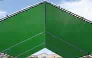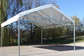 3” x 3” Sq. 12 ga. vertical posts with 7” x 7” base plates in 20’ x 20’ blocks (up to 100’ feet long), expansion anchor bolts, 20’ galvanized truss members, 12 oz. polyethylene fabric with a 15-year warranty (Available in white, blue, grey, tan, red, and green.) Tensioning ratchets, strapping, and setup manual provided.