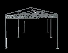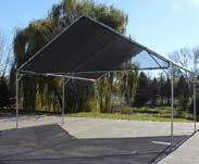 3” x 3” Sq. 12 ga. vertical posts with 7” x 7” base plates in 20’ x 20’ blocks, expansion anchor bolts, 20’ galvanized truss members (5/12 roof pitch), knitted shade cloth with taped edges and grommets, 10” canopy ball bungee every 18”, fittings, hardware, and assembly instructions