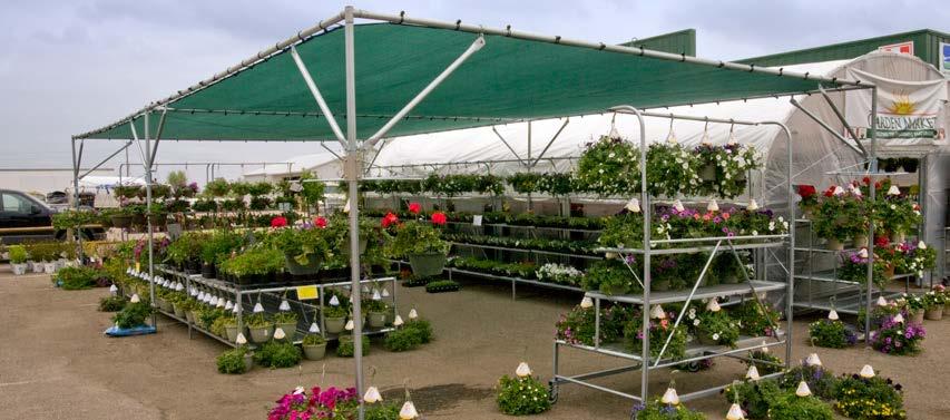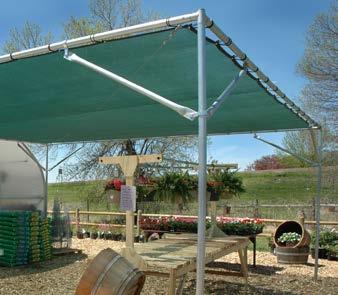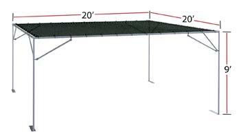 2” O.D. 14 ga. x 9’ vertical posts with extended base plates in 20’ x 20’ blocks, 2” O.D. 14 ga. x 20’ galvanized horizontal members, 60% black knitted shade cloth with taped edges and grommets, 10” canopy ball bungee every 18”, fittings, hardware, and assembly instructions.