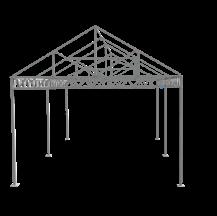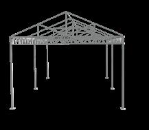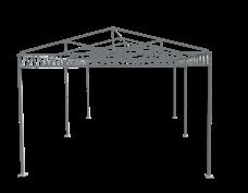 3” x 3” Sq. 12 ga. vertical posts with 7” x 7” base plates in 20’ x 20’ blocks, expansion anchor bolts, 20’ galvanized truss members (5/12 roof pitch), knitted shade cloth with taped edges and grommets, 10” canopy ball bungee every 18”, fittings, hardware, and assembly instructions