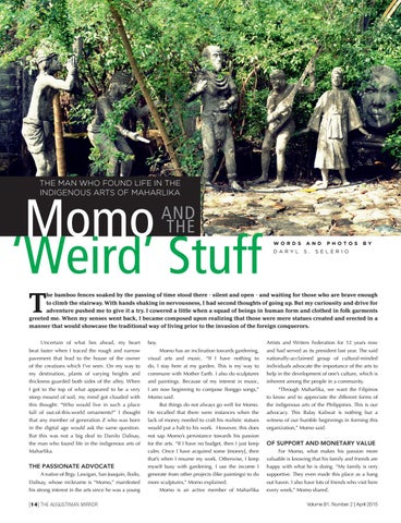 Of Support and Monetary Value For Momo, what makes his passion more valuable is knowing that his family and friends are happy with what he is doing. “My family is very supportive. They even made this place as a hang out haven. I also have lots of friends who visit here every week,” Momo shared. Volume 81, Number 2 | April 2015