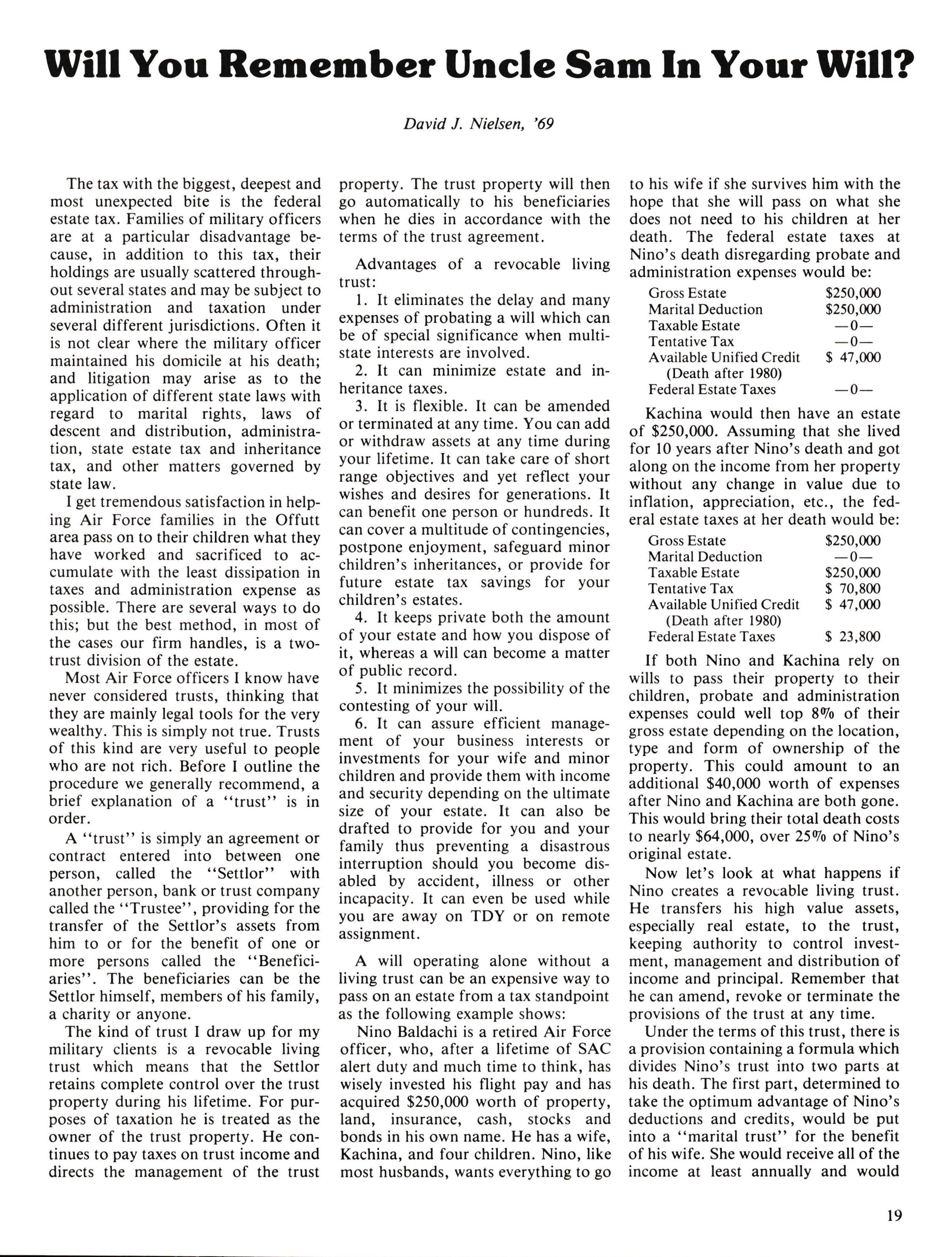 Working Stiffs: Randy KEHL is still defending Minot as a stanboard evaluator. Charles PINNEY is in the Aircraft Compatibility Branch of the Air Force Armament lab at Eglin AFB. Jeff (Leon) LAWRENCE is flying Cobras at Fort Ord, CA. He recently married Deniese. That makes him the first of five confirmed bachelors from CS-30 to tie the knot. Greg BOOMGAARD says he’s one of the four remaining die-hards.