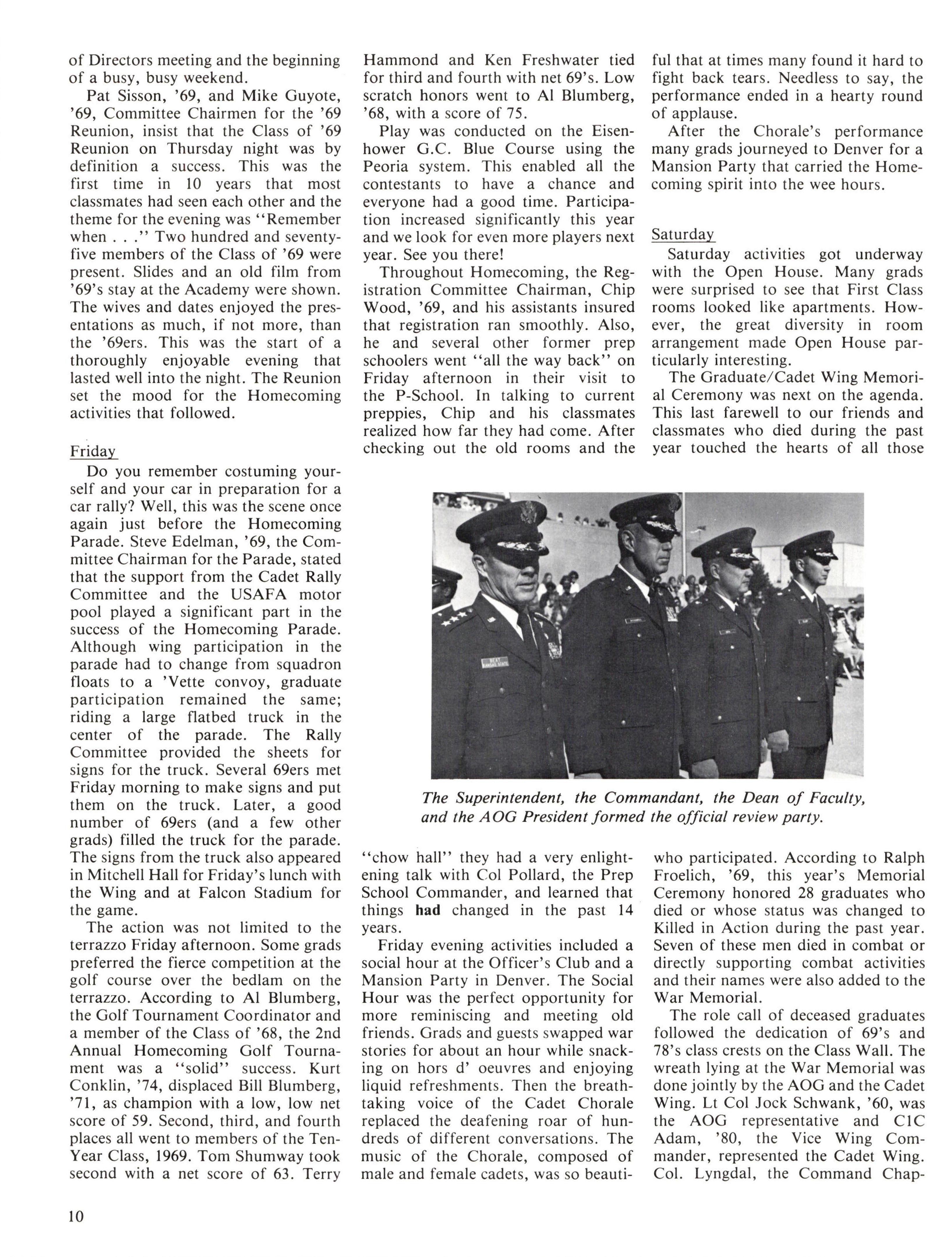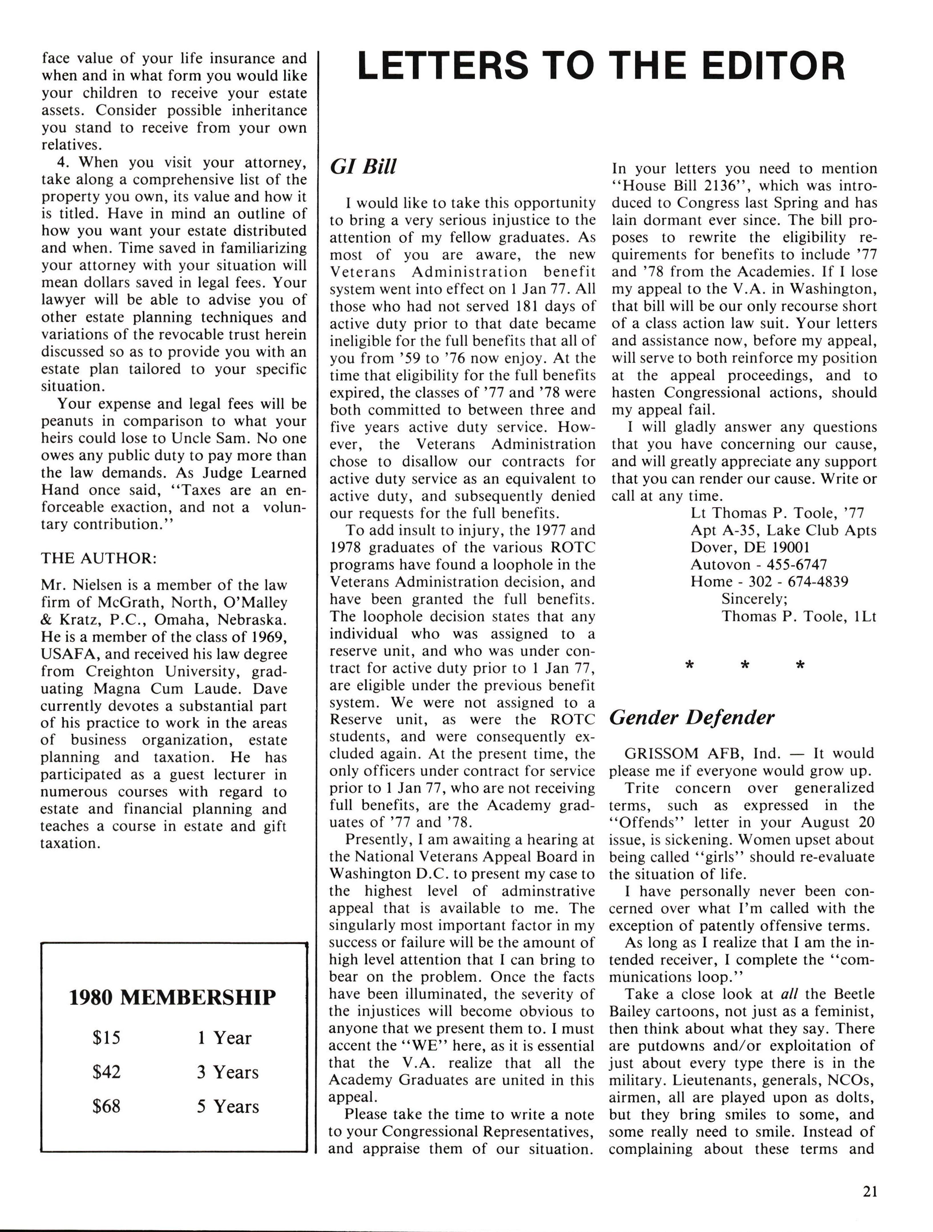 Men of Letters: I got a ton of mail this time around, my thanks to all you budding young authors out there. Bob SOUCY reports that Tom LANE and Zach BAILEY put on quite a show for the low-level controllers in Korea on their last C-130 deployment. Sounds like Bob has seen half the Class while he’s been at Clark. Jim MOSCHGAT says hello from Taigu, Korea, he’s engaged and plans to tie the knot next summer. Jim is in F-4’s, by the way, not Buffs as indicated in the Spring issue. Jim MCANULTY (Anna) is now in Berlin with ESC, and Rick and Kaoru TURNER had their first child, a girl, in September. Rick NEWTON (Kathy) says hi to all, he’s flying Jolly Greens at Osan. Bob SIMMONS is planning to open a microcomputer business along with Ron STRICH, I guess we’ll be able to count on him, now. Mike WEINSTEIN is going to McGeorge Law School under the AF Excess Leave program, he reports that the work is tough. Good luck, Mike. Tony DRONKERS is hanging in there up at KI, hope this winter isn’t as bad as the last one, Tony. Steve WITTMAN (Betsy), who likes to rub it in, writes to say that his pool will be put in soon, just what I need to hear in October. Steve and Betsy are now the parents of a baby boy, congrats Heavy. Bob ZAEHRINGER says that his A-10 unit isn’t doing much flying out of RAF Woodbridge, but that he is getting to see a lot of Germany. And J.V. SIMONS is in maintenance at Camp New Amsterdam, in Holland, he’d like Louis LEBLANC and Frank PINEIRO to get a hold of him. KUDOS: Ron STRITCH was named Air Force “Data Processing Officer of the Year”, our congratulations, Ron, keep up the good work.