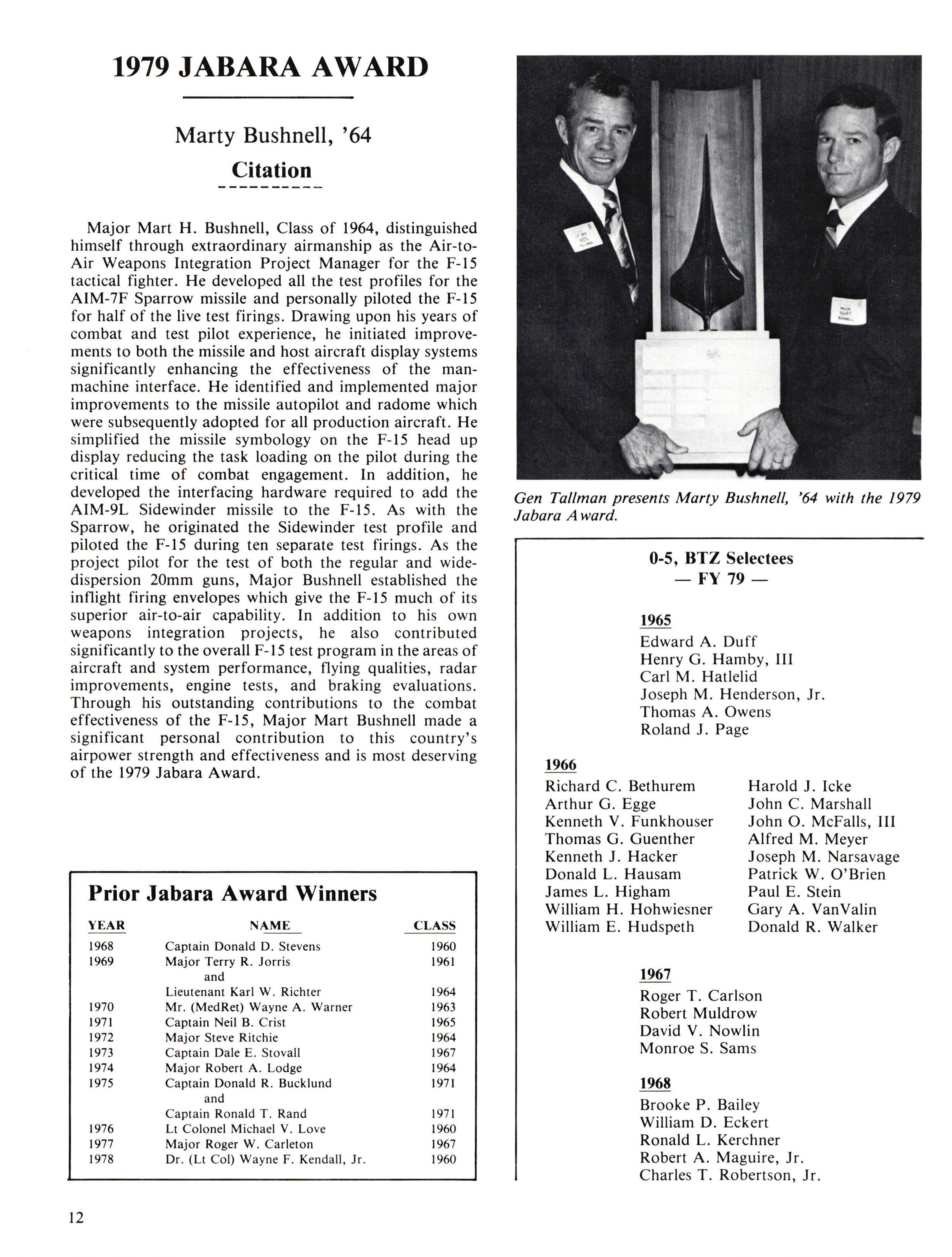 T-38: Steve BABCOCK, Jose BRAVO, Bruce CONARD, Dave DERAS, Joe MUDD, Jeff SNOY (Reese); Digger PHELPS, Bob ANDERLITCH, Paul MC VINNEY (Laughlin); Wayne FORD, Ken PRUSAK, Bob SLIZESKI, Keith WILKINSON (Vance); and Dean PROFFITT to Sheppard. T-37: T. J. BRONDER, Barry REUSCHE (Reese); Morgan LANKFORD, Mike MC DONALD (Mather); John ISLIN, Lanny MC NEELY, Doug TREADWAY (Laughlin); Tim BRAY, Bill CLINTON, Matt LACOURSE, John SWARSBROOK, Pete WHEBLE (Vance). F-4: Art HARRISON, Dan PHILLIPS, Mike SNODGRASS, Gary MEISER (Luke); Art MOYE, Chris FLOOD, Greg CARSON, Wayne KELLENBENCE (George); Kent BOUDREAU, John ALBERT (MacDill). RF-4: Mike FOSTER (Kadena). F-15: Mack MC COLLUM, Greg CLASEN (Eglin); Randy READ (Japan). F-lll: Jim STEWART (Upper Heyford). A-10: Mark POZYCKI (Bentwaters). C-130: Tom PRODANOVICH (Dyess), Stu TAKAHARA (Clark), Mike JABLONOVSKY (Germany), Todd CIENSKI (Pope). 0-2: Pete ZINK (Canal Zone). C-141: Dennis KELLY, Jeff BRAKE, Kolin LESTER (Norton), Mark KELLY (Charleston). KCS-135: Doug BORTER, Dan PARSONS (Travis); Chip BRUMGARD, Bob IRELAND (Carlswell); Delos CARRIER (Grand Forks); Larry LARGENT (Plattsburg); Eddie PETRELLA (K.I. Sawyer); Jimmy RUBALCABA (Grissom); Dave MEEHAN (Fairchild); Bill WOMACK (Robbins). B-52: Russ KLINE (Wurtsmith); Craig BENDORF (Fairchild).