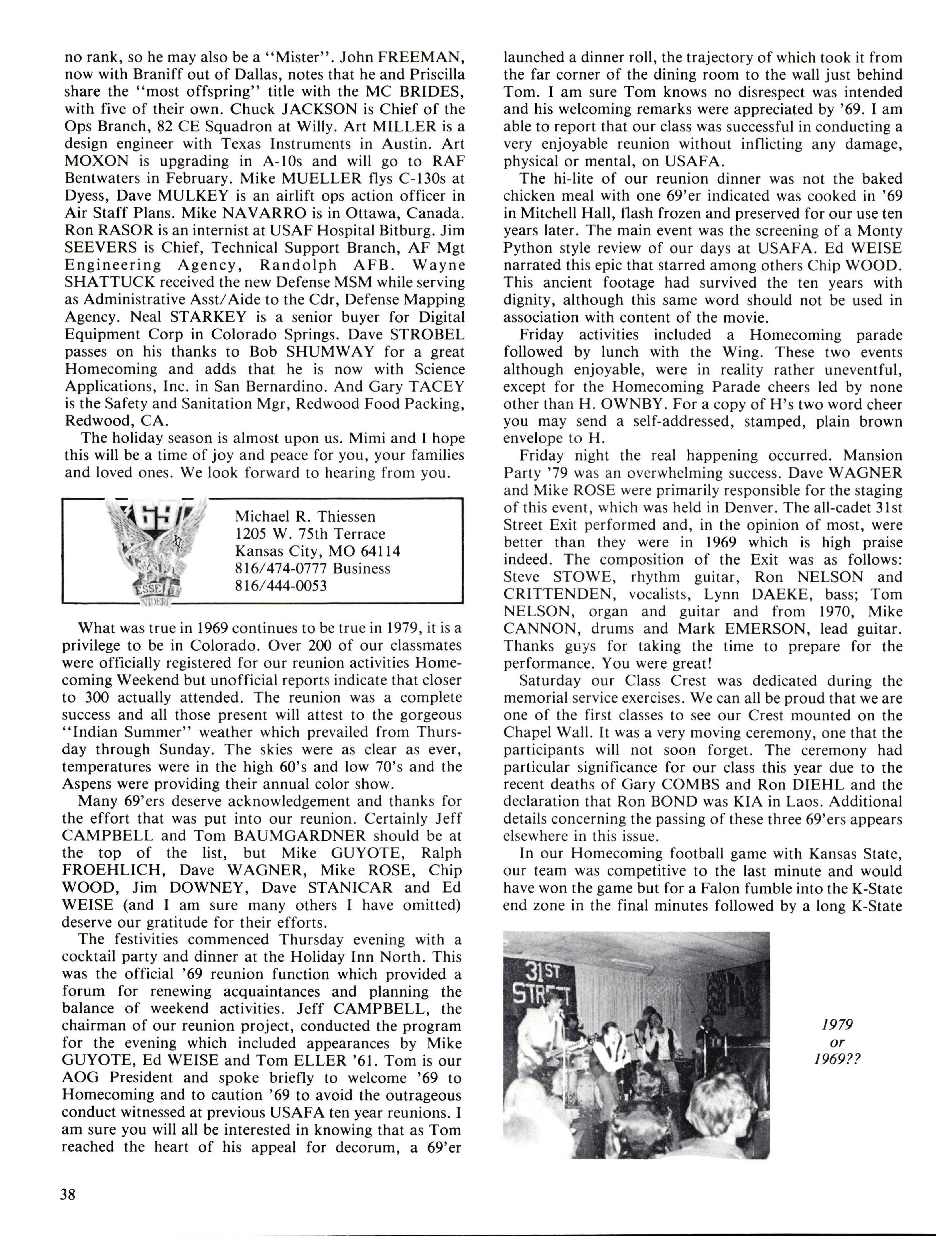 20-Year Reunion: Plans are moving ahead for next summer’s reunion in Colorado Springs. It will be 26 through 29 June at the Raintree Inn. We’ve already reserved rooms for you and your family make sure you have your calendars marked and summer plans in order. Our chairman, Tom BURKE (Andrews AFB AVT 856-6184), would like some feedback on agenda ideas. How would this be?