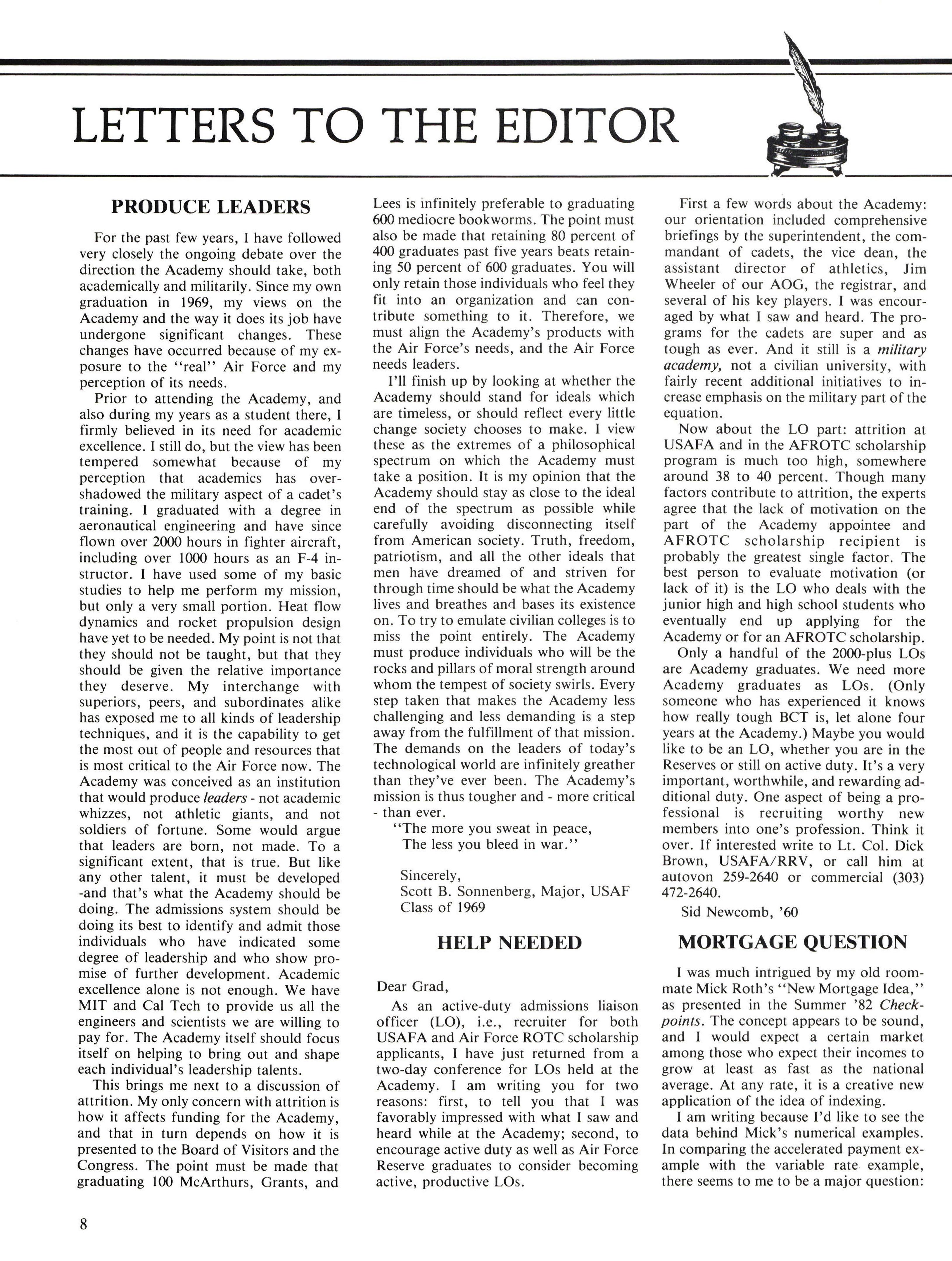 Annual Fund - The inauguration of the AOG Annual AFA Fund in the fall of 1982 was accomplished through a direct mailing in a colorful envelope designed to attract everyone’s attention. One of the handouts from that mailout is re-created in part on the back cover of this magazine. The theme for this year’s campaign is “Only you can provide the extra margin of excellence.” If each AOG member and graduate will reflect on the total experience he or she had as a cadet, it will be easy to remember the overall excellence of the total program; and, hopefully, we will all be willing to insure that the Academy experience will continue to be above that of any other institution. To do this in the contemporary context of austere defense budgets, it is necessary for appropriated funds to be supplemented by private funding. The AOG Board of Directors, in cooperation with the superintendent, will earmark these funds for worthwhile causes in furtherance of our commitment to excellence at USAFA. In future editions of Checkpoints the Annual Fund Committee will be making direct reports to the membership on how the annual fund monies are being utilized. If the experience gained at West Point and Annapolis can be transferred to our school, we can indeed all look forward to many worthwhile projects being funded through this AOG annual fund-raising effort.