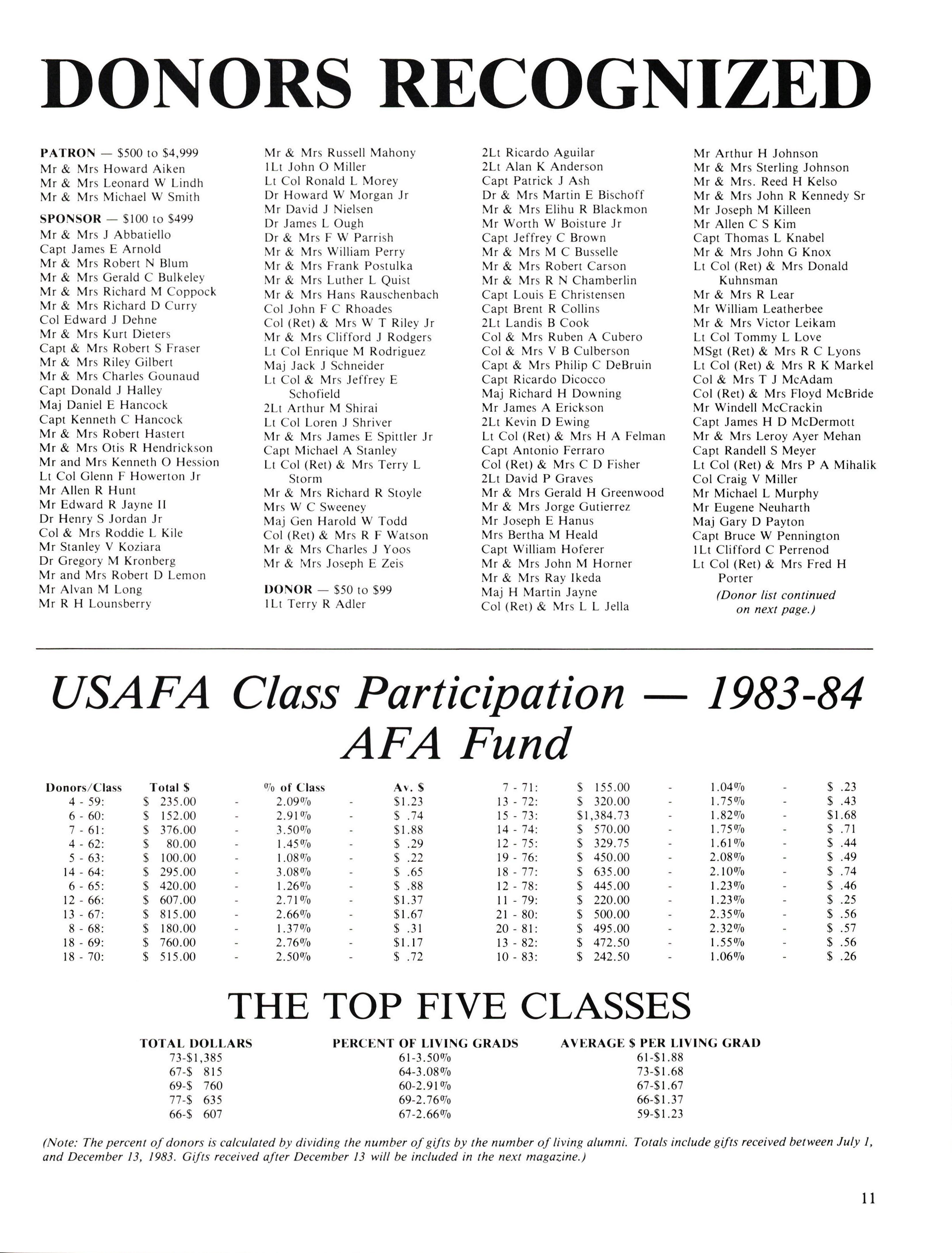 CHECKPOINTS is published quarterly by the Association of Graduates, USAFA Academy, Colorado Springs, CO 80840 and printed by Graphic Services of Colorado Springs. It is provided as part of an annual membership package which costs $20. Second-class postage paid at the USAF Academy, Colorado Springs, CO. Opinions expressed in this magazine are those of the authors. They do not necessarily reflect the opinions, policy or attitude of the Association of Graduates, its officers or the editorial staff. The appearance of advertisements in this publication does not constitute an endorsement by the Association of Graduates of the products or services advertised. Copyright © Association of Graduates of the United States Air Force Academy, Winter 1983-84.