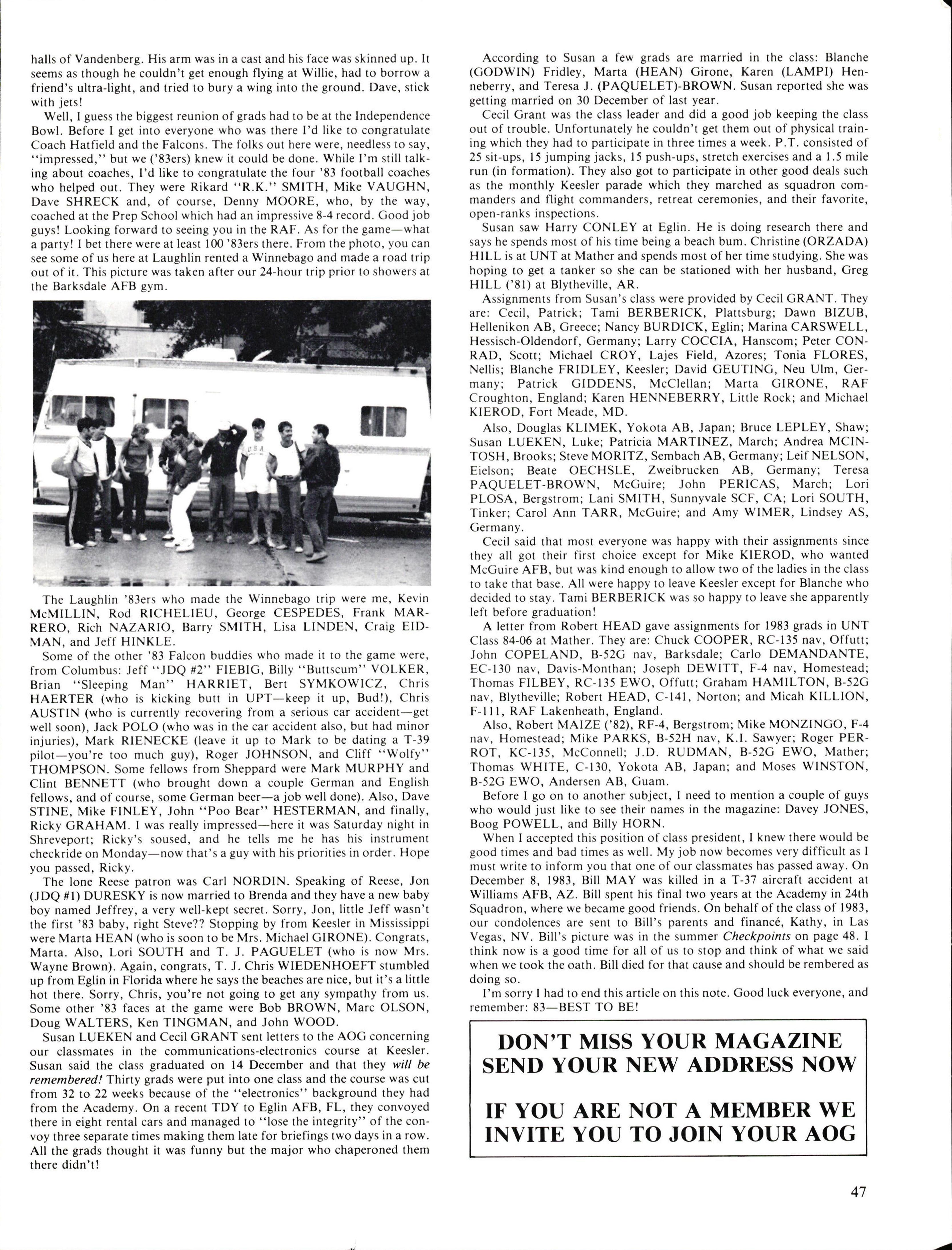 When I accepted this position of class president, I knew there would be good times and bad times as well. My job now becomes very difficult as I must write to inform you that one of our classmates has passed away. On December 8, 1983, Bill MAY was killed in a T-37 aircraft accident at Williams AFB, AZ. Bill spent his final two years at the Academy in 24th Squadron, where we became good friends. On behalf of the class of 1983, our condolences are sent to Bill’s parents and finance, Kathy, in Las Vegas, NV. Bill’s picture was in the summer Checkpoints on page 48. I think now is a good time for all of us to stop and think of what we said when we took the oath. Bill died for that cause and should be rembered as doing so.