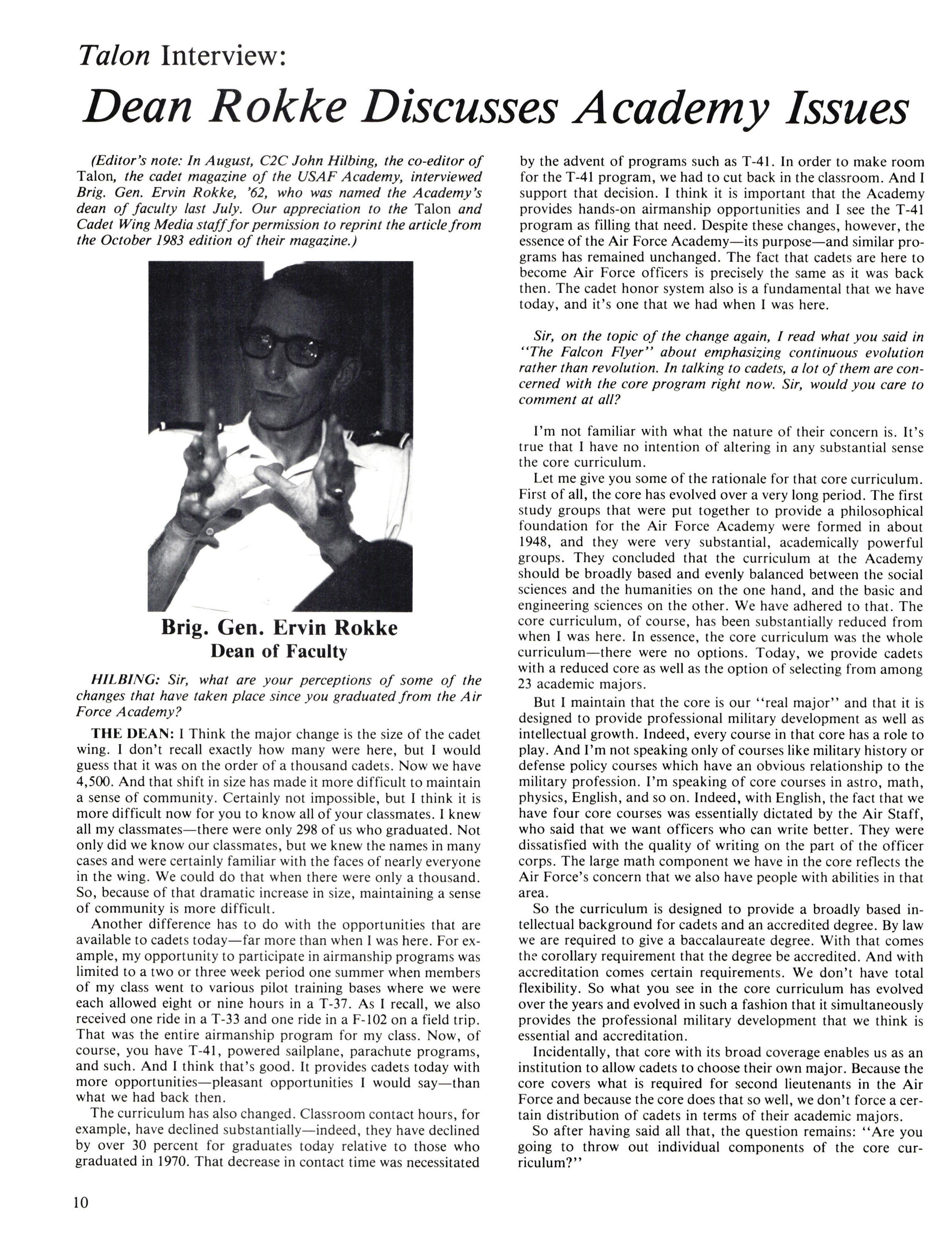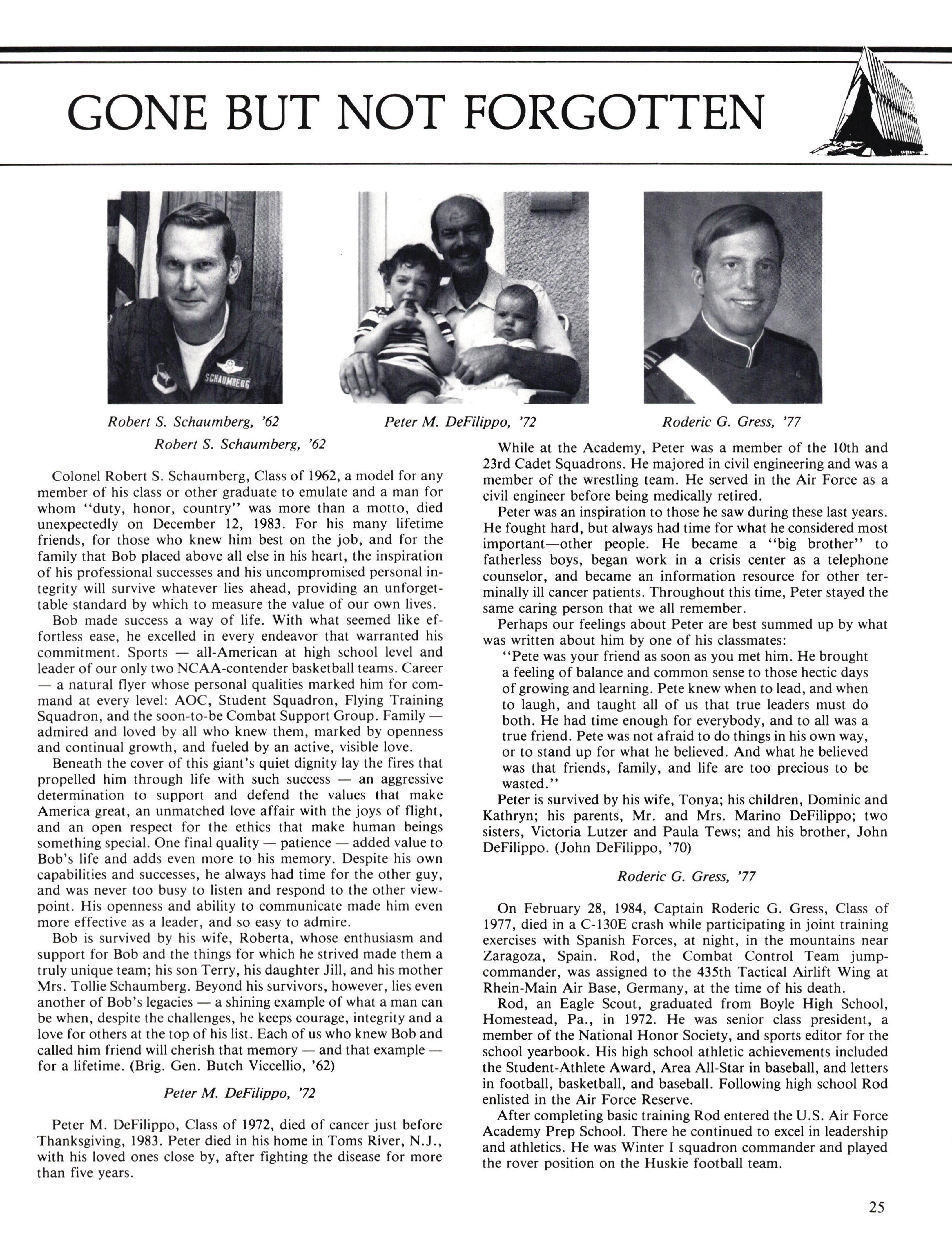 It was with considerable regret that your board of directors accepted the resignation of Jeff Schofield, ’67, as vice-chairman of the board of directors. Jeff was an extremely important member of the team and made the recent transition in AOG and Academy leadership much easier for all of us. Jeff worked long and hard on our long-range plan, and on current plans to make the organization more effective. He was a source of constant and consistent good advice throughout his term as vice-chairman. We wish him well in his new assignment at Grand Forks, and look forward to having Jeff, Anne and the boys back in Colorado soon.