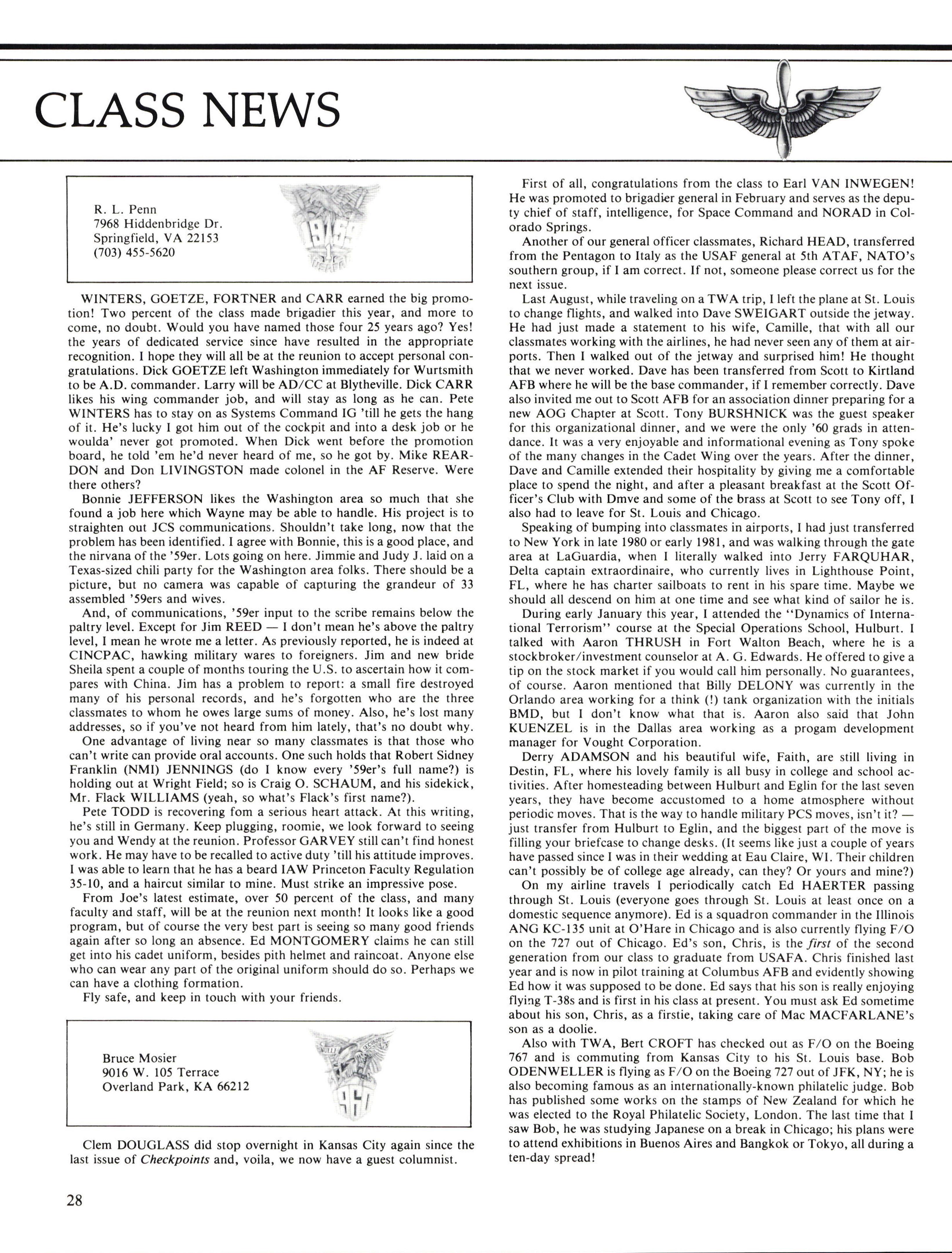 chanted Way, Del Rio, TX 78840. If worse comes to worse, just send whatever you have to Tom Kroboth, Checkpoints editor, care of the AOG, and he can get it to the right person. There now, you no longer have any excuse for not sending in your class news! The first batch of UPT assignments should be coming out soon, so please rush them to Ray as soon as possible.
