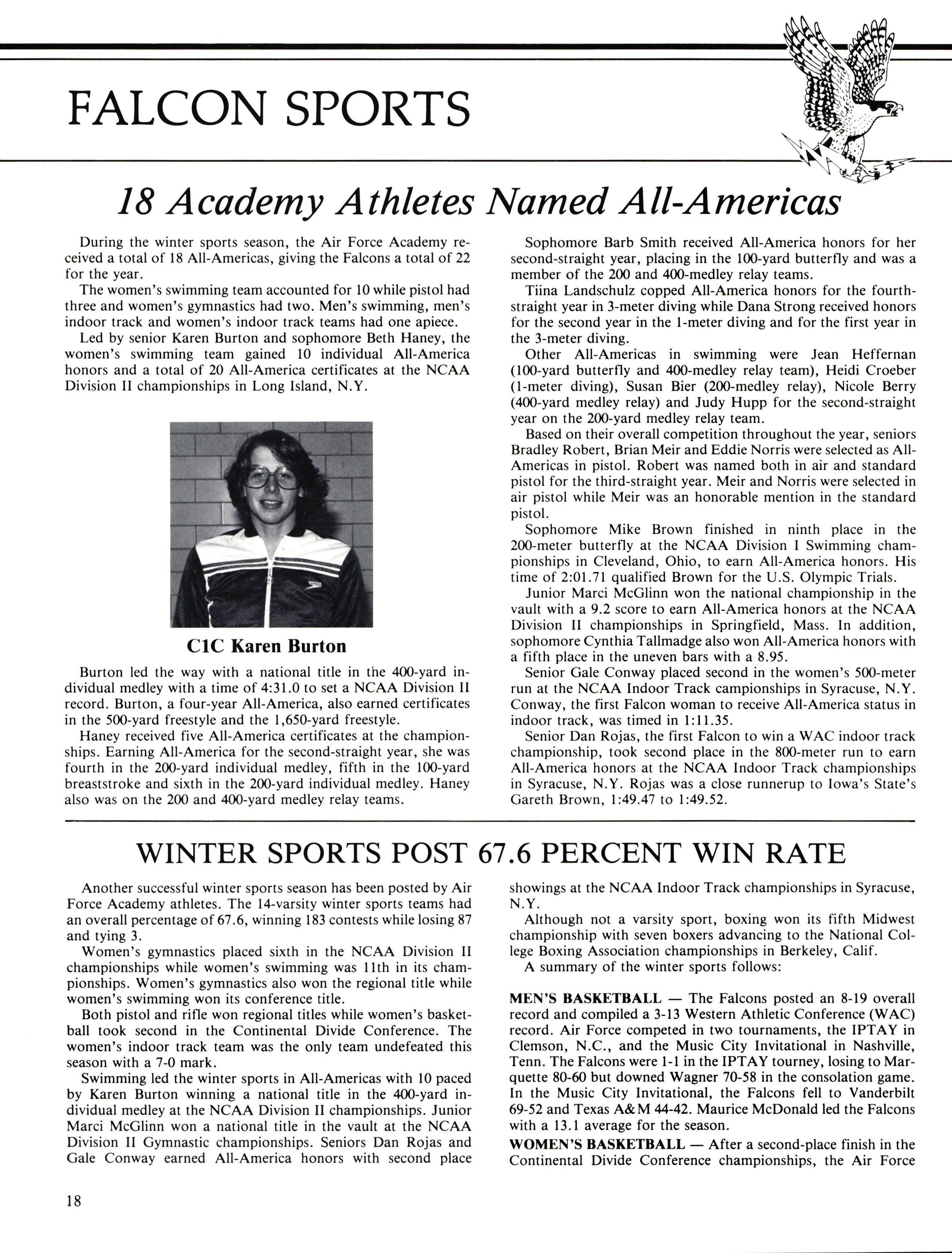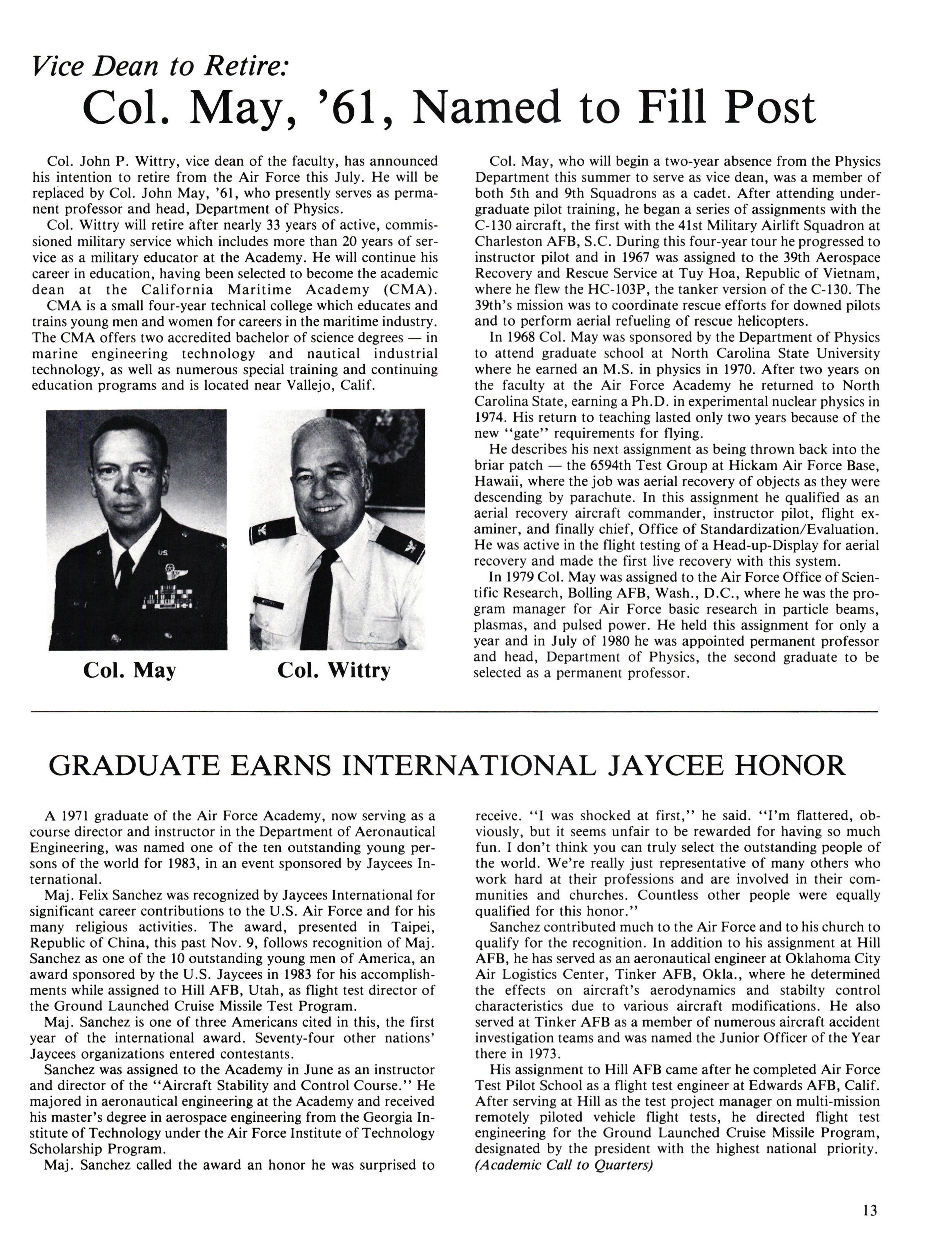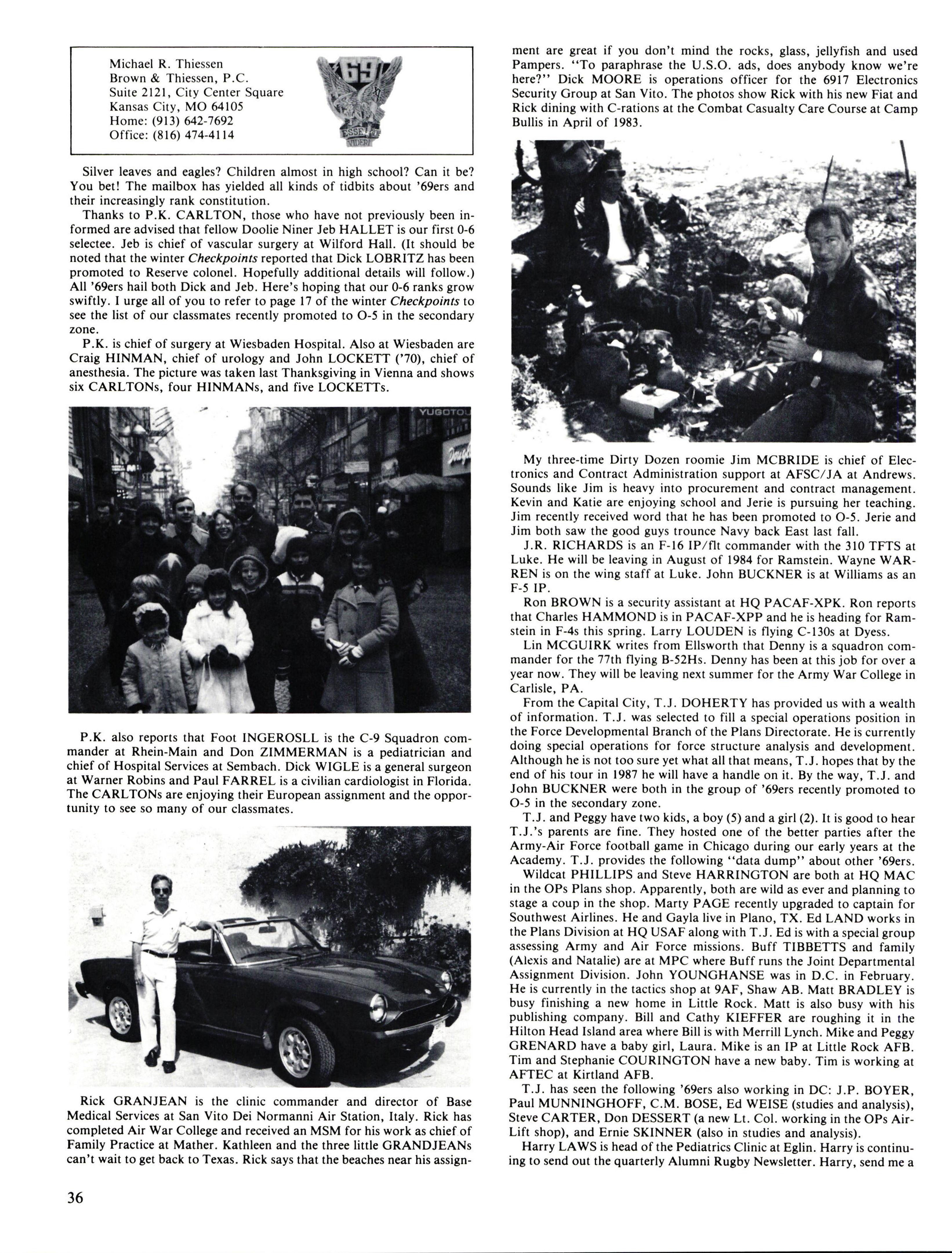 CHECKPOINTS is published quarterly by the Association of Graduates, USAF Academy, Colo. 80840 and printed by Graphic Services of Colorado Springs, Colo. It is provided as part of an annual membership package which costs $25. Second-class postage paid at the USAF Academy, Colo. Opinions expressed in this magazine are those of the authors. They do not necessarily reflect the opinions, policy or attitude of the Association of Graduates, its officers or the editorial staff. The appearance of advertisements in this publication does not constitute an endorsement by the Association of Graduates of the products or services advertised. Copyright © Association of Graduates of the United States Air Force Academy, Spring 1984.