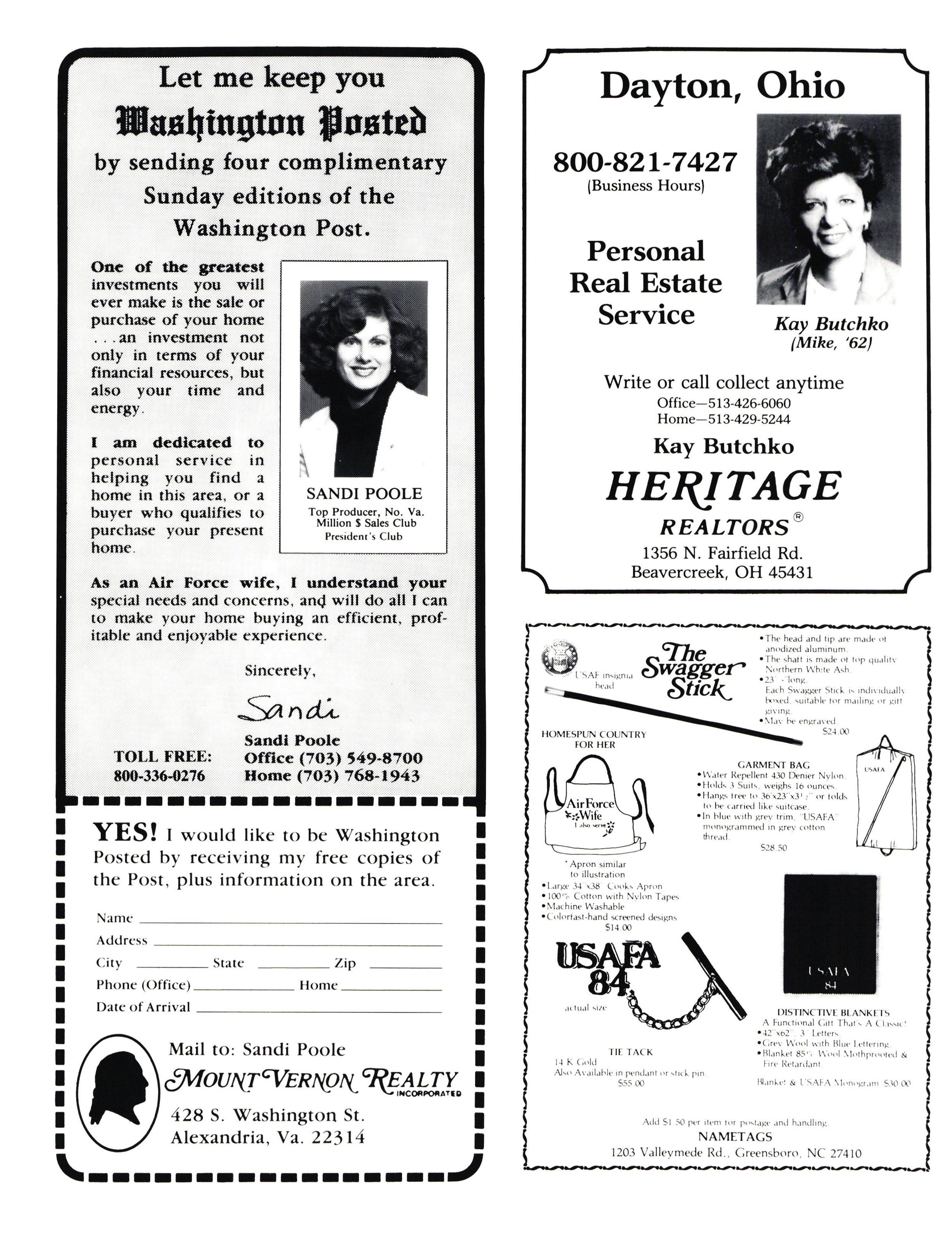 Let me keep you by sending four complimentary Sunday editions of the Washington Post. One of the greatest investments yon will ever make is the sale or purchase of your home an investment not only in terms of your financial resources, hut also your time and energy. I am dedicated to personal service in helping you find a home in this area, or a buyer who qualifies to purchase your present home As an Air Force wife, I understand your special needs and concerns, and will do all 1 can to make your home buying an efficient, profitable and enjoyable experience. Sincerely, Sandi Poole TOLL FREE: Office (703) 549-8700 800-336-0276 Home (703) 768-1943 YES! I would like to be Washington Posted by receiving my free copies of the Post, plus information on the area. Name Address City State Zip Phone (Office) Home Date of Arrival ft Mail to: Sandi Poole SMountWernon Realty v* iNCOflPOflATfD 428 S. Washington St. Alexandria, Va. 22314 Dayton, Ohio 800-821-7427 (Business Hours) Personal Real Estate Service Kay Butchko lMike '62} Write or call collect anytime Office—513-426-6060 Home-513-429-5244 Kay Butchko HERITAGE REALTORS" 1356 N. Fairfield Rd. Beavercreek, OH 45431 c G77?e bwagger Sticky HOMESPUN COUNTRY FOR FtER The head and tip are made of anodized aluminum •The shaft is made of top qualitv Northern White Ash •23 -long. Hath Swagger Stick is individualK boxed, suitable tor mailing or gitt giving •Mav be engraved S24.00 GARMENT BAG •Water Repellent 430 Denier Nylon. •Holds 3 Suits, weighs lb ounces. Hangs tree to 36'x23"x3' 2 or (olds to be carried like suitcase. •In blue with grey trim, USAFA monogrammed in grey cotton thread S28 50 Apron similar to illustration •Large 34 x38 Cooks Apron 100‘r Cotton with Nylon Tapes •Machine Washable •C olortast-hand screened designs Sl4 00 TIE TAC K 14 K Gold Also Available in pendant or she k pin S55 00 I S \| \ 84 DISTINCTIVE BLANKETS A Functional Gilt That A Classic' 42 xb2 3 Letters •(.rev Wool with Blue Lettering •Blanket 85', Wool Mothprooled & hire Retardant Blanket & I'SAFA Monogram $30 00 Add Sl 50 per item tor postage and handling NAMF.TAGS 1203 Valleymede Rd., Greensboro, NC 27410