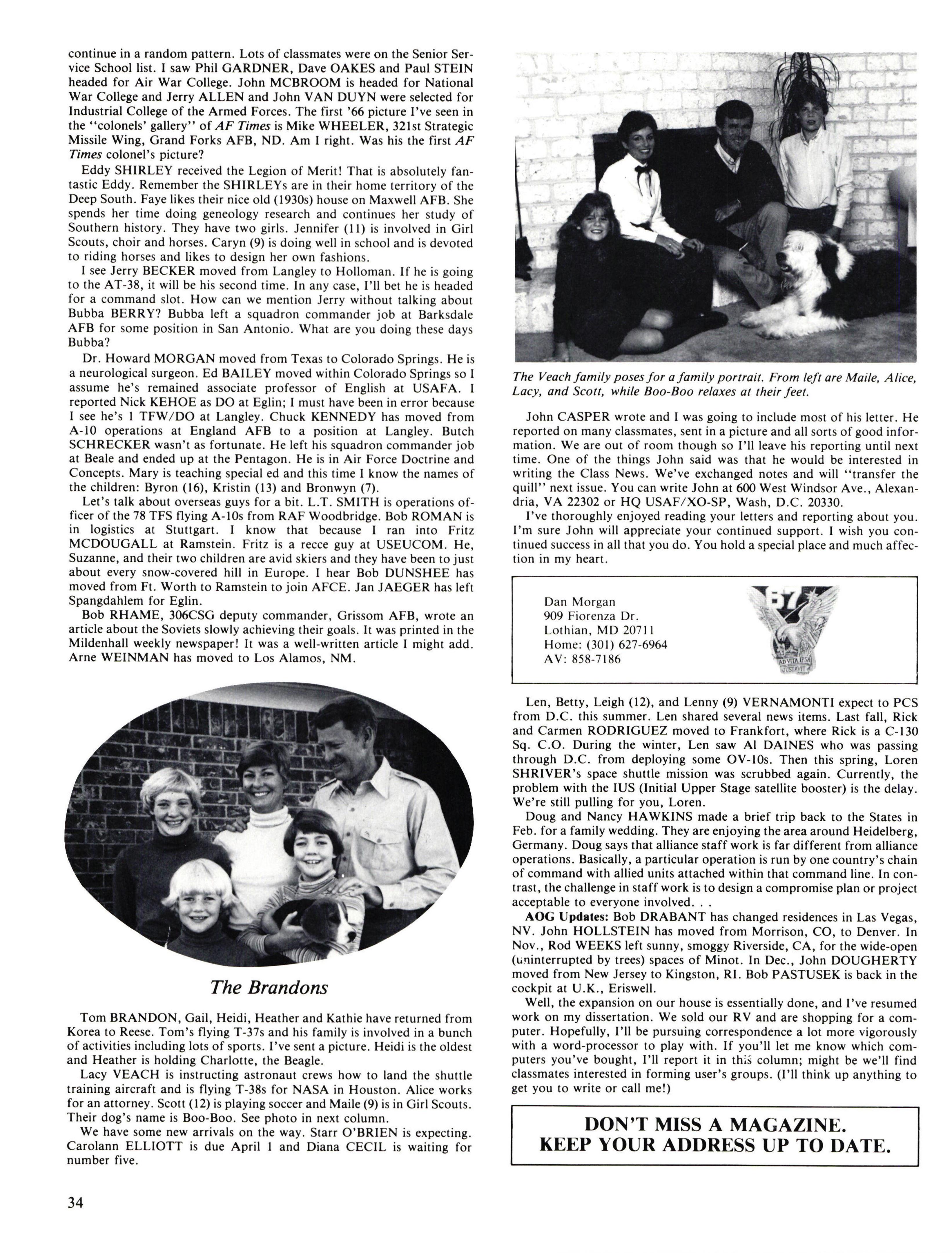 My last letter was from Dave “Haggy” HAGGINBOTHOM, who wrote to confirm the rumor that he is stationed in “Muntgumry.” He flies T-39s at Maxwell, and tells me that they are the only active duty aircraft in the state of Alabama. He says he’ll be heartbroken when the AF switches to Lear 35s next April. Does that mean you’ll finally get autopilot? He is recruiting planes and crews for an open house on 16 May, but I think this column will appear too late to be of much help. Anyway, RSVP to AV 875-7876. Dave also sends word that Bruce HAUPT will be getting married at Eglin on 30 June. Other people scheduled to attend are Tim KRAMER and Lee “Behind ’Ya Harv’’ HARVEY. To Chris ALLENBY, Dave says, “If he wants to collect his champagne bet, he’ll have to be there to witness the big event. The sunshine and warm air should do that ‘leg’ body of his some good.” Well, Chris, that sounds like an invitation to me!