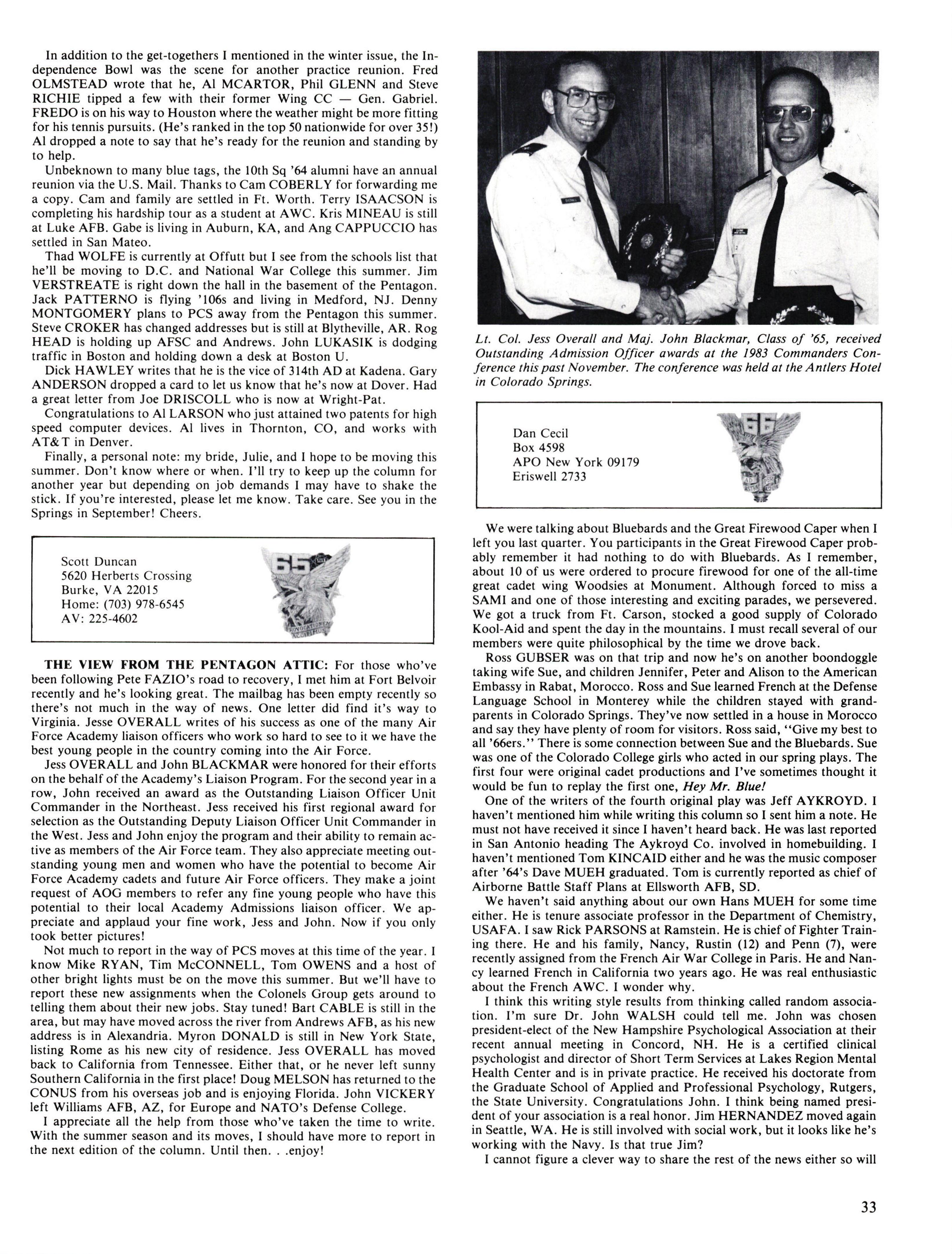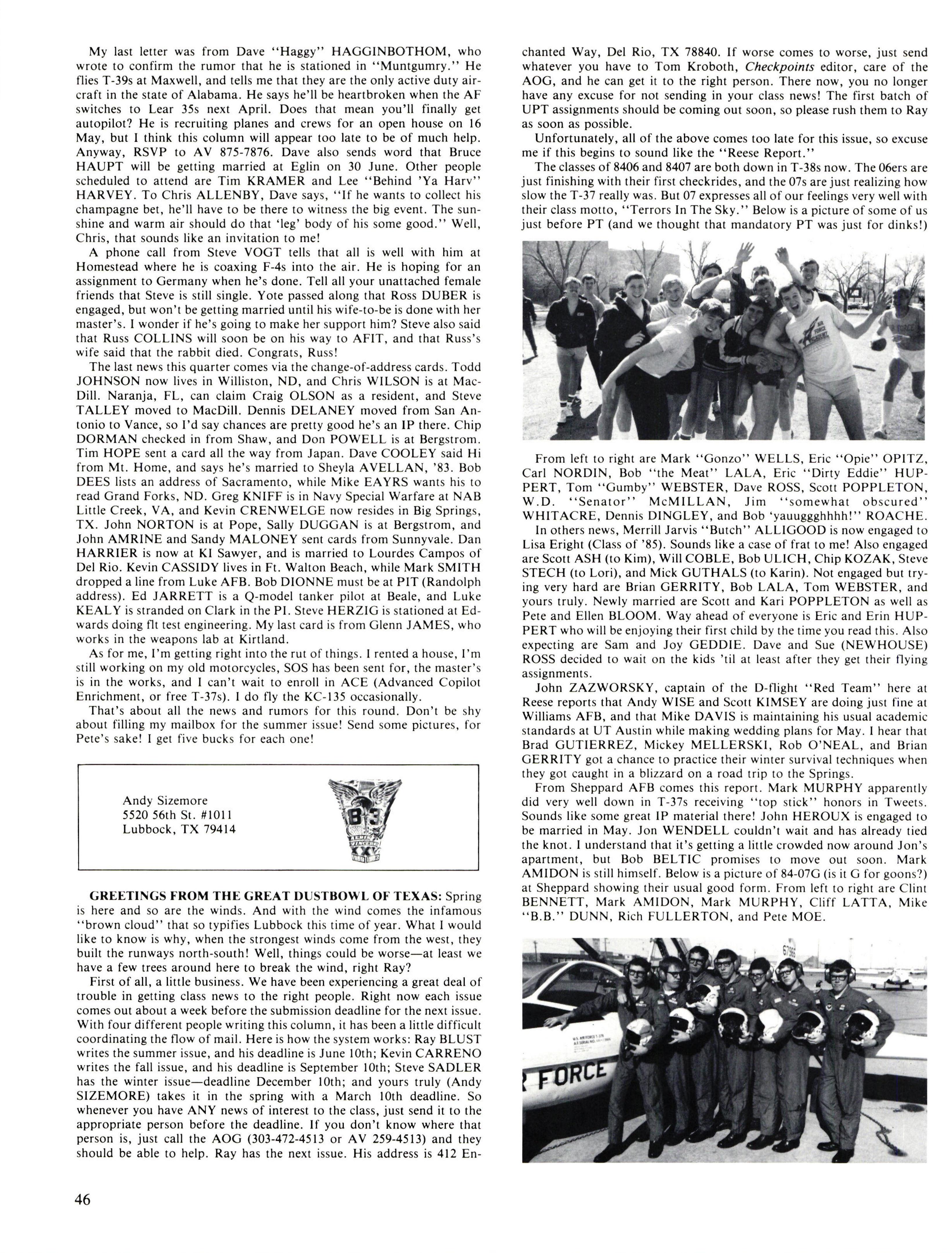 First of all, a little business. We have been experiencing a great deal of trouble in getting class news to the right people. Right now each issue comes out about a week before the submission deadline for the next issue. With four different people writing this column, it has been a little difficult coordinating the flow of mail. Here is how the system works: Ray BLUST writes the summer issue, and his deadline is June 10th; Kevin CARRENO writes the fall issue, and his deadline is September 10th; Steve SADLER has the winter issue—deadline December 10th; and yours truly (Andy SIZEMORE) takes it in the spring with a March 10th deadline. So whenever you have ANY news of interest to the class, just send it to the appropriate person before the deadline. If you don’t know where that person is, just call the AOG (303-472-4513 or AV 259-4513) and they should be able to help. Ray has the next issue. His address is 412 En
