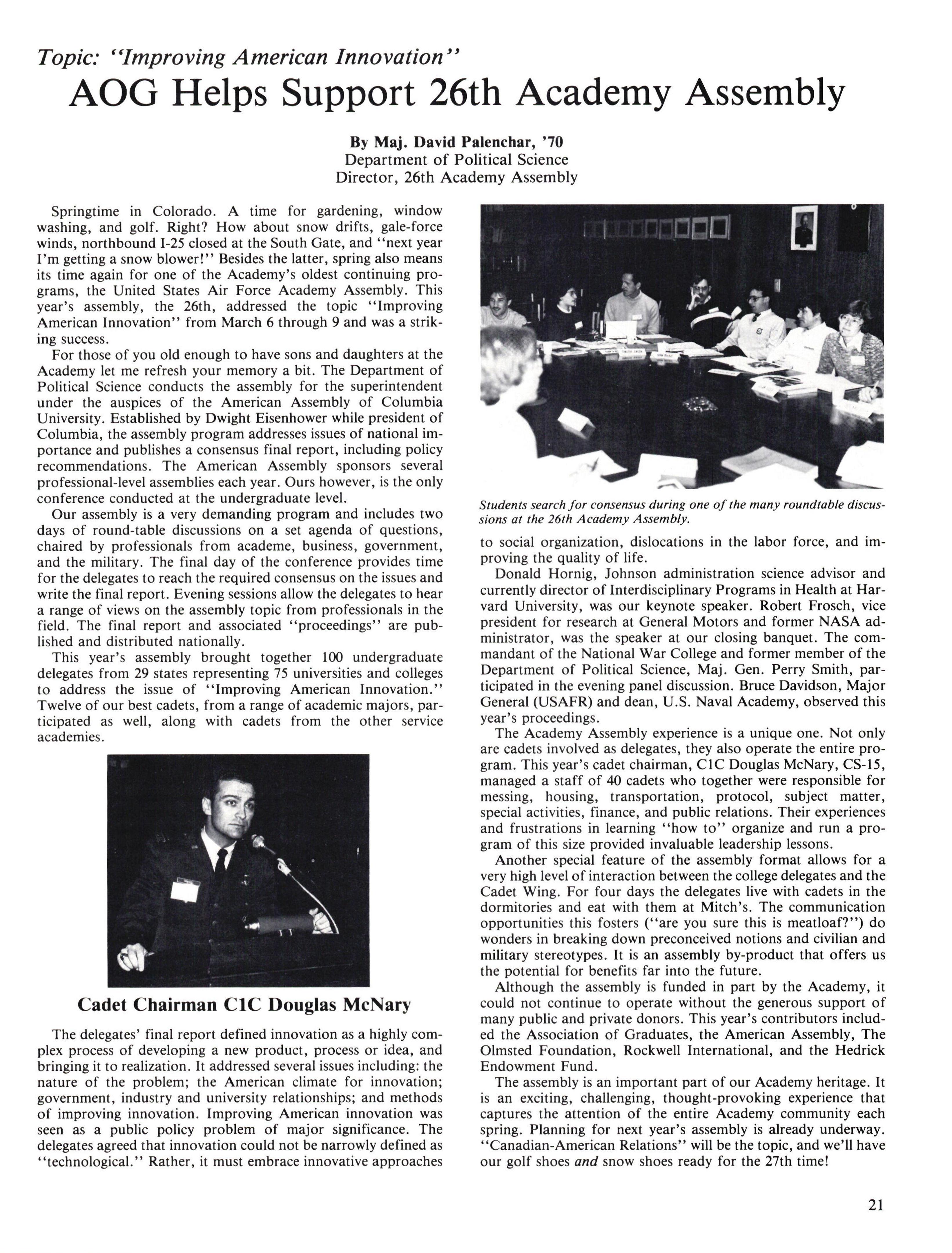 The Academy recently hosted the 26th annual USAFA Assembly, at which the topic was “Improving American Innovation.” As usual, the assembly was a resounding success. The AOG is fortunate in having staunch supporters such as Frank and Harriet Hendrick, and the Rockwell Corporation to help defray the expenses of this event. Their help was especially appreciated this year when other funding which has been available in the past was not forthcoming. The Assembly is also endowed by grants from the American Assembly, the Olmstead Foundation, and the Association of Graduates.