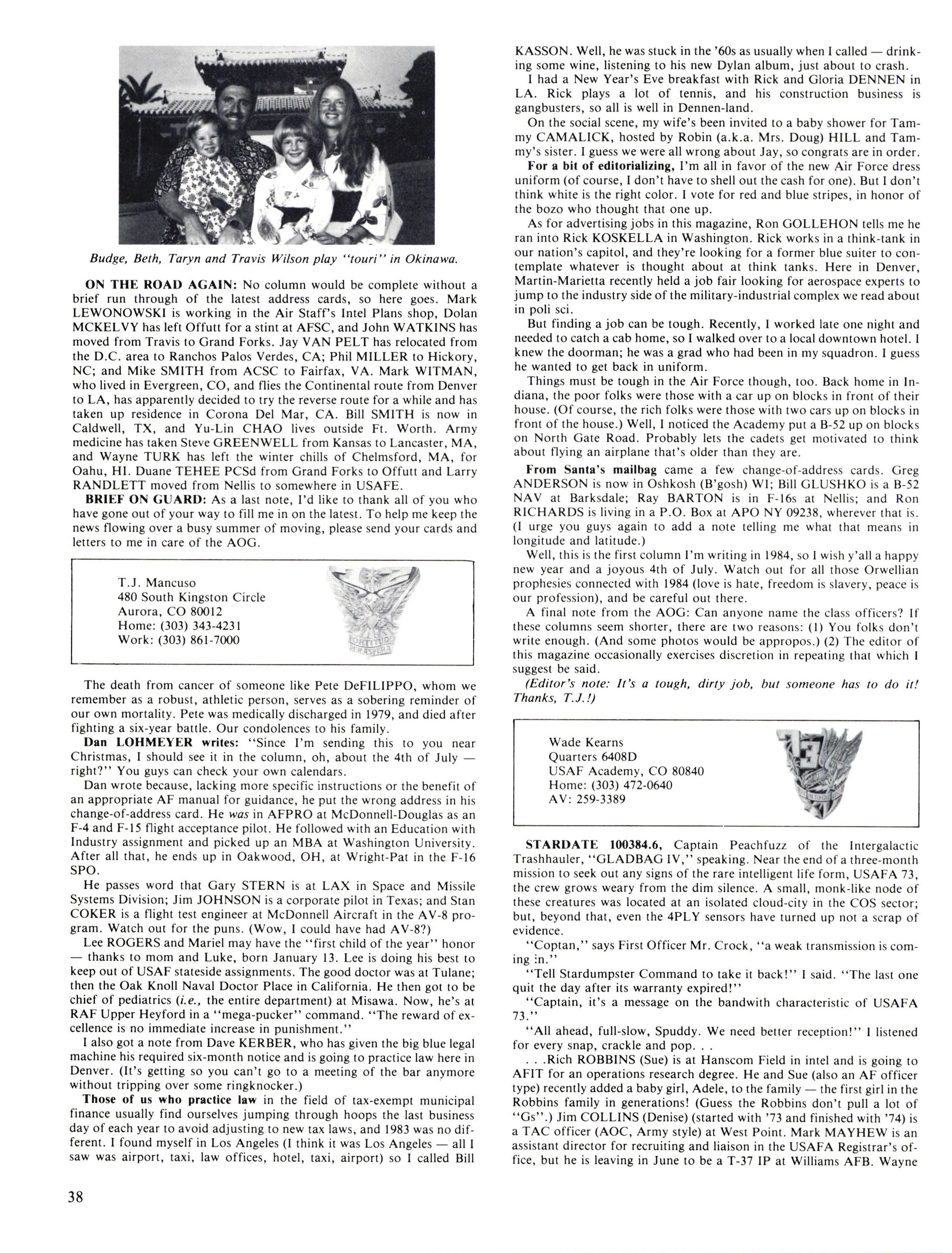 The last news this quarter comes via the change-of-address cards. Todd JOHNSON now lives in Williston, ND, and Chris WILSON is at MacDill. Naranja, FL, can claim Craig OLSON as a resident, and Steve TALLEY moved to MacDill. Dennis DELANEY moved from San Antonio to Vance, so I’d say chances are pretty good he’s an IP there. Chip DORMAN checked in from Shaw, and Don POWELL is at Bergstrom. Tim HOPE sent a card all the way from Japan. Dave COOLEY said Hi from Mt. Home, and says he’s married to Sheyla AVELLAN, ’83. Bob DEES lists an address of Sacramento, while Mike EAYRS wants his to read Grand Forks, ND. Greg KNIFF is in Navy Special Warfare at NAB Little Creek, VA, and Kevin CRENWELGE now resides in Big Springs, TX. John NORTON is at Pope, Sally DUGGAN is at Bergstrom, and John AMRINE and Sandy MALONEY sent cards from Sunnyvale. Dan HARRIER is now at KI Sawyer, and is married to Lourdes Campos of Del Rio. Kevin CASSIDY lives in Ft. Walton Beach, while Mark SMITH dropped a line from Luke AFB. Bob DIONNE must be at PIT (Randolph address). Ed JARRETT is a Q-model tanker pilot at Beale, and Luke KEALY is stranded on Clark in the PL Steve HERZ1G is stationed at Edwards doing fit test engineering. My last card is from Glenn JAMES, who works in the weapons lab at Kirtland.