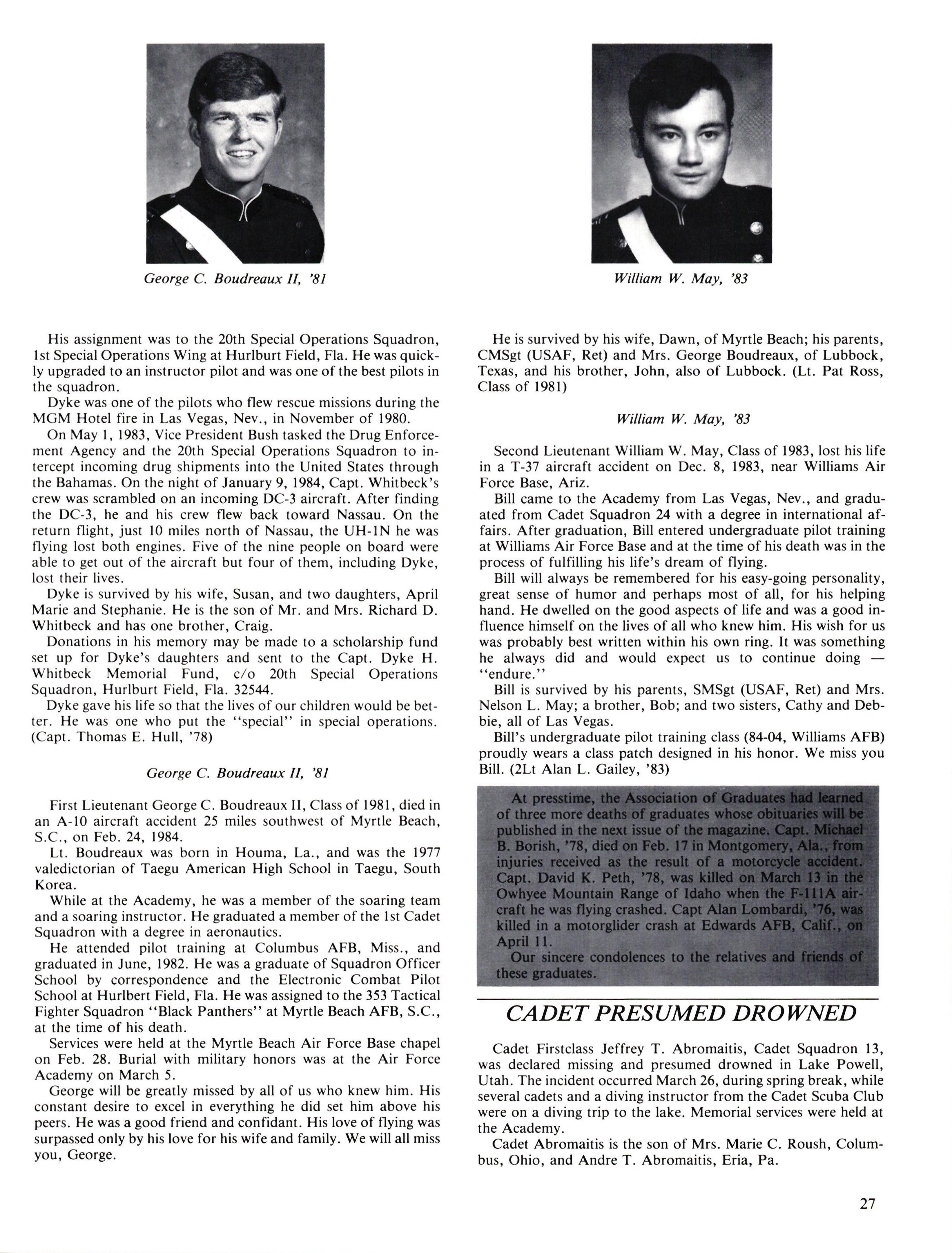 ★ ¥ * 27 May (Sun) 28 May (Mon) 29 May (Tue) 30 May (Wed) JUNK WEEK 1984 HIGHLIGHTS 9 & 11 a.m. Cadet Chapel Services 1:30 & 5 p.m. Baccalaureate Services (Ticket needed) 8 p.m. Bluebards’ Production ‘‘Guys and Dolls” (Ticket needed) 9:25 a.m. Organizational Awards Parade (Parade Ground) 1:30 p.m. Individual Awards Ceremony (Field House) 5:30 p.m. Athletic Awards Banquet (Ticket needed) 8:30 p.m. Cadet Chorale Concert (Arnold Hall) 9:35 a.m. Drum & Bugle Corps Performance (Parade Ground) 10 a.m. Graduation Parade (Parachuting and Soaring Demonstration at Parade Ground) p.m. Open House 9:30 a.m. Graduation Ceremony (Falcon Stadium) 11:35 a.m. USAF Thunderbird Team Demonstration * * * * * * ASSOCIATION OF GRADUATES USAFA SUPPORT USAFA JOIN THE AOG