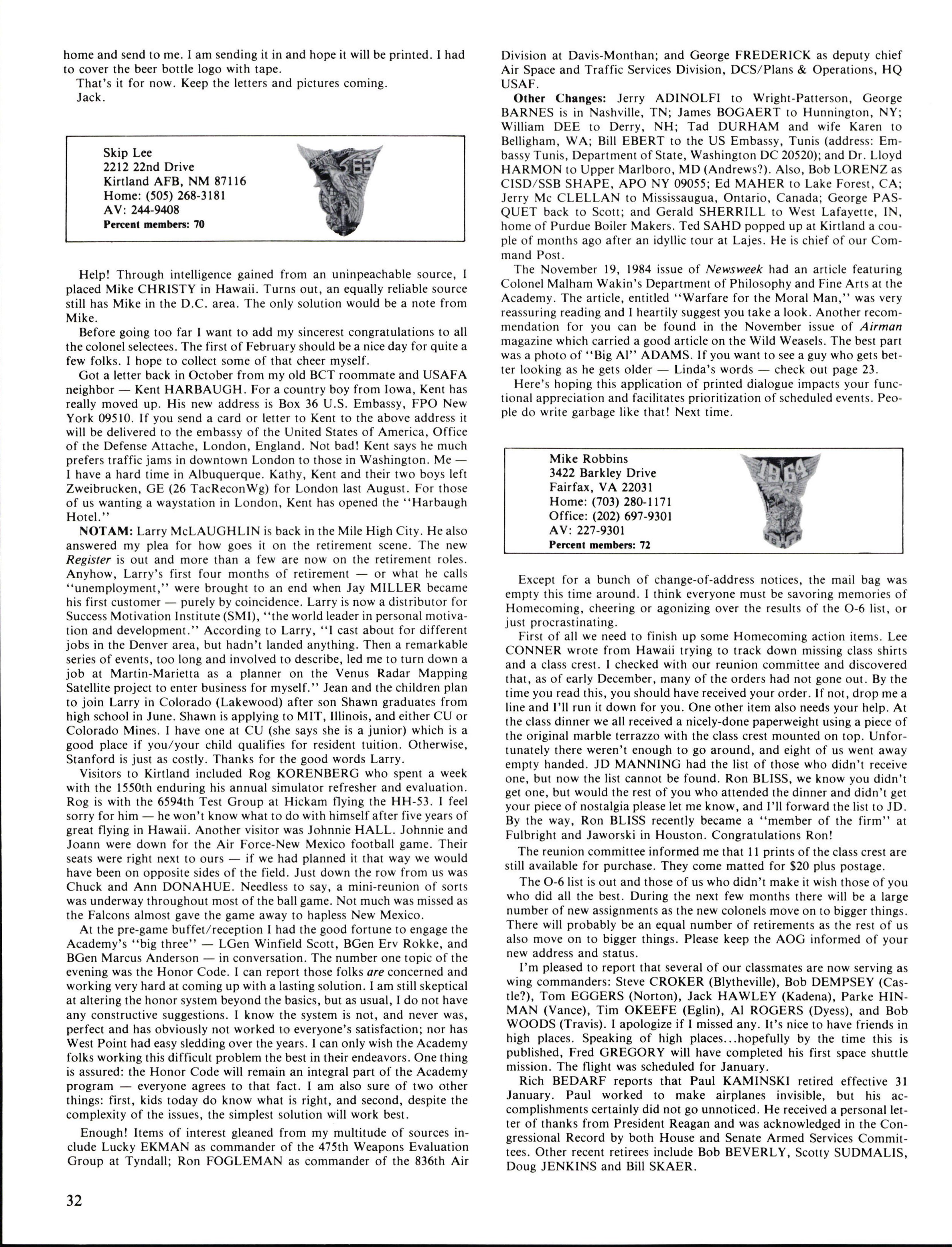 One thing I have noticed about being the class scribe is how many peopie I never knew at USAFA and how all of them act like I am their next of kin. Some people will stop at nothing to see their name in print. Seriously though, the cards and letters are greatly appreciated.