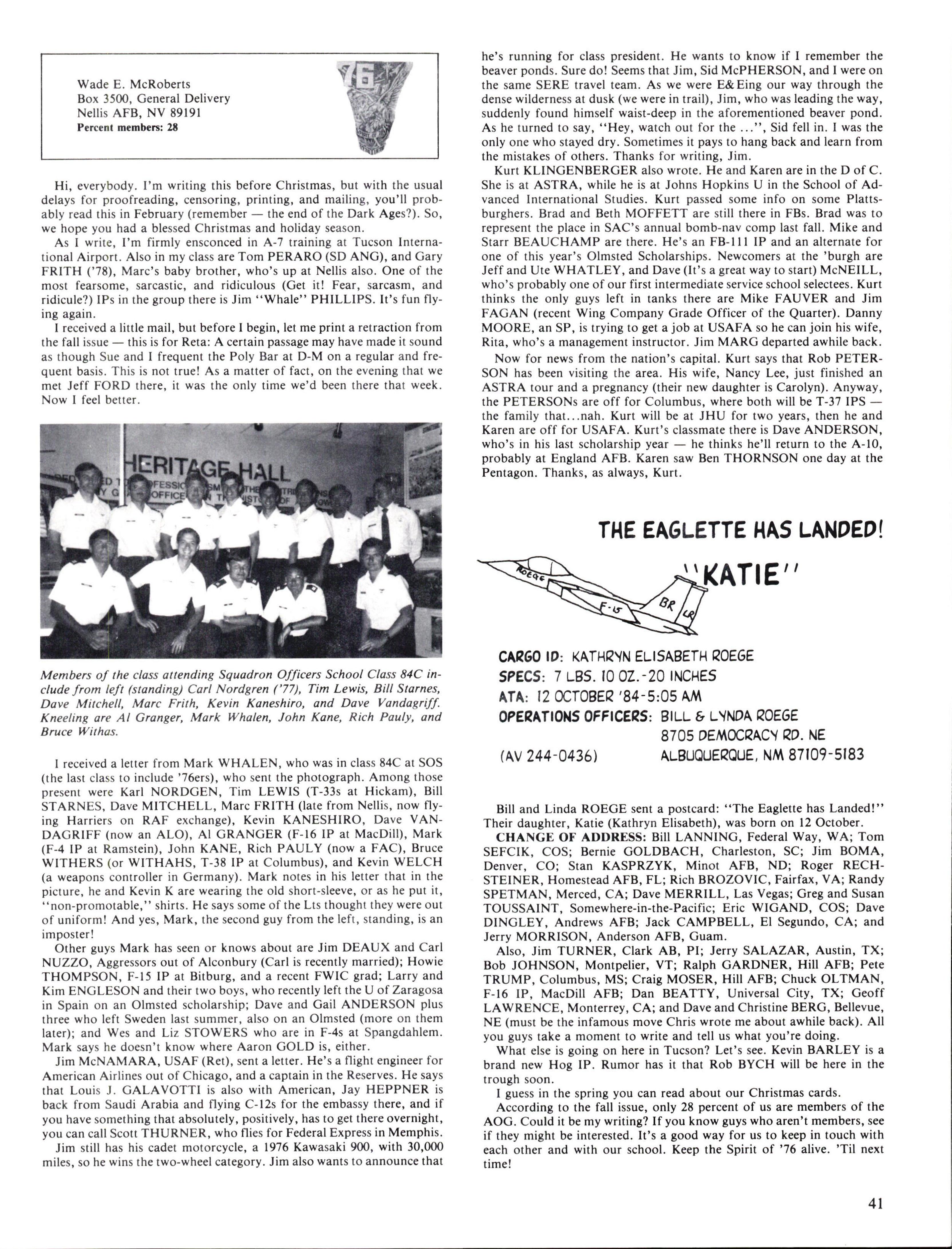 Officers’ Course: Doug WHITE, Alan BYERLEY, Rita (MASTROVITO) WILSON, Tammy (MYERS) LIVINGOOD and myself, who all graduate in December. Mike KIRBY, who left UPT, starts class this week and should graduate in May. Doug is going to Nellis, Alan to Dyess to work with the B-l, Tammy will join her husband at Laughlin, Rita is joining hers at Wright-Pat, and I’m going to Travis to the 602 OMS.