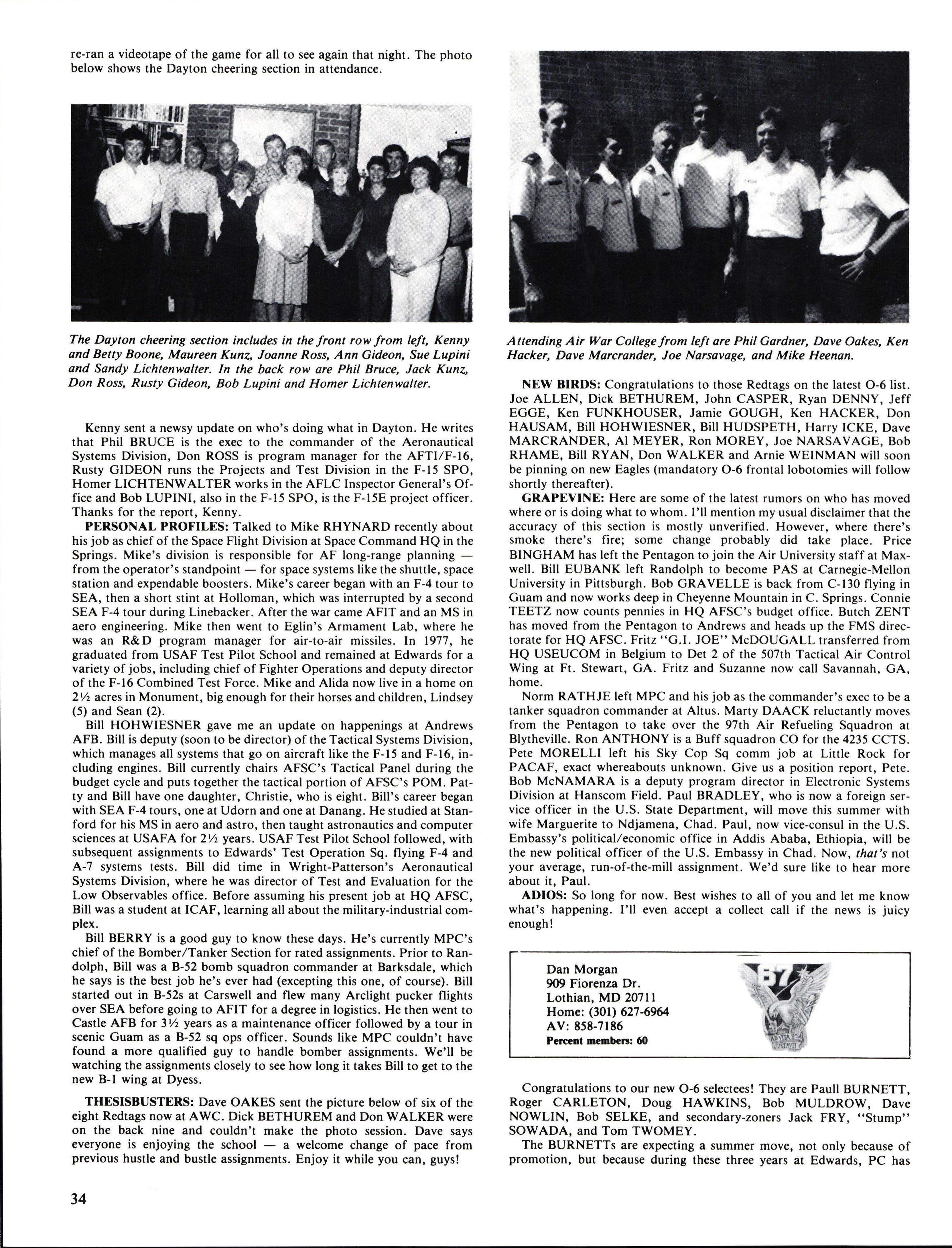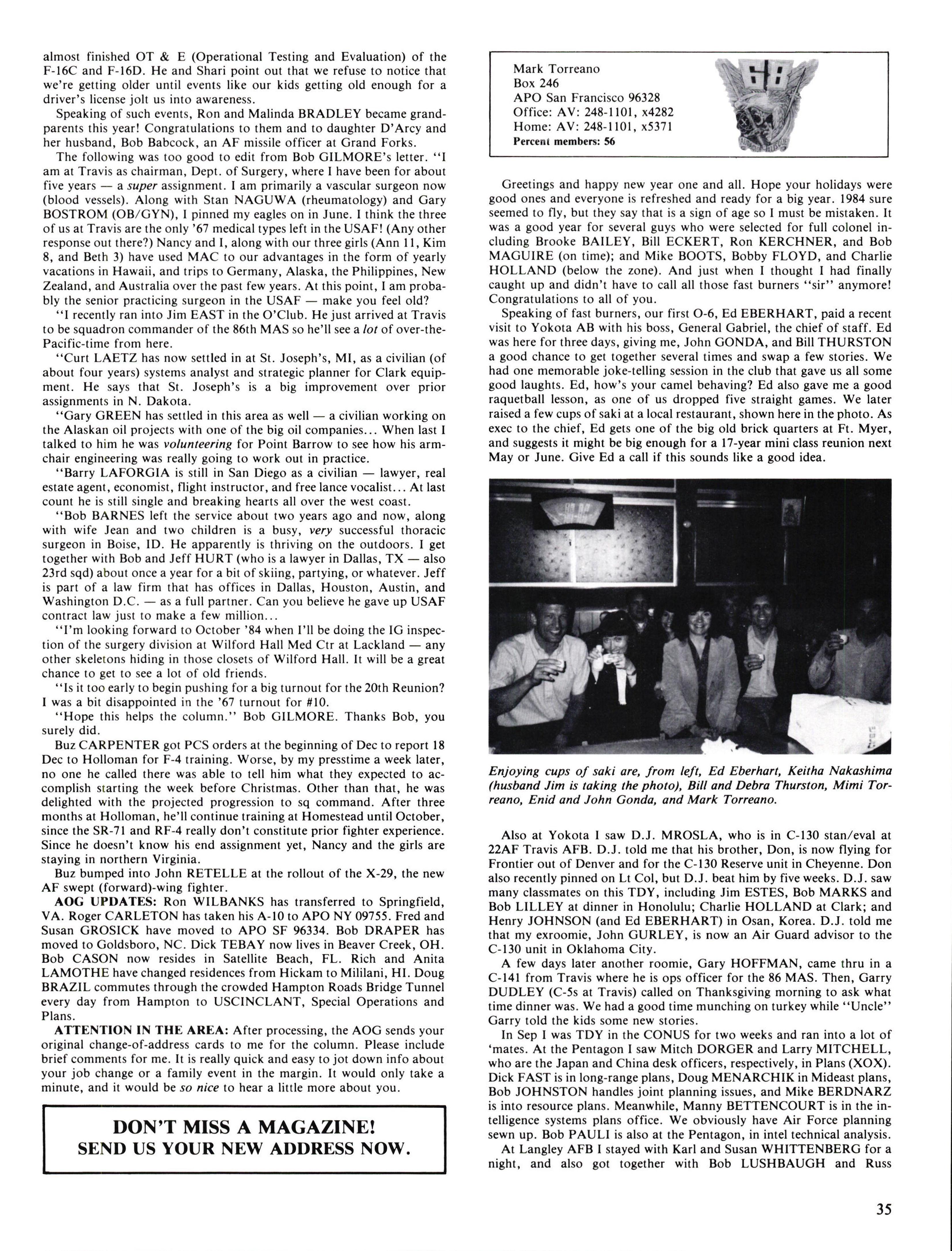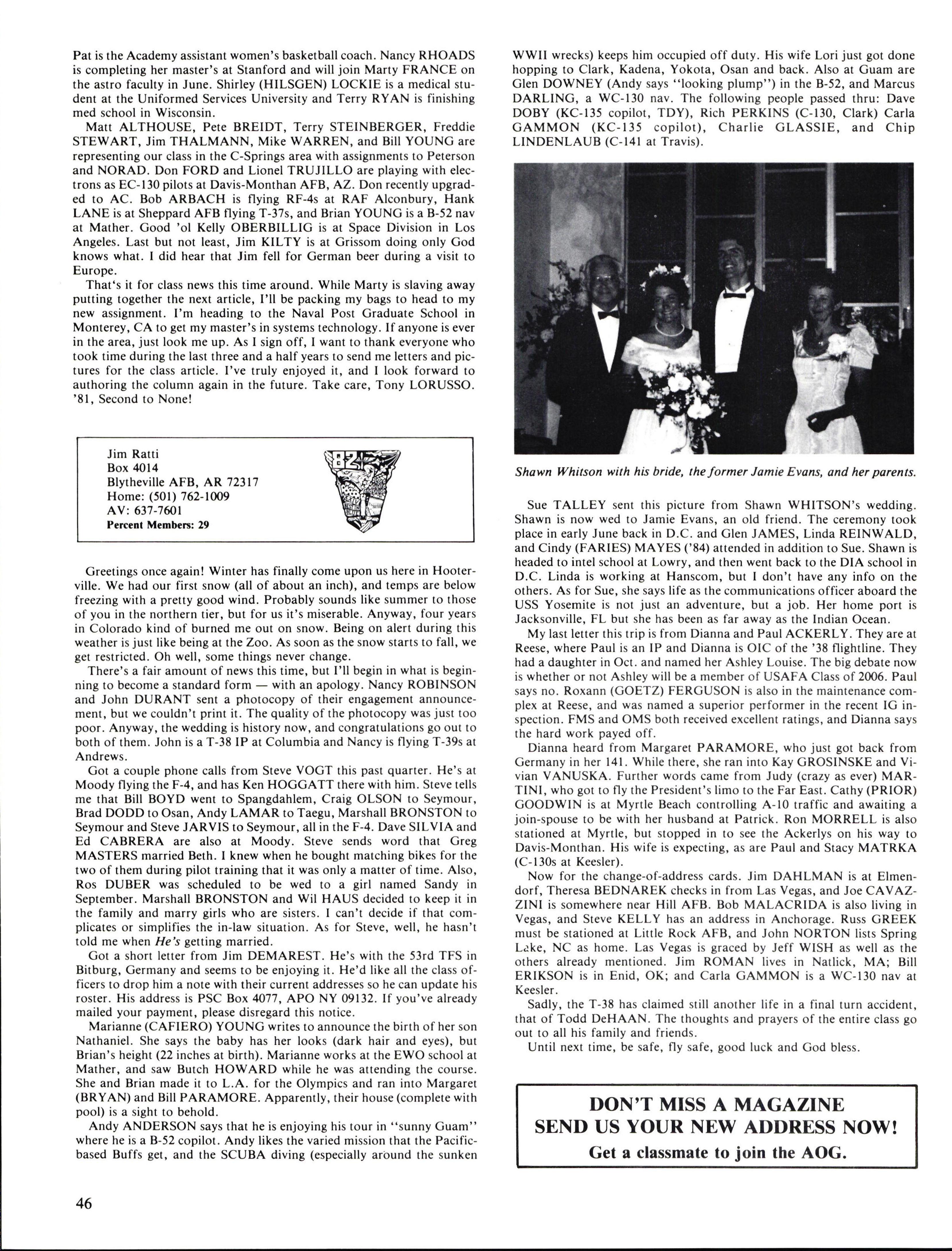 It seems that more and more of you have started to settle down in one capacity or another and it’s vitally important that we remain in contact with you. If you have a spare moment and you haven’t updated your address with the AOG, please do. They say that 2nd Lts do all of the work in the Air Force and I realize that most of you are out there running the Air Force but if you can break away from your important missions for a quick second and send me a card or a letter, I would certainly appreciate it. I’d like to know how you’re doing so I can tell the rest of the class. If you can’t send a letter or a short note, send cash or a blank check. I’ll certainly put the check to good use.