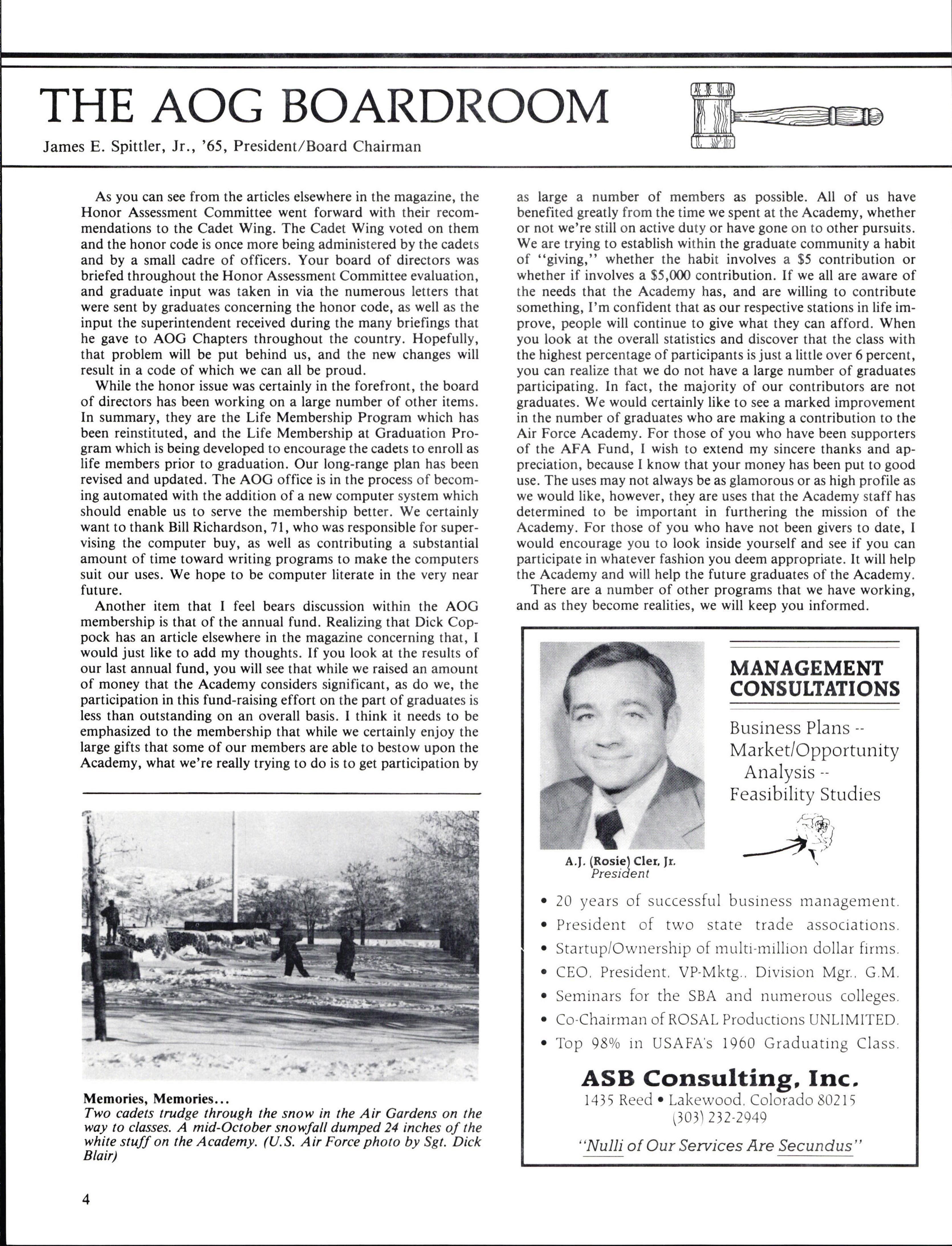 While the honor issue was certainly in the forefront, the board of directors has been working on a large number of other items. In summary, they are the Life Membership Program which has been reinstituted, and the Life Membership at Graduation Program which is being developed to encourage the cadets to enroll as life members prior to graduation. Our long-range plan has been revised and updated. The AOG office is in the process of becoming automated with the addition of a new computer system which should enable us to serve the membership better. We certainly want to thank Bill Richardson, 71, who was responsible for supervising the computer buy, as well as contributing a substantial amount of time toward writing programs to make the computers suit our uses. We hope to be computer literate in the very near future.
