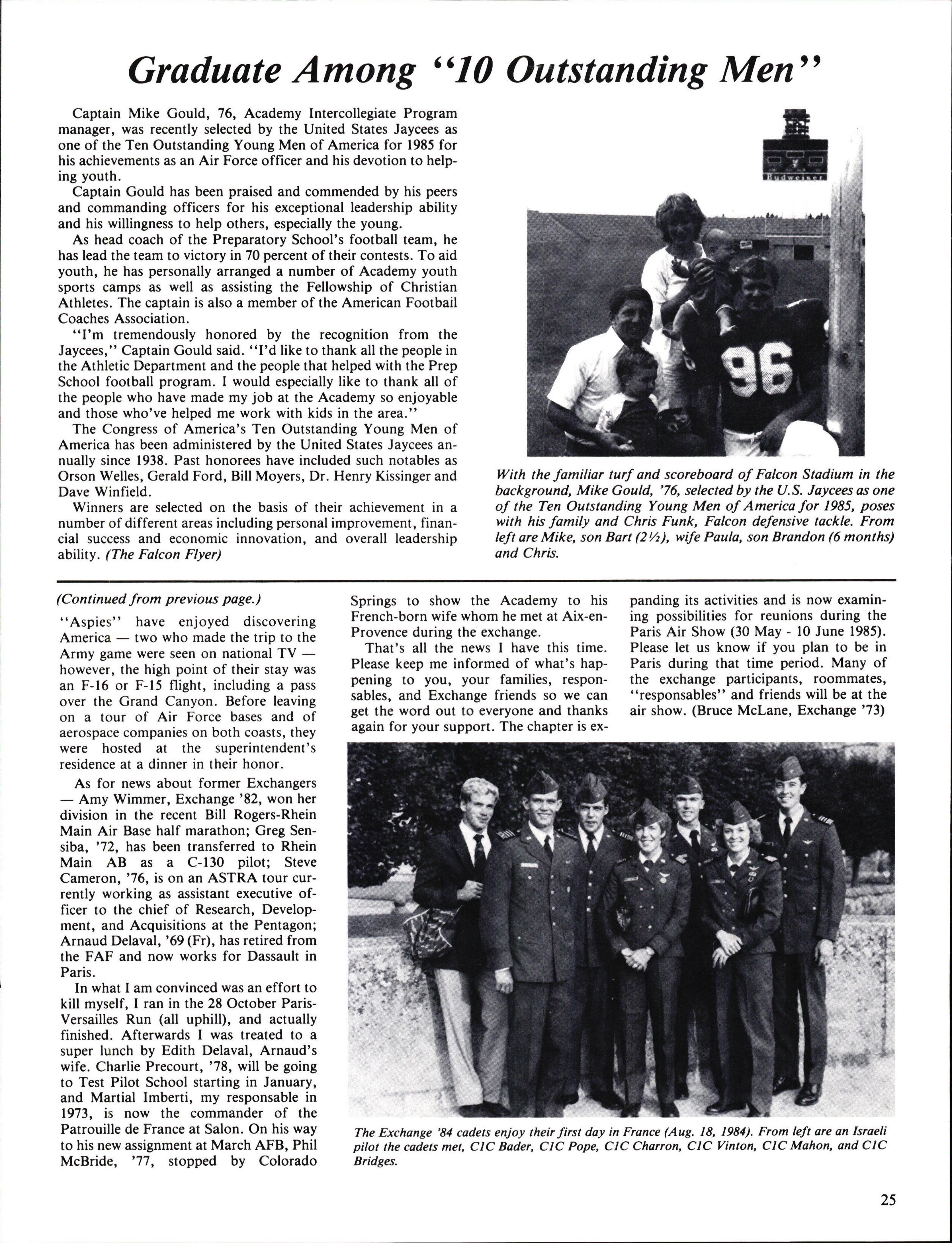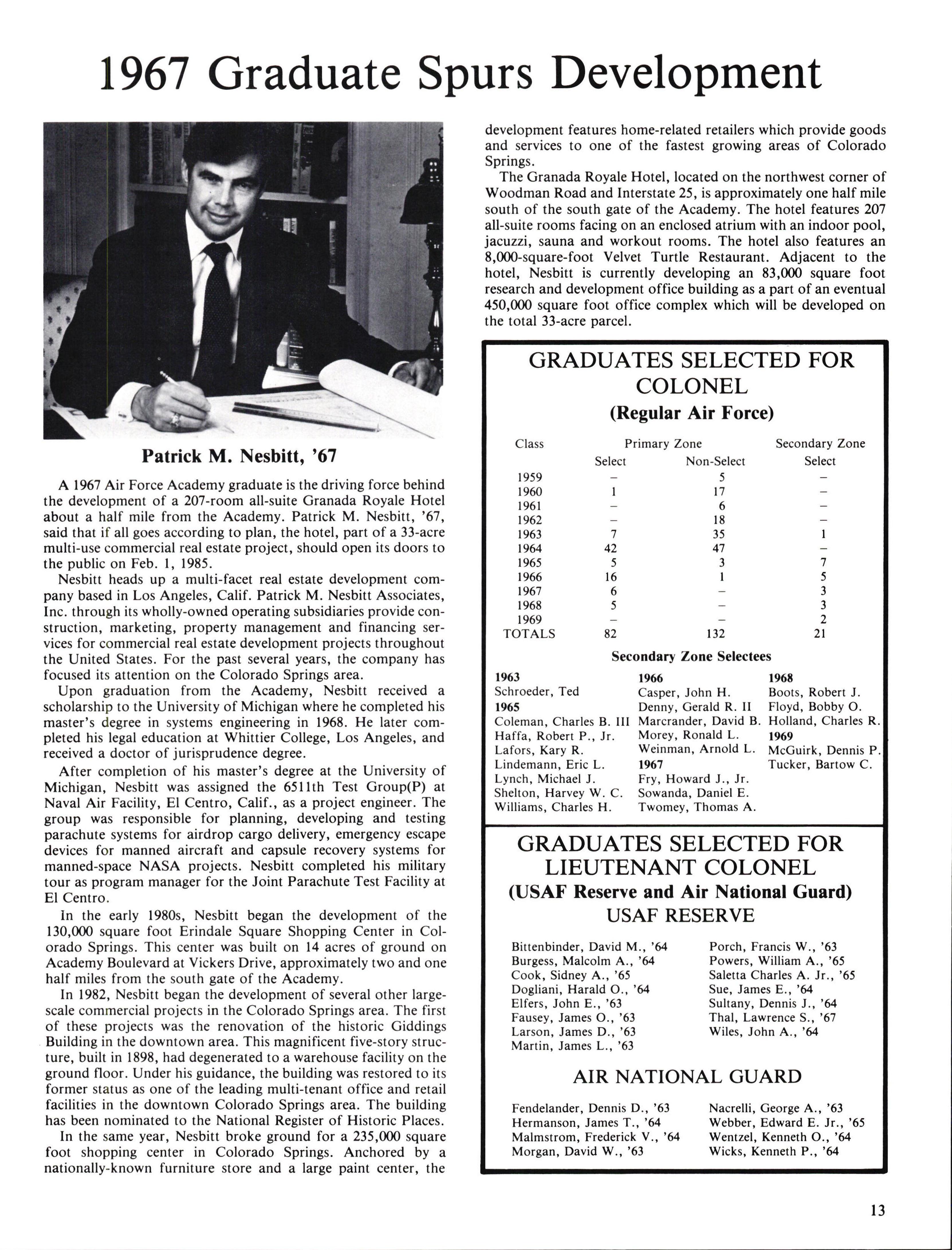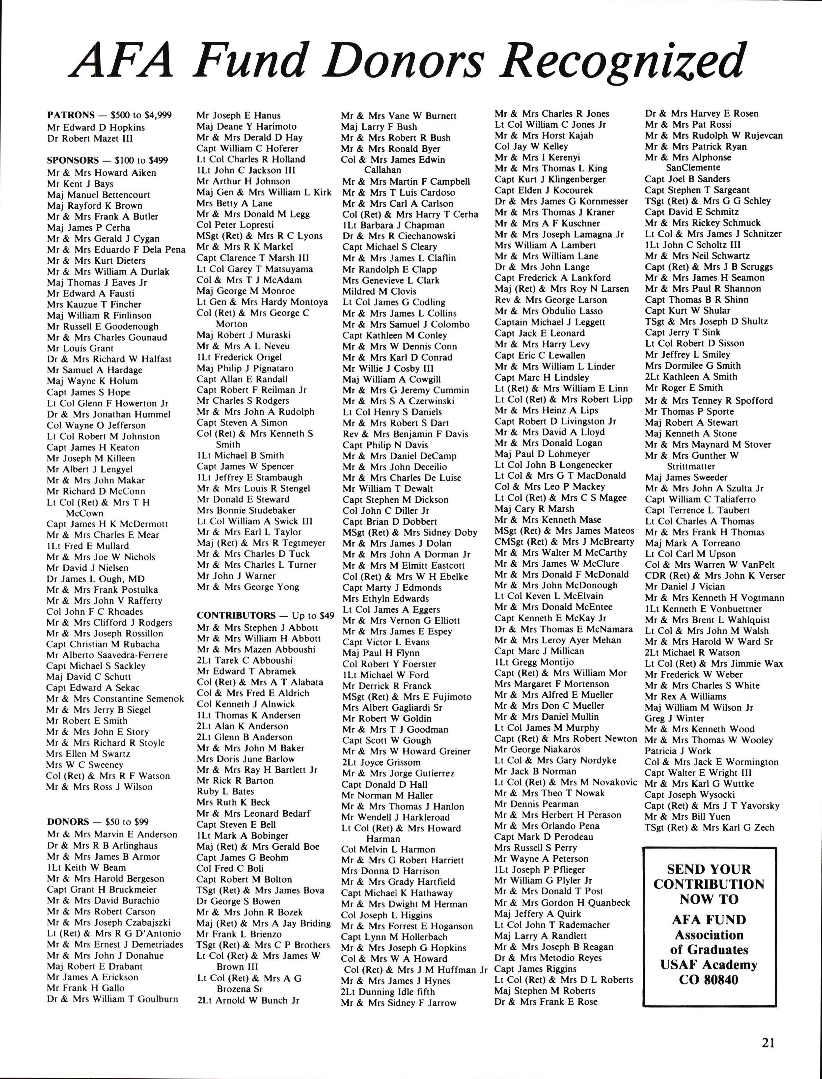 as large a number of members as possible. All of us have benefited greatly from the time we spent at the Academy, whether or not we’re still on active duty or have gone on to other pursuits. We are trying to establish within the graduate community a habit of “giving,” whether the habit involves a $5 contribution or whether if involves a $5,000 contribution. If we all are aware of the needs that the Academy has, and are willing to contribute something, I’m confident that as our respective stations in life improve, people will continue to give what they can afford. When you look at the overall statistics and discover that the class with the highest percentage of participants is just a little over 6 percent, you can realize that we do not have a large number of graduates participating. In fact, the majority of our contributors are not graduates. We would certainly like to see a marked improvement in the number of graduates who are making a contribution to the Air Force Academy. For those of you who have been supporters of the AFA Fund, I wish to extend my sincere thanks and appreciation, because I know that your money has been put to good use. The uses may not always be as glamorous or as high profile as we would like, however, they are uses that the Academy staff has determined to be important in furthering the mission of the Academy. For those of you who have not been givers to date, 1 would encourage you to look inside yourself and see if you can participate in whatever fashion you deem appropriate. It will help the Academy and will help the future graduates of the Academy. There are a number of other programs that we have working, and as they become realities, we will keep you informed.