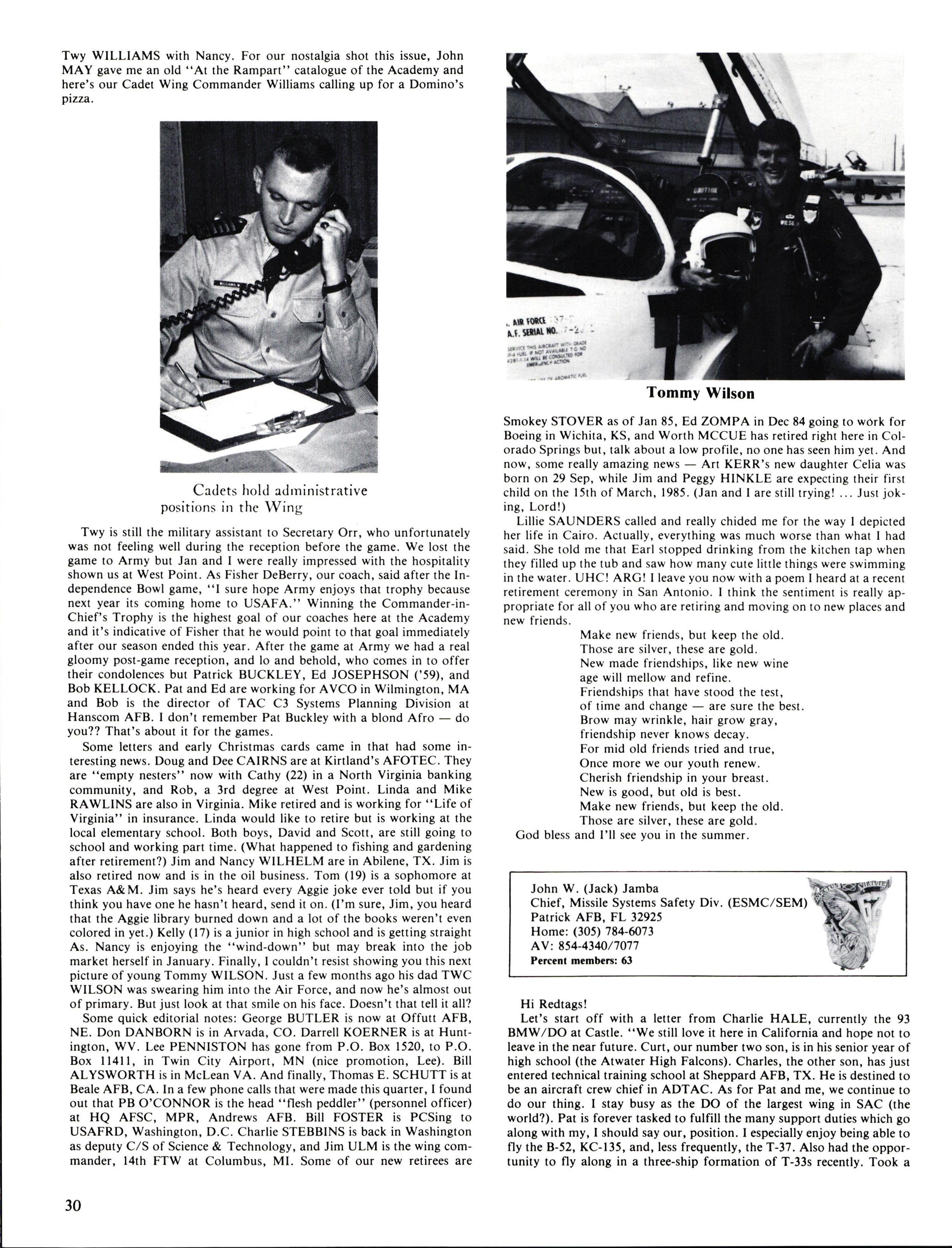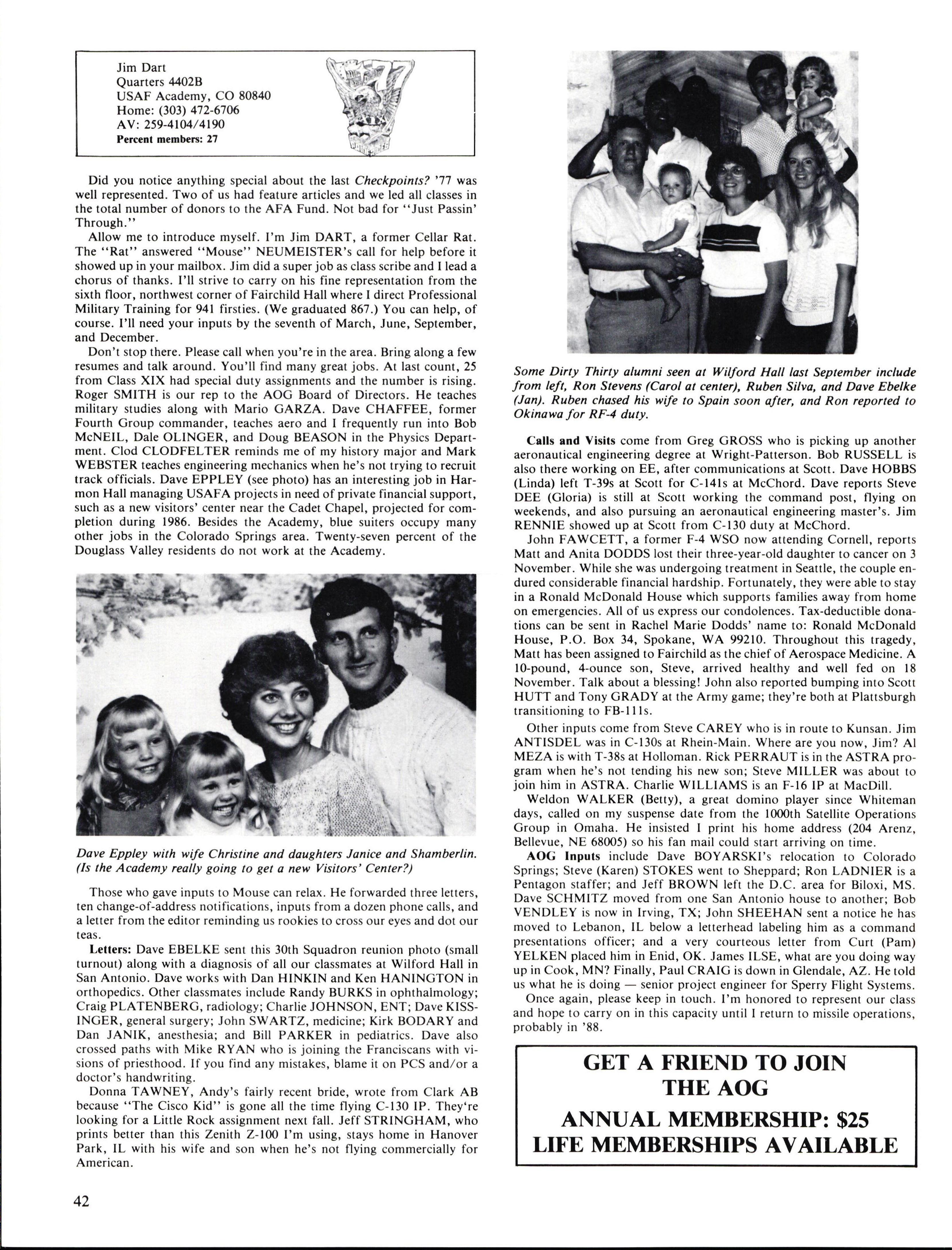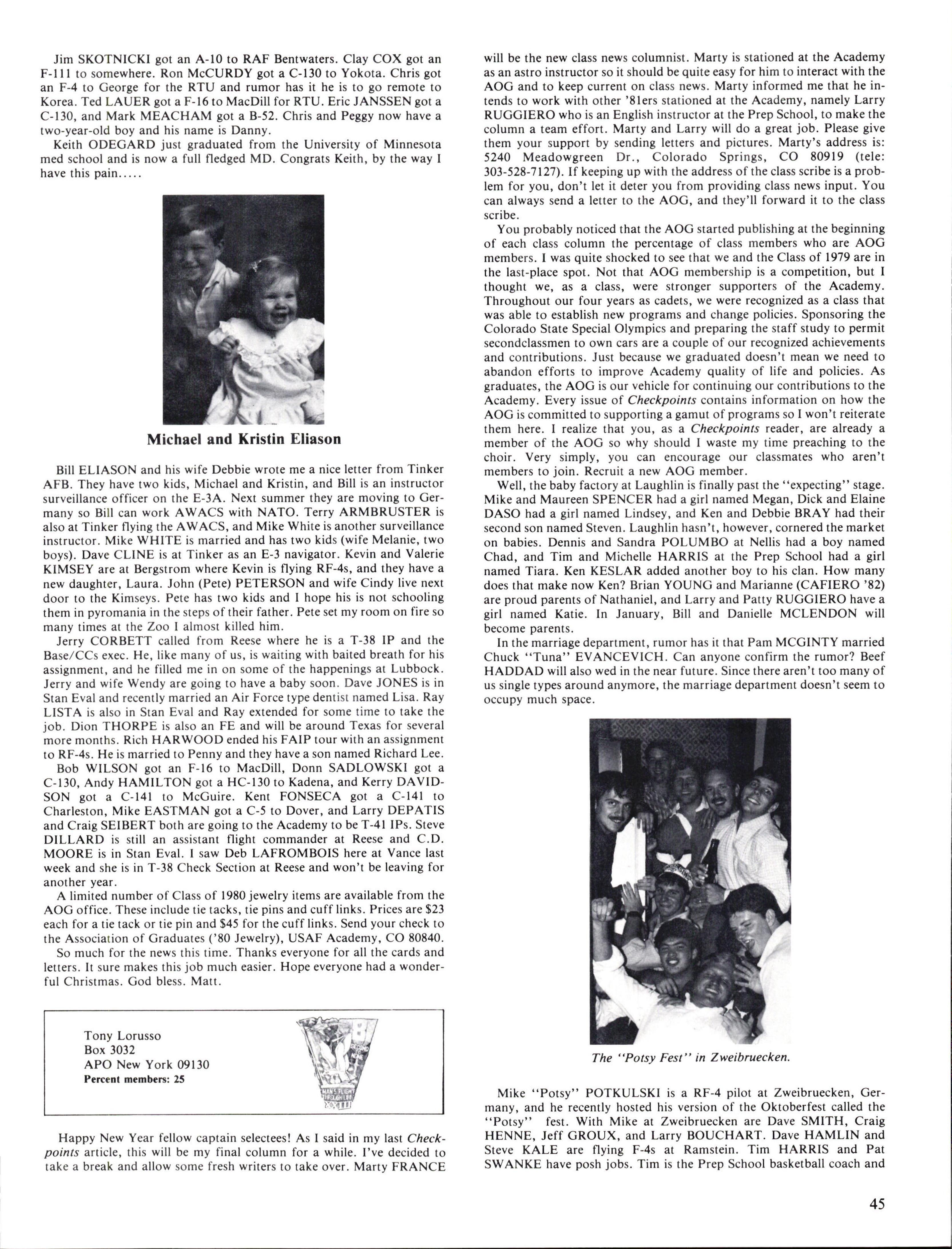 CHECKPOINTS is published in February, May, August and November by the Association of Graduates, USAF Academy, Colo. 80840 (Phone: 303-472-2067) and printed by Graphic Services of Colorado Springs, Colo. It is provided as part of an annual membership package which costs $25. Second-class postage paid at the USAF Academy, Colo. Opinions expressed in this magazine are those of the authors. They do not necessarily reflect the opinions, policy or attitude of the Association of Graduates, its officers or the editorial staff. The appearance of advertisements in this publication does not constitute an endorsement by the Association of Graduates of the products or services advertised. Copyright © Association of Graduates of the United States Air Force Academy, Winter 1984-85.