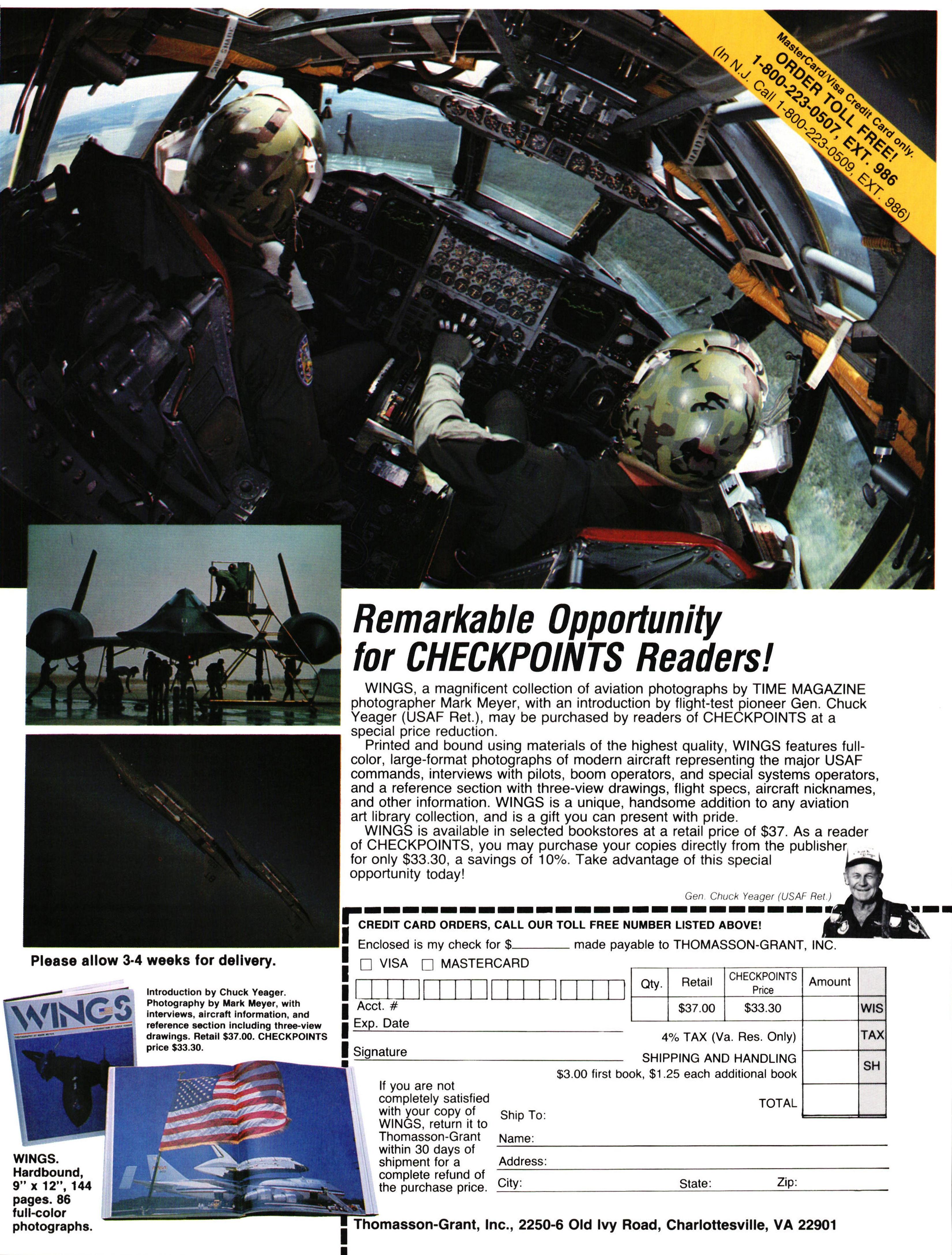 Gen. Chuck Yeager (USAF Ret.) ^ ^ CREDIT CARD ORDERS, CALL OUR TOLL FREE NUMBER LISTED ABOVE! Enclosed is my check for $ made payable to THOMASSON-GRANT, INC. WIS TAX WINGS. Hardbound, 9” x 12”, 144 pages. 86 full-color photographs. Please allow 3-4 weeks for delivery. Thomasson-Grant, Inc., 2250-6 Old Ivy Road, Charlottesville, VA 22901 Introduction by Chuck Yeager. Photography by Mark Meyer, with interviews, aircraft information, and reference section including three-view drawings. Retail $37.00. CHECKPOINTS price $33.30. If you are not completely satisfied with your copy of WINGS, return it to Thomasson-Grant within 30 days of shipment for a complete refund of the purchase price. Ship To: Name: $3.00 first book, $1.25 each additional book TOTAL Address: State. □ VISA □ MASTERCARD Acct. # Exp. Date Retail $37.00 CHECKPOINTS Price $33.30 Signature 4% TAX (Va. Res. Only) SHIPPING AND HANDLING Amount