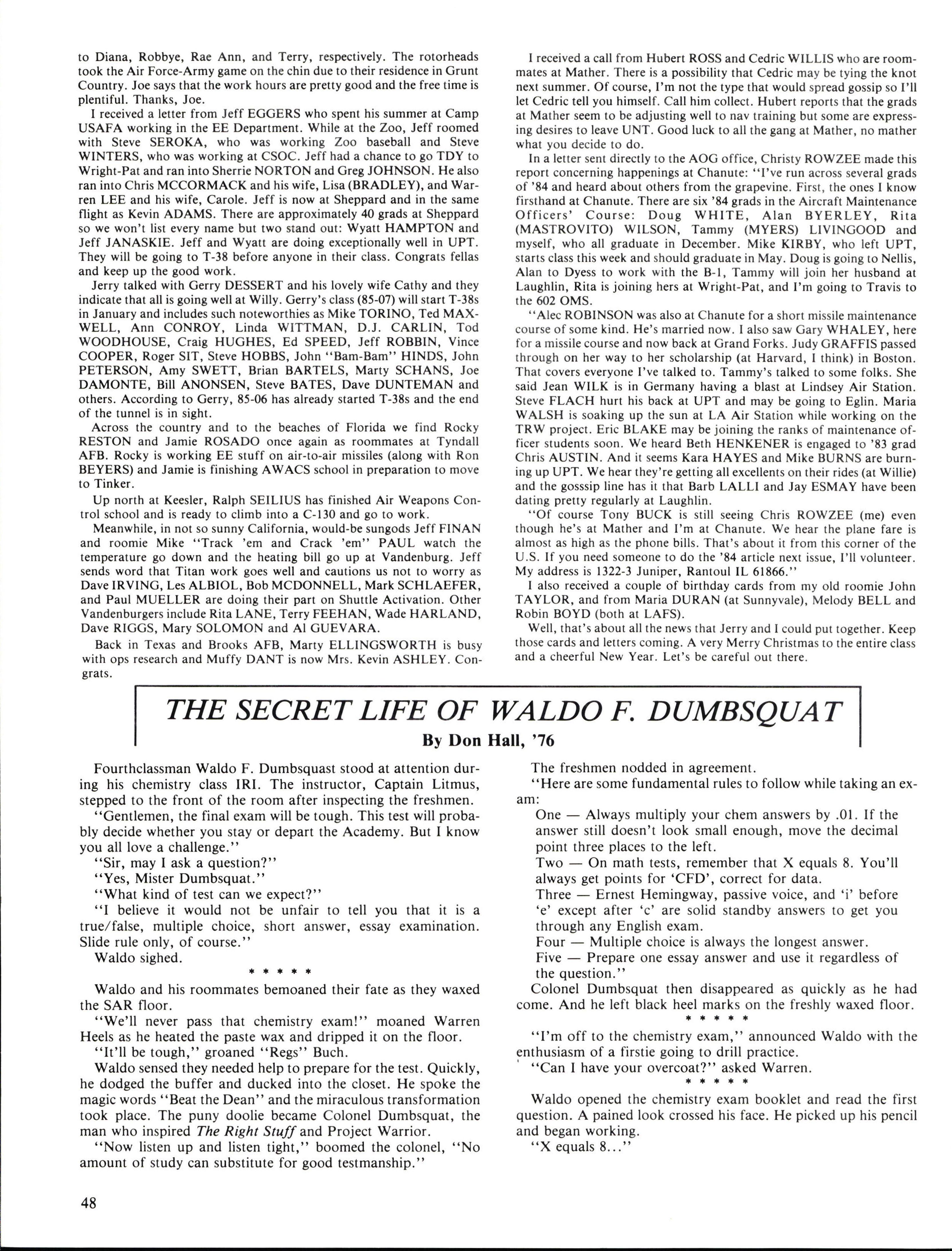 w“Class of 1984, this is Mission Control Houston, how do you read?” Loud and clear I hope. As you can see, the NASA jargon has finally taken over my vocabulary and my English language memory module has been written over. The Johnson Space Center is much like the Air Force in terms of acronyms. I have this book that 1 carry around that contains 260 pages of Space Transportation System acronyms. You thought Contrails was bad. You haven’t seen nothing until you’ve seen this. Doug WREATH, Greg PETRICK, Jerry SELLERS and myself are all doing well at Johnson, although we could use a little snow to get this place hopping. Greg is making plans to journey to the bowl game in Shreveport and he will probably represent the rest of us since we might not be going. I plan to make the trek to Shreveport but I’m still awaiting news on my Christmas leave plans. Well, that’s enough about us, let’s move on to some other stuff.