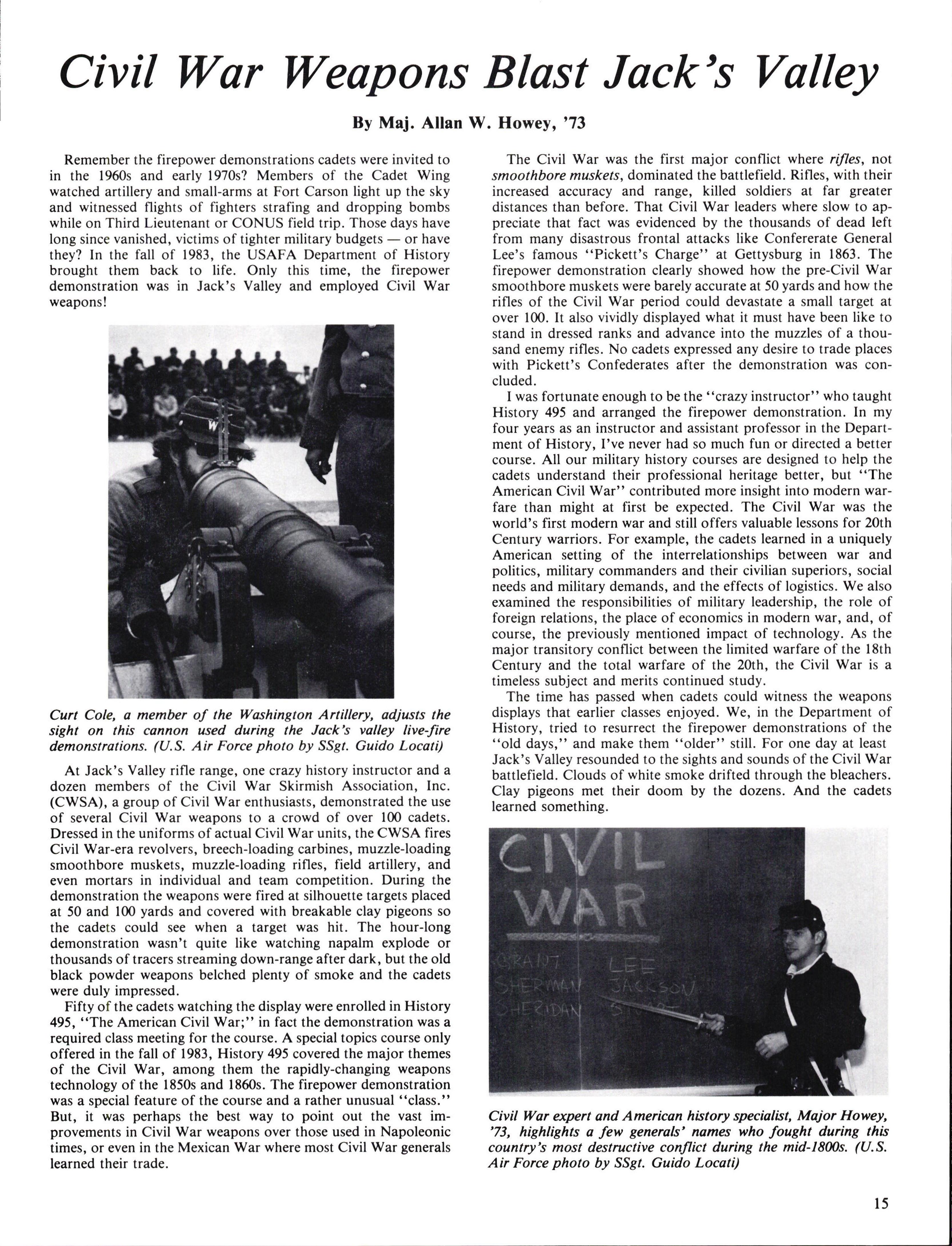 Cynthia Barsotti Association President and Chairman of the Board James E. Spittler, Jr., ’65 BOARD OF DIRECTORS To Serve Until 30 June 1985 E A Zompa ’61 L C Harmon ’63 L R Kruczynski’65 G T Matsuyama ’65 W J Weida ’65 J R East ’67 J E Schofield ’67 C J Yoos II ’68 (Secretary) T J Salmon ’69 M G Sorenson ’70 W P Witt ’70 R A McFarland ’71 R S Fraser ’73 K S Samelson ’73 J W Spencer ’75 To Serve Until 30 June 1987 A W Biancur ’60 J C H Schwank ’60 R A Cubero ’61 (Vice-Chairman) M J Quinlan ’61 J F Wheeler ’64 R B Giffen ’65 A W Grieshaber Jr ’65 A E Blumberg Jr ’68 R C Schutt Jr ’69 P A Irish III ’74 R A Jensen Jr ’74 W A Yucuis ’74 S J Vreeland ’75 R L Smith ’77 B D Silver ’82 To Serve Until 1 June 1985 G C Zolninger, ’84 Interim Director R A Lowe ’71 W E Richardson, ’71 CHECKPOINTS VOLUME 13, NUMBER 4 WINTER 1984-85 ARTICLES DA PAGE Class President Assesses Honor System 6 Honor Procedure Changes Outlined 7 Personal Honor Viewed in Perspective 9 AOG Board Nomination Process Begins 11 1967 Graduate Spurs Development 13 Civil War Weapons Blast Jack’s Valley 15 Academy’s Birth, Progress, Recalled 16 Homecoming Reunion Classes Featured 18 Grads Share Liaison Officer Awards/General Promotions.... 19 1984-85 AFA Fund Lags Behind Goal 20 AFA Fund Donors Recognized 21 Thunderbirds Receive Independence Award 22 Graduate Among “10 Outstanding Men’’ 25 Joint Reunion Planning Underway 29 DEPARTMENTS nA ^ c PAGE The AOG Boardroom 4 View From the Top 6 Falcon Sports 23 Chapter News 24 Gone But Not Forgotten 26 Class News 28 The Secret Life of Waldo F. Dumbsquat 48