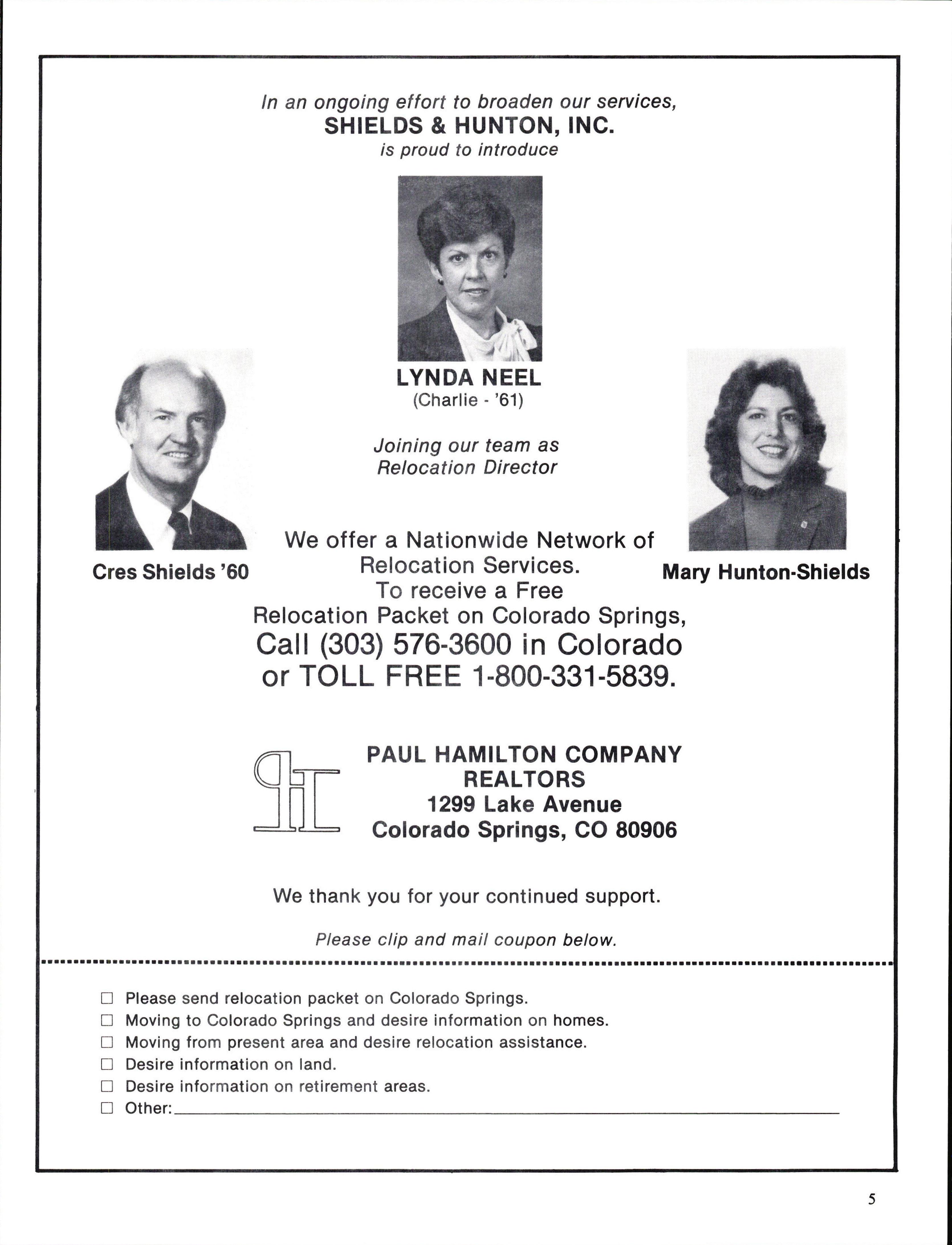 5 In an ongoing effort to broaden our services SHIELDS & HUNTON, INC. is proud to introduce Cres Shields ’60 Relocation Services. Mary Hunton-Shields To receive a Free Relocation Packet on Colorado Springs, Call (303) 576-3600 in Colorado or TOLL FREE 1-800-331-5839. PAUL HAMILTON COMPANY REALTORS 1299 Lake Avenue Colorado Springs, CO 80906 We thank you for your continued support. Please clip and mail coupon below. □ Please send relocation packet on Colorado Springs. □ Moving to Colorado Springs and desire information on homes. □ Moving from present area and desire relocation assistance. □ Desire information on land. □ Desire information on retirement areas. □ Other: