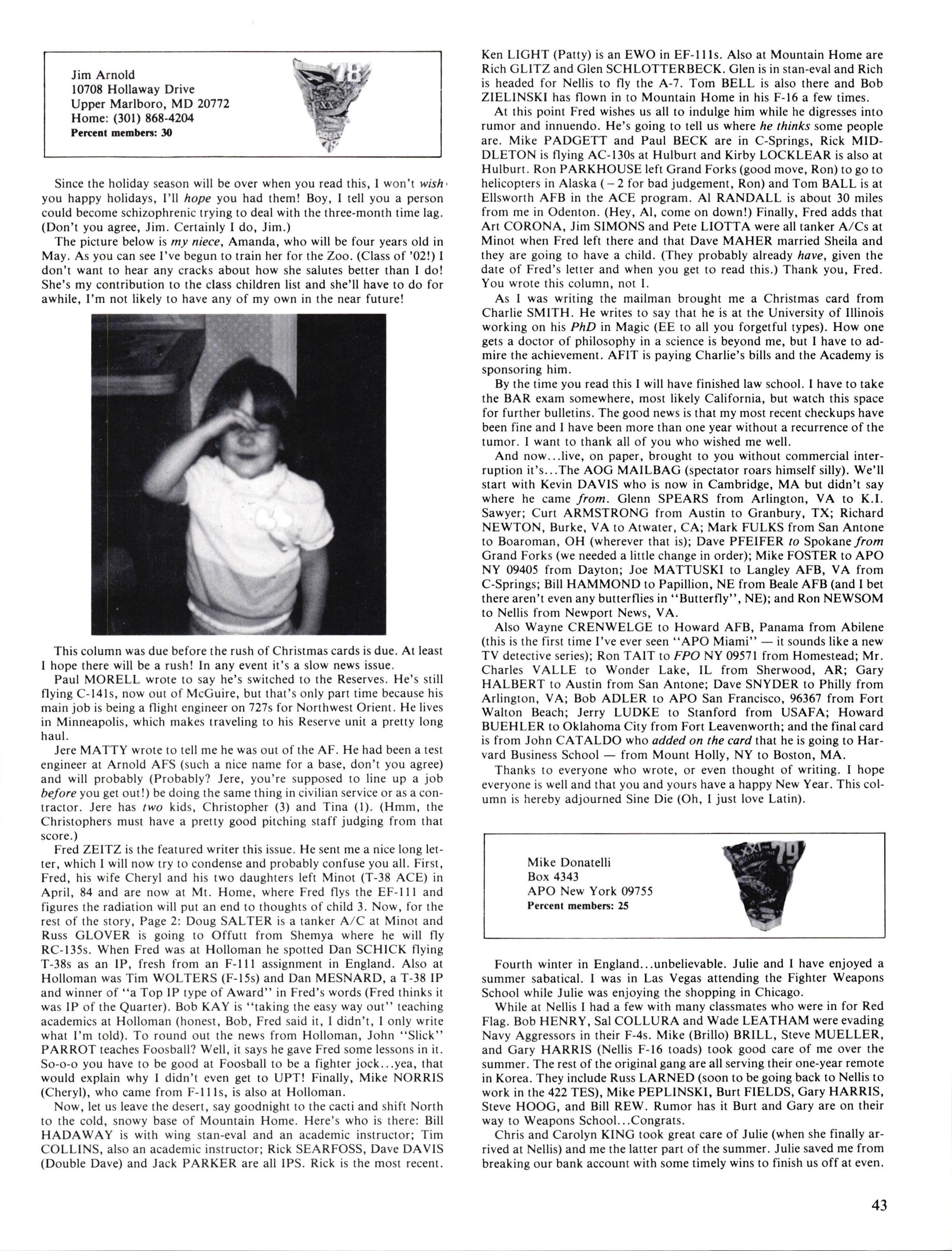 Now for the change-of-address cards. Jim DAHLMAN is at Elmendorf, Theresa BEDNAREK checks in from Las Vegas, and Joe CAVAZZINI is somewhere near Hill AFB. Bob MALACRIDA is also living in Vegas, and Steve KELLY has an address in Anchorage. Russ GREEK must be stationed at Little Rock AFB, and John NORTON lists Spring Lake, NC as home. Las Vegas is graced by Jeff WISH as well as the others already mentioned. Jim ROMAN lives in Natlick, MA; Bill ERIKSON is in Enid, OK; and Carla GAMMON is a WC-130 nav at Keesler.