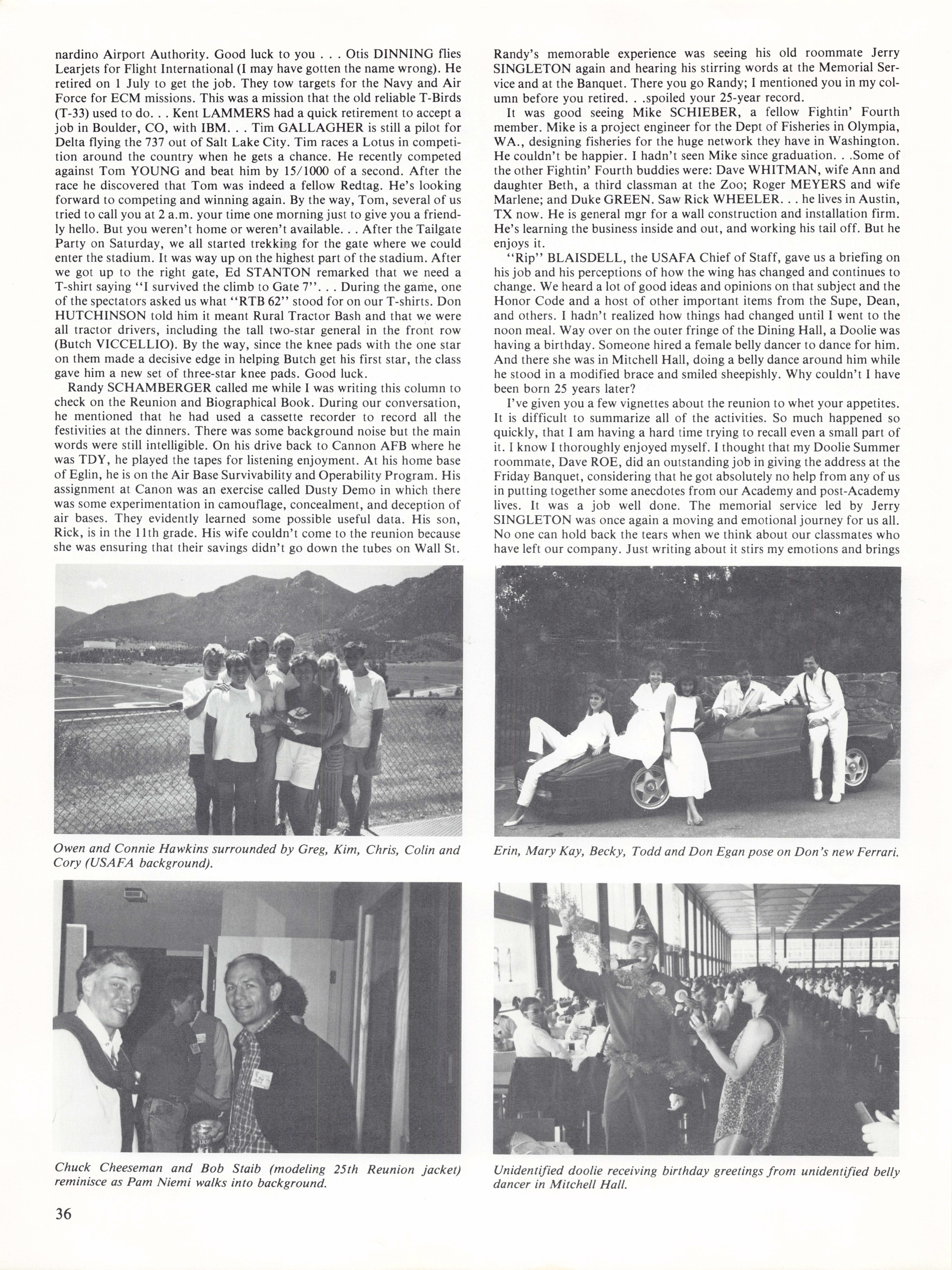 I’ve given you afew vignettes about the reunion to whet your appetites. It is difficult to summarize ail of the activities. So much happened so quickly, that Iam having ahard time trying to recall even asmall part of it. Iknow 1thoroughly enjoyed myself. Ithought that my Doolie Summer roommate, Dave ROE, did an outstanding job in giving the address at the Friday Banquet, considering that he got absolutely no help from any of us in putting together some anecdotes from our Academy and post-Academy lives. It was ajob well done. The memorial service led by Jerry SINGLETON was once again amoving and emotional journey for us all. No one can hold back the tears when we think about our classmates who have left our company. Just writing about it stirs my emotions and brings