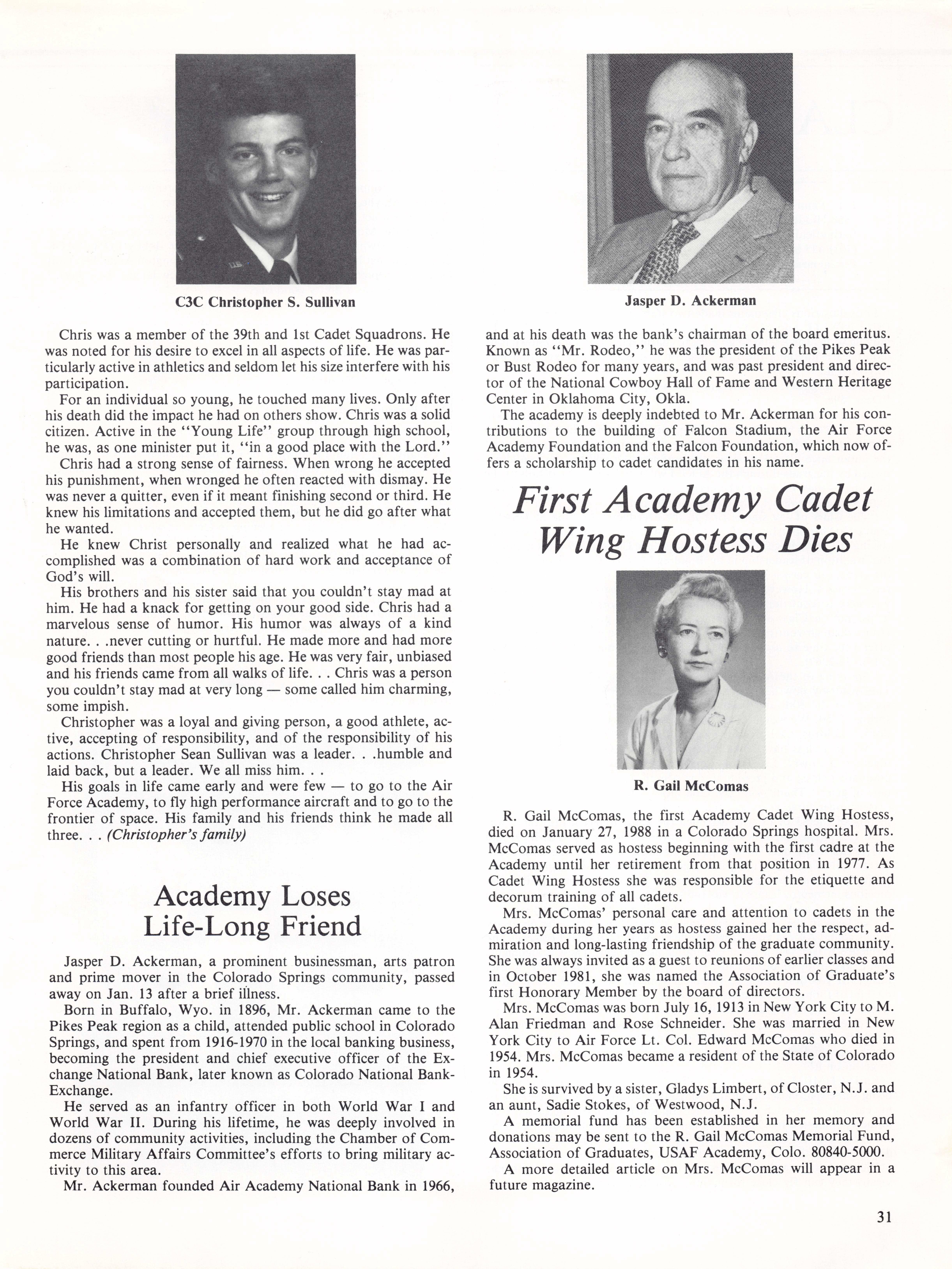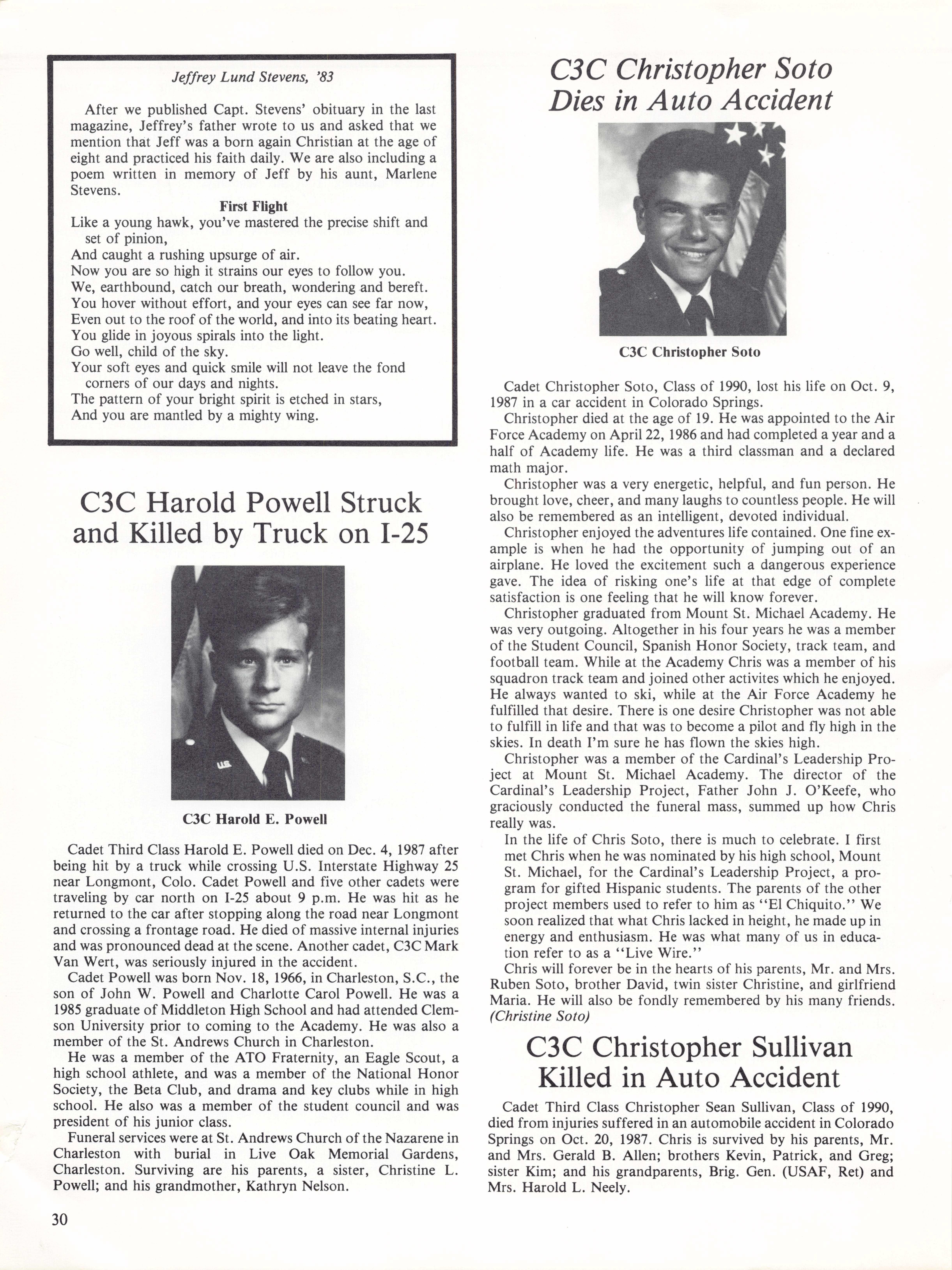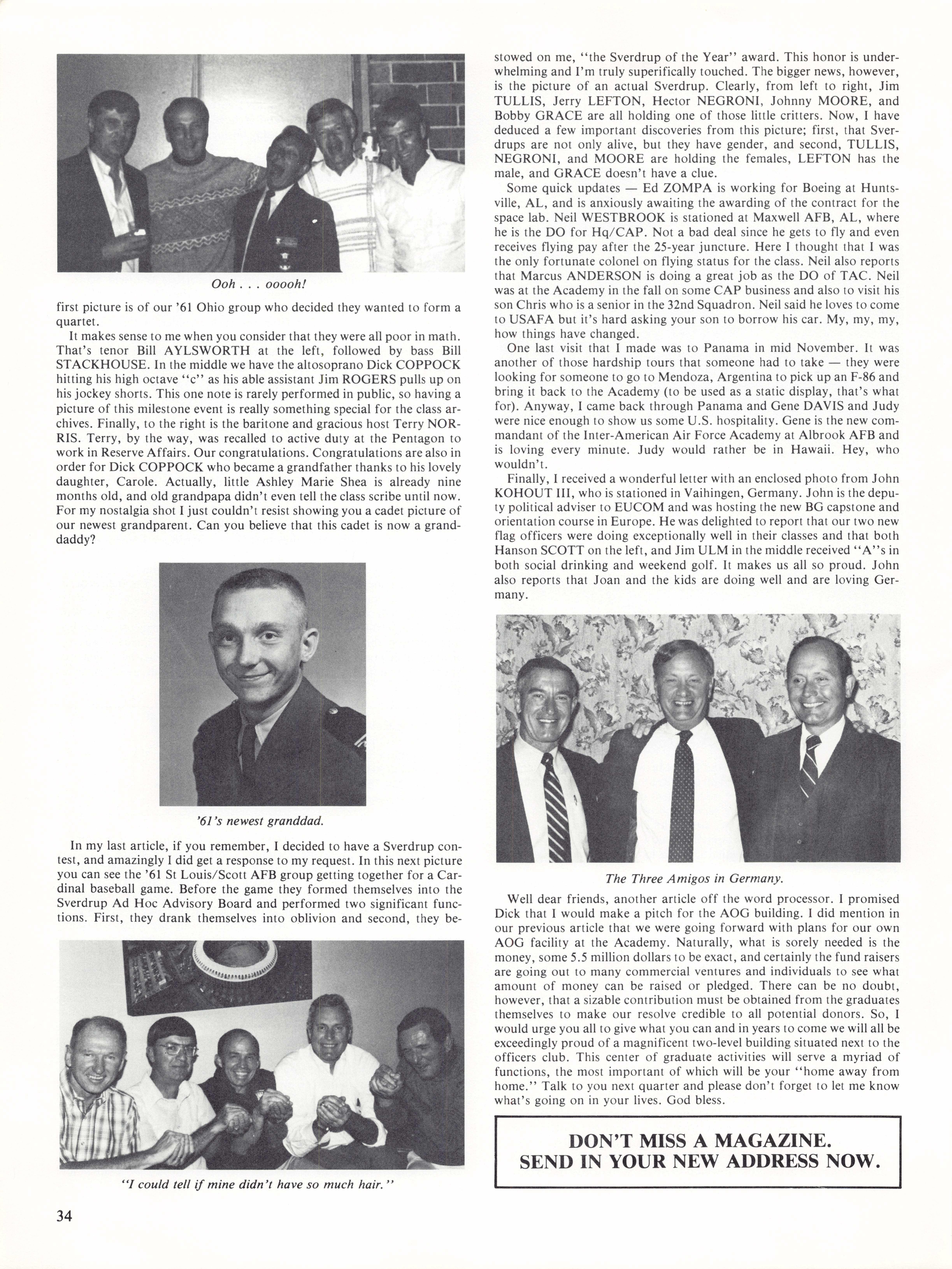 Usually, the column following the football season is fi lled with names and happenings which resulted from events connected with the games. This column will differ only in that several others items are worthy of note. To start with, like arecent column, let me bring up another name from the past. Does the name Dave Ullery ring any bells with anyone? Well it didn’t for me until one evening in October when Itook aphone call from him. As memory returned, 1did recall Dave as aclassmate who entered with us in 1956 and left our class after our time at Lowry. He was the guy who resigned his commission as aSAC navigator to share all that fun with us. You may recall that he was assigned to 4th Squadron and easily recognizable since he was the only classmate wearing nav wings on his cadet uniform. Dave now lives in Abington, PA and is doing well in the personnel business. Should any of you want to touch base with him, his phone is (215) 885-8753.