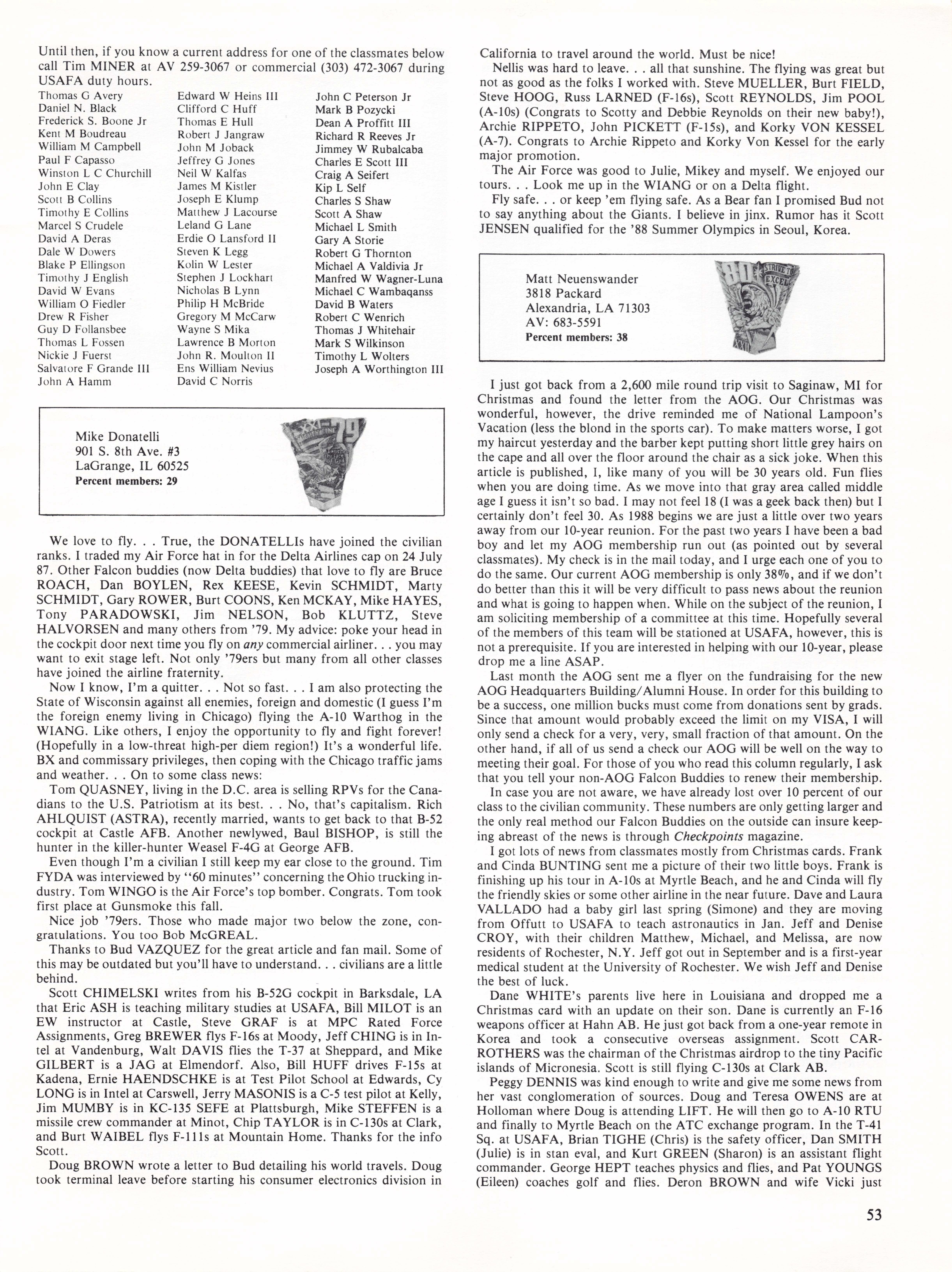 Mike’s letter continues with more news about Willy UPT class 87-08. “As for me, the year has been quite interesting. Iwas married on 9Aug 86, and on 3Jul 87, Gina and 1were blessed with ababy girl, Whitney. We are off to McGuire for afew years in the C-141. As for my classmates, Steve TANNER and Chuck WANEBO are flying the Eagle in Kadena and Bilburg. Harry RONSNAN —A-10 to Eielson. Ward TAYLOR, Steve SYMONS, Steve SCHLUMPBERGER and Mike LOGRANDE are in the mighty Tweet; Mark SCHIEVE and Bill TUBB will be staying at Willy in the T-38; Dave ALVIN —C-12 to Germany; Scott CIERNIA and Jim MCDONOUGH are on the west coast and Paci fi c in ’141s; Seth BEAUBIAN —KC-135 to Wurtsmith; Kathy HOEFT —KC-135 to Castle; Bob COLELLA —B-52 to Wurtsmith; and Mike DAVIS is flying the mighty Buffasaurus out of Blytheville. That’s all for now. Take care, fly safe, and keep in touch.”