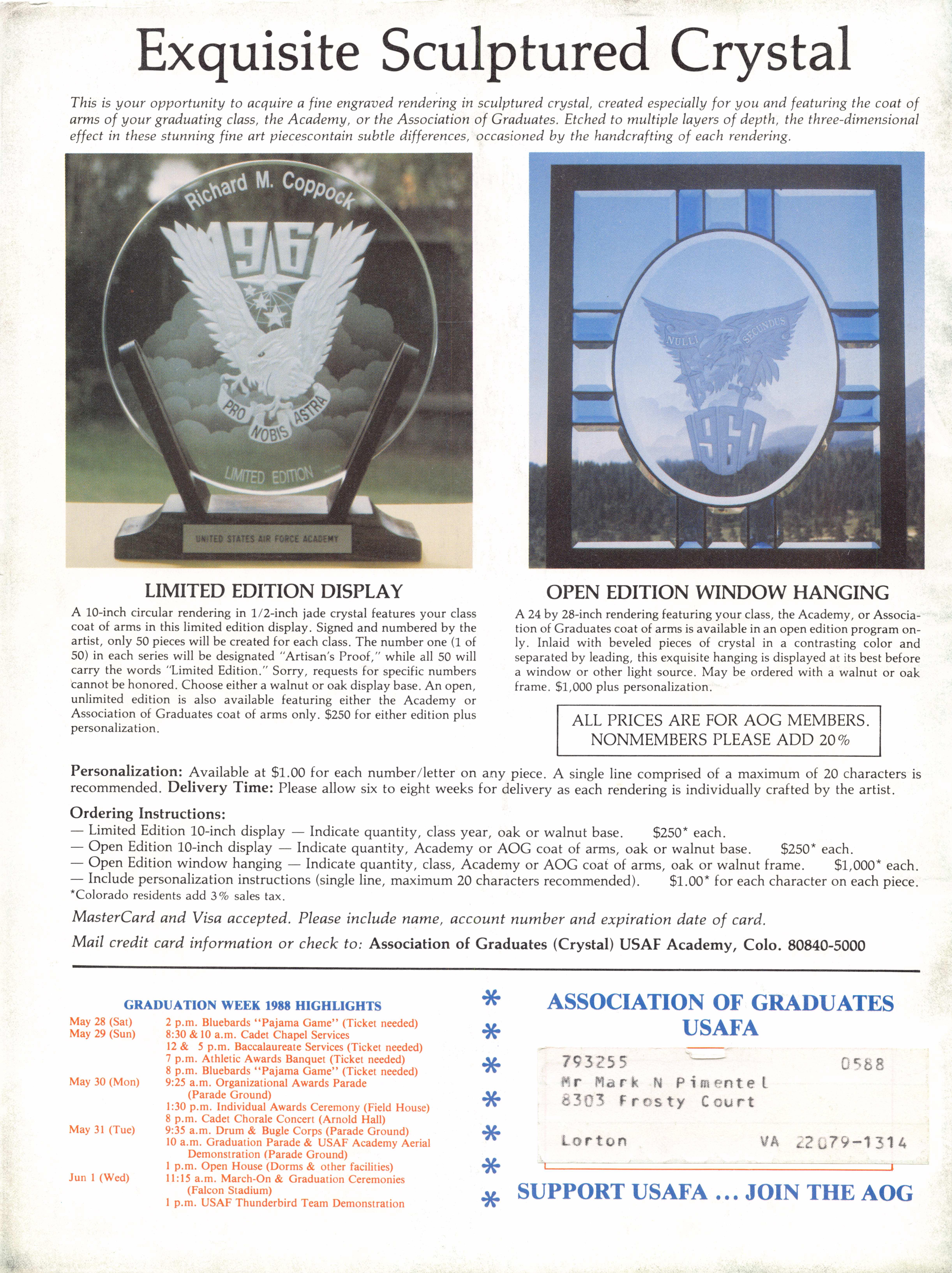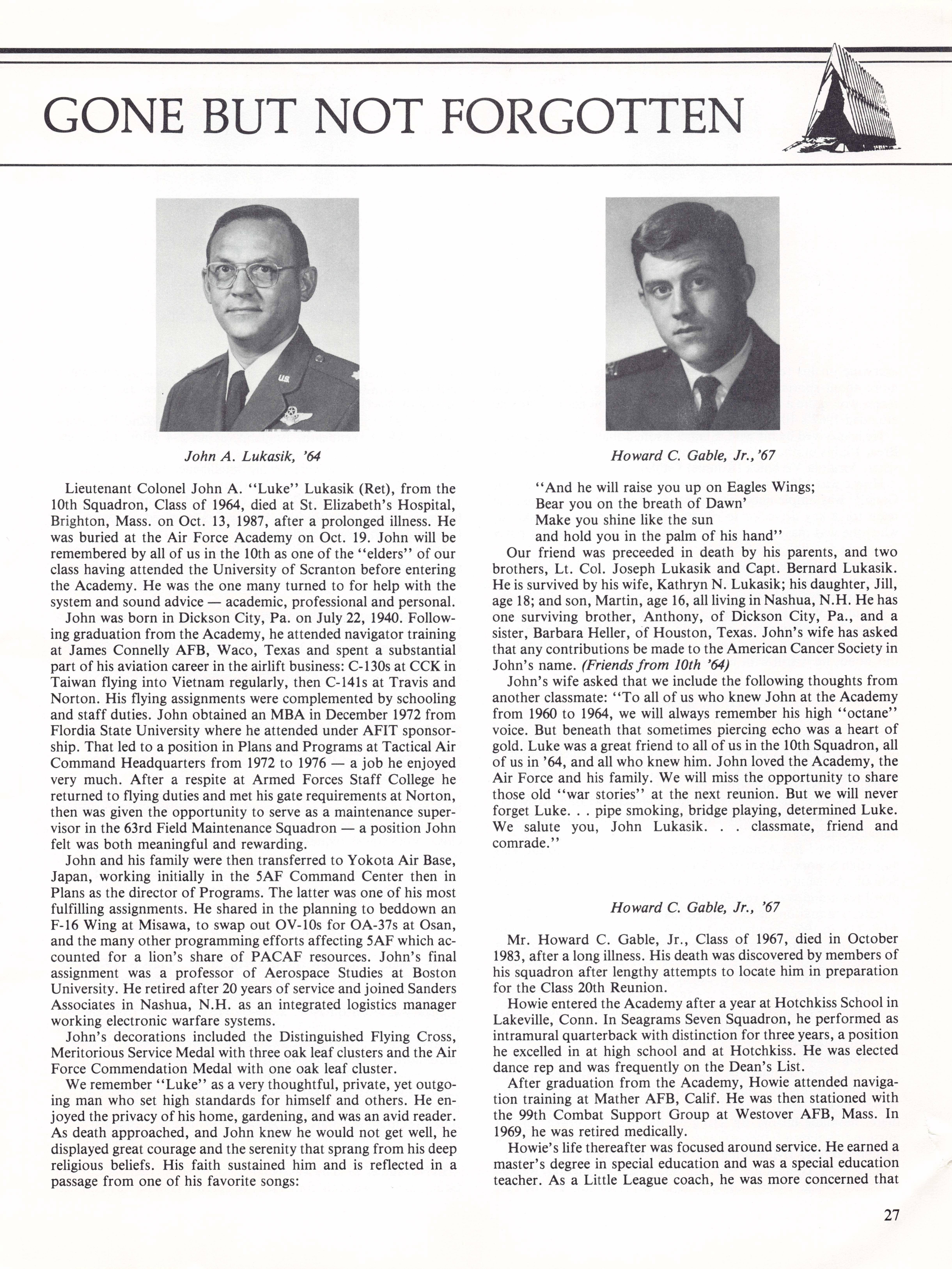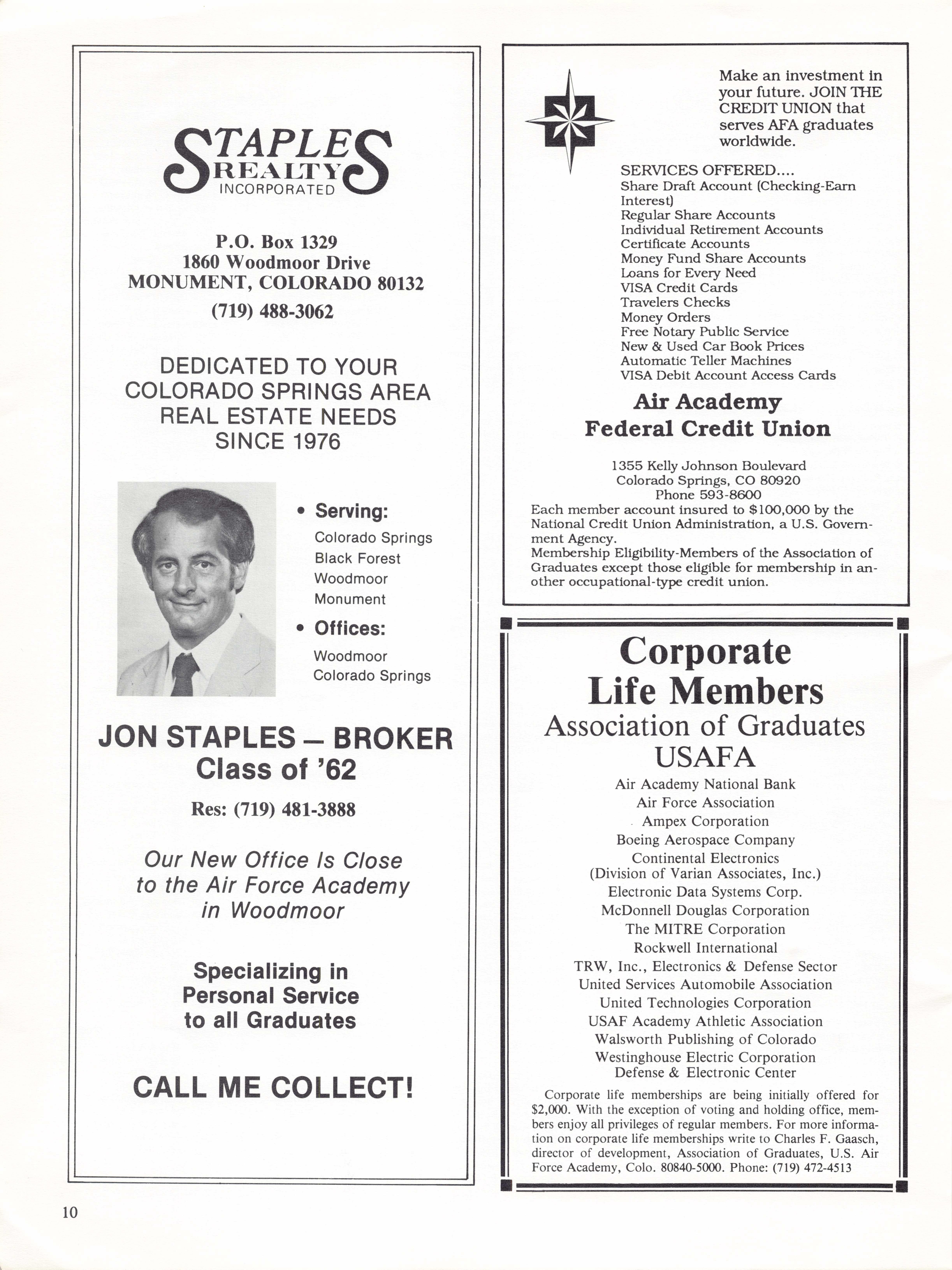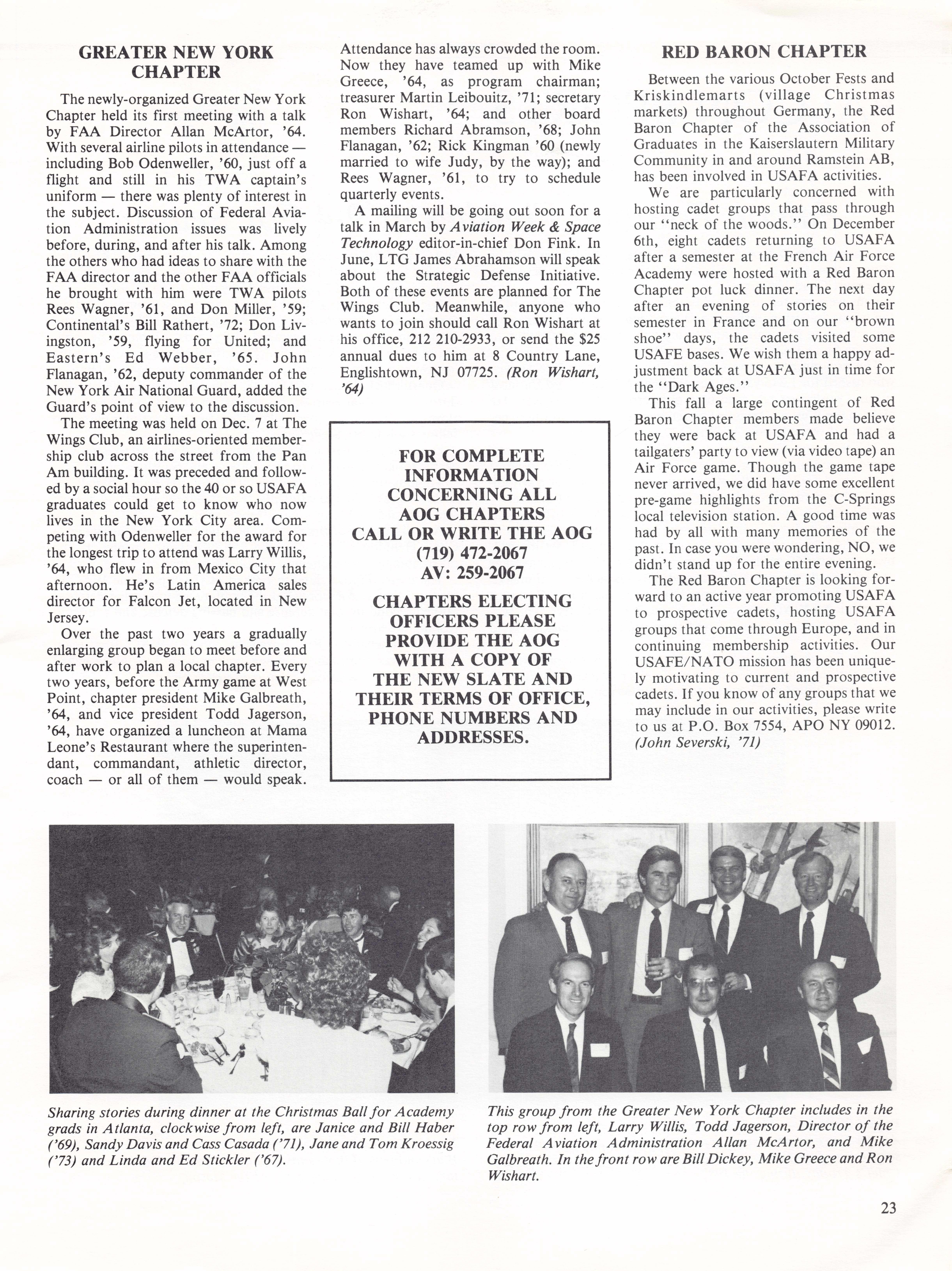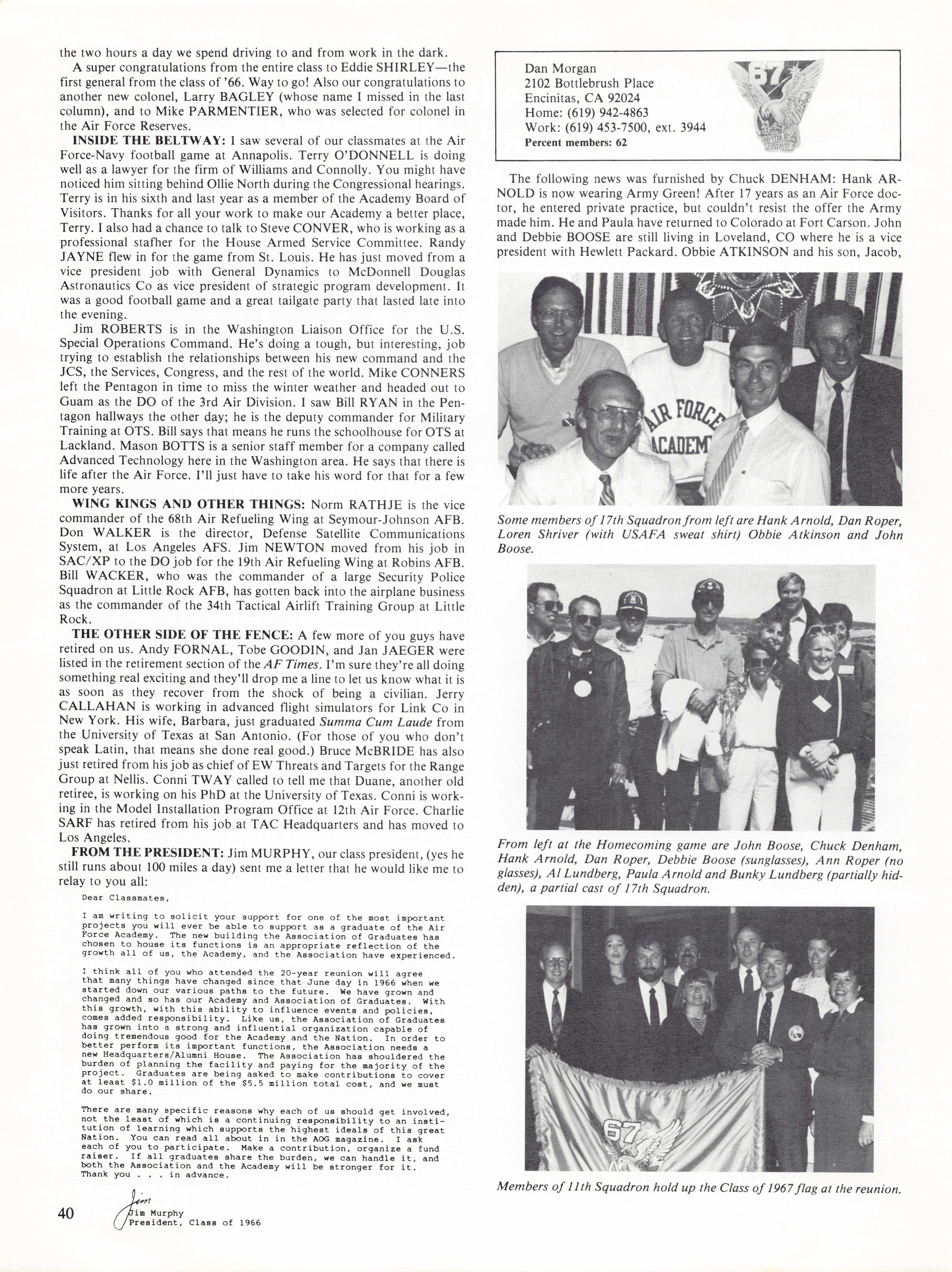 “Speaking of the AOG, we have our 30th reunion coming up in ’89. The Academy now has apolicy setting aside aReunion weekend every spring for the 30th and following reunions, so our 30th will be in tbe spring of ’89. We would like to hear from you with your ideas, sugges¬ tions, and ideas. Call or write to any of the class officers.